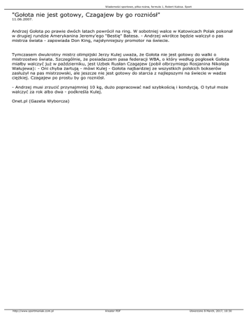 Wiadomości sportowe, piłka nożna, formuła 1, Robert Kubica. Sport "Gołota nie jest gotowy, Czagajew by go rozniósł" 11.06.2007. Andrzej Gołota po prawie dwóch latach powrócił na ring. W sobotniej walce w Katowicach Polak pokonał w drugiej rundzie Amerykanina Jeremy'ego "Bestię" Batesa. - Andrzej wkrótce będzie walczył o pas mistrza świata - zapowiada Don King, najsłynniejszy promotor na świecie. Tymczasem dwukrotny mistrz olimpijski Jerzy Kulej uważa, że Gołota nie jest gotowy do walki o mistrzostwo świata. Szczególnie, że posiadaczem pasa federacji WBA, o który według pogłosek Gołota miałby walczyć już w październiku, jest Uzbek Rusłan Czagajew (pobił olbrzymiego Rosjanina Nikołaja Wałujewa): - Oni chyba żartują - mówi Kulej - Gołota najbardziej ze wszystkich polskich bokserów zasłużył na pas mistrzowski, ale jeszcze nie jest gotowy do starcia z najlepszymi na świecie w wadze ciężkiej. Czagajew po prostu by go rozniósł. - Andrzej musi zrzucić przynajmniej 10 kg, dużo popracować nad szybkością i kondycją. O tytuł może walczyć za rok albo dwa - podkreśla Kulej. Onet.pl (Gazeta Wyborcza) http://www.sportmaniak.com.pl Kreator PDF Utworzono 8 March, 2017, 10:30
