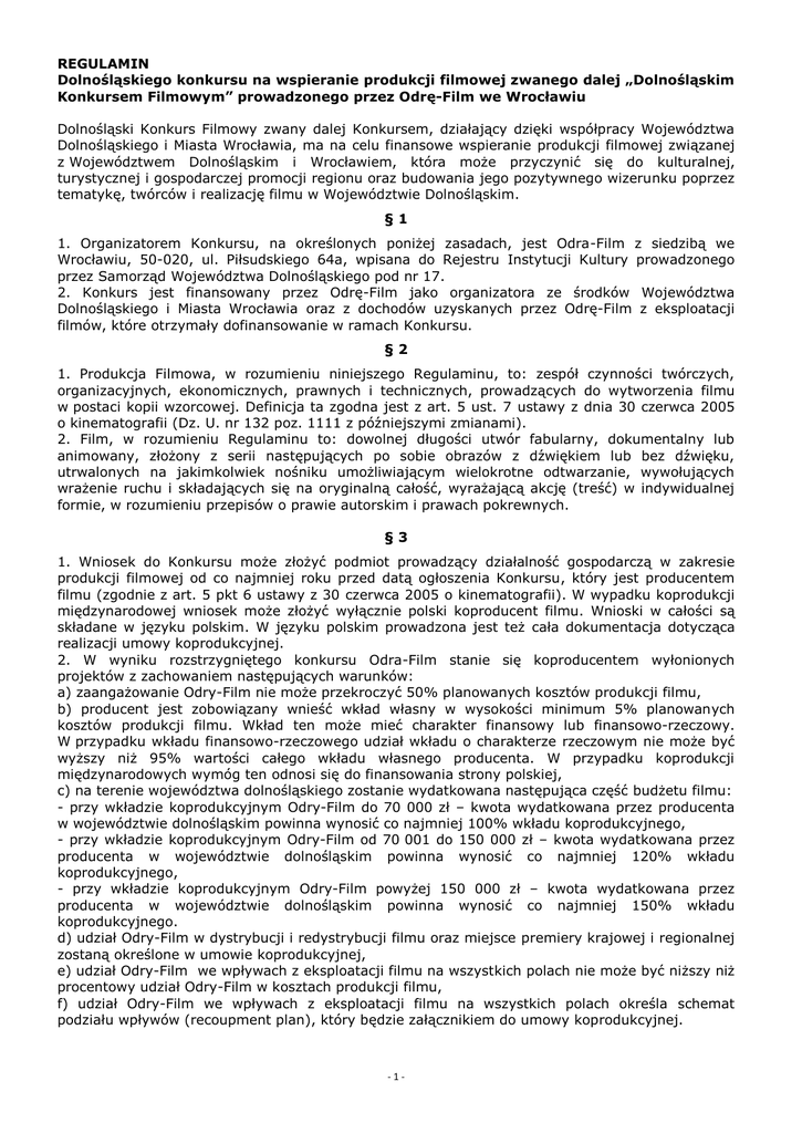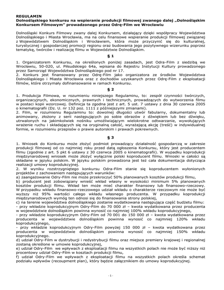REGULAMIN Dolnośląskiego konkursu na wspieranie produkcji filmowej zwanego dalej „Dolnośląskim Konkursem Filmowym” prowadzonego przez Odrę-Film we Wrocławiu Dolnośląski Konkurs Filmowy zwany dalej Konkursem, działający dzięki współpracy Województwa Dolnośląskiego i Miasta Wrocławia, ma na celu finansowe wspieranie produkcji filmowej związanej z Województwem Dolnośląskim i Wrocławiem, która może przyczynić się do kulturalnej, turystycznej i gospodarczej promocji regionu oraz budowania jego pozytywnego wizerunku poprzez tematykę, twórców i realizację filmu w Województwie Dolnośląskim. §1 1. Organizatorem Konkursu, na określonych poniżej zasadach, jest Odra-Film z siedzibą we Wrocławiu, 50-020, ul. Piłsudskiego 64a, wpisana do Rejestru Instytucji Kultury prowadzonego przez Samorząd Województwa Dolnośląskiego pod nr 17. 2. Konkurs jest finansowany przez Odrę-Film jako organizatora ze środków Województwa Dolnośląskiego i Miasta Wrocławia oraz z dochodów uzyskanych przez Odrę-Film z eksploatacji filmów, które otrzymały dofinansowanie w ramach Konkursu. §2 1. Produkcja Filmowa, w rozumieniu niniejszego Regulaminu, to: zespół czynności twórczych, organizacyjnych, ekonomicznych, prawnych i technicznych, prowadzących do wytworzenia filmu w postaci kopii wzorcowej. Definicja ta zgodna jest z art. 5 ust. 7 ustawy z dnia 30 czerwca 2005 o kinematografii (Dz. U. nr 132 poz. 1111 z późniejszymi zmianami). 2. Film, w rozumieniu Regulaminu to: dowolnej długości utwór fabularny, dokumentalny lub animowany, złożony z serii następujących po sobie obrazów z dźwiękiem lub bez dźwięku, utrwalonych na jakimkolwiek nośniku umożliwiającym wielokrotne odtwarzanie, wywołujących wrażenie ruchu i składających się na oryginalną całość, wyrażającą akcję (treść) w indywidualnej formie, w rozumieniu przepisów o prawie autorskim i prawach pokrewnych. §3 1. Wniosek do Konkursu może złożyć podmiot prowadzący działalność gospodarczą w zakresie produkcji filmowej od co najmniej roku przed datą ogłoszenia Konkursu, który jest producentem filmu (zgodnie z art. 5 pkt 6 ustawy z 30 czerwca 2005 o kinematografii). W wypadku koprodukcji międzynarodowej wniosek może złożyć wyłącznie polski koproducent filmu. Wnioski w całości są składane w języku polskim. W języku polskim prowadzona jest też cała dokumentacja dotycząca realizacji umowy koprodukcyjnej. 2. W wyniku rozstrzygniętego konkursu Odra-Film stanie się koproducentem wyłonionych projektów z zachowaniem następujących warunków: a) zaangażowanie Odry-Film nie może przekroczyć 50% planowanych kosztów produkcji filmu, b) producent jest zobowiązany wnieść wkład własny w wysokości minimum 5% planowanych kosztów produkcji filmu. Wkład ten może mieć charakter finansowy lub finansowo-rzeczowy. W przypadku wkładu finansowo-rzeczowego udział wkładu o charakterze rzeczowym nie może być wyższy niż 95% wartości całego wkładu własnego producenta. W przypadku koprodukcji międzynarodowych wymóg ten odnosi się do finansowania strony polskiej, c) na terenie województwa dolnośląskiego zostanie wydatkowana następująca część budżetu filmu: - przy wkładzie koprodukcyjnym Odry-Film do 70 000 zł – kwota wydatkowana przez producenta w województwie dolnośląskim powinna wynosić co najmniej 100% wkładu koprodukcyjnego, - przy wkładzie koprodukcyjnym Odry-Film od 70 001 do 150 000 zł – kwota wydatkowana przez producenta w województwie dolnośląskim powinna wynosić co najmniej 120% wkładu koprodukcyjnego, - przy wkładzie koprodukcyjnym Odry-Film powyżej 150 000 zł – kwota wydatkowana przez producenta w województwie dolnośląskim powinna wynosić co najmniej 150% wkładu koprodukcyjnego. d) udział Odry-Film w dystrybucji i redystrybucji filmu oraz miejsce premiery krajowej i regionalnej zostaną określone w umowie koprodukcyjnej, e) udział Odry-Film we wpływach z eksploatacji filmu na wszystkich polach nie może być niższy niż procentowy udział Odry-Film w kosztach produkcji filmu, f) udział Odry-Film we wpływach z eksploatacji filmu na wszystkich polach określa schemat podziału wpływów (recoupment plan), który będzie załącznikiem do umowy koprodukcyjnej. -1- Regulamin Dolnośląskiego Konkursu Filmowego prowadzonego przez Odrę-Film we Wrocławiu §4 1. Wnioski składane do konkursu oceniane są w trzech etapach. 2. W pierwszym etapie Odra-Film dokonuje oceny formalnej zgłoszonych wniosków. 3. W drugim etapie projekty konkursowe oceniają eksperci wyznaczeni przez Komisję Konkursową, o której mowa w par. 7. 4. Do trzeciego etapu kwalifikują się wnioski, które otrzymały średnią arytmetyczną ocen ekspertów powyżej 43 punktów dla filmu fabularnego, 40 punktów dla filmu dokumentalnego i 43 punktów dla filmu animowanego. W trzecim etapie Komisja Konkursowa rozstrzyga o przyznaniu zakwalifikowanym filmom kwot na koprodukcję. §5 1. Wnioski na każdą edycję Konkursu, sporządzone według aktualnego wzoru wraz z obowiązującymi załącznikami, składane są w siedzibie Odry-Film przy ul. Piłsudskiego 64a we Wrocławiu. Aktualny formularz wniosku udostępnia się na stronie internetowej Odry-Film: www.odra-film.wroc.pl, na stronie Wroclaw Film Commission: www.wroclawfilmcommission.pl oraz w siedzibie Odry-Film. Formularz wniosku stanowi załącznik nr 1 do niniejszego Regulaminu. 2. Wnioski wymienione w punkcie 1 należy składać w terminach określonych w ogłoszeniu Konkursu. Za termin złożenia wniosku uważa się datę jego wpływu do Odry-Film. 3. W przypadku stwierdzenia uchybień formalnych wnioskodawca wzywany jest do ich usunięcia w ciągu 7 dni od daty otrzymania pisemnego wezwania. Nie usunięcie uchybień w terminie powoduje odrzucenie wniosku. 4. Producent może złożyć tylko jeden wniosek w jednej edycji konkursu. 5. Nie mogą być składane wnioski dotyczące filmó