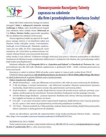 Mamy dla Ciebie wydarzenie, którego nie możesz przegapić! Jeden z najlepszych trenerów rozwoju osobistego w Polsce, autor bestsellerowych książek oraz szkolenia, które zyskało miano Motywacji nr 1 w Polsce, Mariusz Szuba, poprowadzi specjalnie dla nas ekskluzywne szkolenie motywacyjne. Naszej organizacji udało się zaprosić do współpracy samego mistrza w tej dziedzinie jakim jest Mariusz Szuba (oficjalne strony: www.mariuszszuba.pl, www.123teraz.pl). Szkolenie zaadresowane jest nie tylko do firm wspierających nasze inicjatywy, ale i tych które są zainteresowane rozwojem własnej branży oraz poszerzenia horyzontalnej wiedzy w tym zakresie. Unikatowe strategie motywacji oraz pracy z własnym potencjałem to absolutny fundament do błyskawicznego zwiększania efektywności i wydajności tak własnej, jak i prowadzonego mikro bądź makro przedsiębiorstwa. Szkolenie odbędzie się 27 listopada 2011r w ,,Zajeździe pod Dębem” w Chroślach ul. Żwirowa 14c i jest przewidziane max dla 100 osób. Szkolenie zaplanowano w godzinach 10:00 – 16:00, z dwiema przerwami na kawę oraz lunch. Inwestycja w całość to jedynie 300zł od osoby, a przy zapisie 4 i więcej osób z jednej firmy 250 zł! UWAGA! Nasza organizacja cały dochód przeznacza na otwarcie w 2012r klubu piłkarskiego dla dzieci ze szkół podstawowych w gminie Halinów oraz z terenu powiatu. Zakres tematyczny szkolenia: Model komunikacji – czyli, jak odbieramy rzeczywistość i jak rodzi się nasza motywacja do działania; 3 siły decydujące o naszym nastawieniu – jak efektywnie zarządzać własnym nastawieniem (poznasz mechanikę, dzięki której zaczniesz zarażać siłą, optymizmem i pewnością siebie). Strefa komfortu – odkryjesz zasady, dzięki którym ruszysz do przodu jeszcze szybciej i pewniej, a pożądane wyniki pojawią się natychmiast. Poznasz absolutny fundament szeroko pojętego rozwoju; 4 Kroki Skutecznego działania – poznasz tajemnice działania tych, którzy odnoszą największe sukcesy, bez względu na branżę czy miejsce na ziemi; Cel: pal! – w tej części otrzymasz zestaw najnowszych inspiracji, dzięki którym nieco inaczej spojrzysz na cel, a praca z nim stanie się przyjemnością zwieńczoną pożądanym wynikiem; 123 Teraz – Mariusz podzieli się z Tobą autorską i szalenie skuteczną techniką, dzięki której potencjalne obawy zamienisz w pełną gotowość do działania. • • • • • • Zanim się zdecydujesz, sprawdź jak niepowtarzalnie swoją wiedzę przekazuje Mariusz Szuba - obejrzyj film: http://www.youtube.com/user/mariuszszuba#p/u/10/lPmNPX1CYco REZERWACJA DLA CIEBIE: Osoby zainteresowane prosimy o pilny kontakt telefoniczny 505 456 133 lub mailowy [email protected] do dnia 27 października 2011 r., celem rezerwacji miejsc. Nasza organizacja Stowarzyszenie Rozwijamy Talenty powstała w 2007r w gminie Halinów podczas zorganizowanej imprezy otwarcia boisk w Długiej Kościelnej. Przez 4 lata cyklicznie organizowaliśmy zawody, turnieje czy imprezy na rzecz gminy Halinów czy powiatu mińskiego (szczegółowa charakterystyka na www.rozwijamytalenty.org). Jesteśmy organizacją NON PROFIT, tzn. że wszelkie pozyskane środki przeznaczane są na cele charytatywne objęte statutem. Jesteśmy zarejestrowani w Krajowym Rejestrze Sądowym i posiadamy osobowość prawną. Pozyskaliśmy i rozliczyliśmy wiele dotacji z powiatu mińskiego oraz naszej gminy. Prowadziliśmy współpracę z wieloma firmami z naszej gminy czy z Sulejówka oferując reklamę czy promocję przedsiębiorstw tj. BANK SPÓŁDZIELCZY, MEGMA, MBM, KORTBUD, PIEKARNIA KRUPA, GS SCH HALINÓW, ŚLIMAK FOOD SERVICE, TAURUS, WARSZTATY SAMOCHODOWE SŁAWOMIRA PAZIO, MIECZYSŁAWA SMOCZYŃSKIEGO I RYSZARDA MATUSZEWSKIEGO, SEBO, RESTAURACJA DĘBIANKA, STALBUD II, EUROBUD, INTERTRADE, MLPN, SKLEPY DARIUSZA LORENTA, BAKIERY, DRANICKICH, ADAMA RUDNICKIEGO, ,,EMILKA”. Jesteśmy rozpoznawalną i wiarygodną organizacją na skalę powiatu. Nasze inicjatywy wpierali i odwiedzali sławy sportu takie jak Andrzej Supron czy Andrzej Gmitruk, a także zwycięzca edycji programu MAM TALENT Krzysztof Golonka. Ostatnimi czasy skoncentrowaliśmy swoją działalność na szkółce piłkarskiej dla dzieci, która została zainicjowana w 2009r. Przez ten czas wiele nabraliśmy doświadczenia i właściwych przekonań, że warto poświęcić czas najmłodszym. Nawiązaliśmy właściwą współpracę z władzami gminy Halinów, dlatego chcemy otworzyć w 2012 r. sportowy klub związkowy. Do dyspozycji mamy masę obiektów sportowych – boiska w Długiej Kościelnej (jedno pełnowymiarowe), boiska treningowe w Cisiu, Michałowie, Halinowie, Długiej Szlacheckiej, w 2012r powstanie prawdopodobnie także i w Okuniewie, natomiast w sezonie zimowym halę sportową w Halinowie czy sale gimnastyczne w szkołach w Brzezinach i Okuniewie. W czerwcu br. przeprowadziliśmy nabór do szkółki piłkarskiej, podczas którego zauważyliśmy zaangażowanie i chęć dzieci do tego aby stworzyć im warunki do rozwoju swoich marzeń i pasji. Aby przedstawione przedsięwzięcie mogło wystartować poza współpracą z urzędem gminy i Radą Rodziców dzieci uczestniczących w szkółce piłkarskiej, nieodłączna jest współpraca z firmami i zainteresowanymi osobami z terenu naszej gminy. Zapraszamy do odwiedzenia naszej nowej strony internetowej www.rozwijamytalenty.org, na której znajdą Państwo wszystkie niezbędne informacje. Zarząd Stowarzyszenia Rozwijamy Talenty Piotr Wieczorek