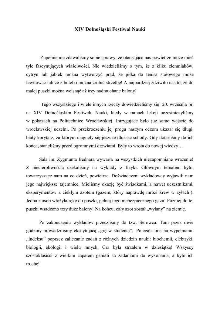 XIV Dolnośląski Festiwal Nauki Zupełnie nie zdawaliśmy sobie sprawy, że otaczające nas powietrze może mieć tyle fascynujących właściwości. Nie wiedzieliśmy o tym, że z kilku ziemniaków, cytryn lub jabłek można wytworzyć prąd, że piłka do tenisa stołowego może lewitować lub że z butelki można zrobić strzelbę! A najbardziej zdziwiło nas to, że do małej puszki można wcisnąć aż trzy nadmuchane balony! Tego wszystkiego i wiele innych rzeczy dowiedzieliśmy się 20. września br. na XIV Dolnośląskim Festiwalu Nauki, kiedy w ramach lekcji uczestniczyliśmy w pokazach na Politechnice Wrocławskiej. Intrygujące było już samo wejście do wrocławskiej uczelni. Po przekroczeniu jej progu naszym oczom ukazał się długi, biały korytarz, za którym ciągnęły się jeszcze dłuższe schody. Gdy dotarliśmy do ich końca, stanęliśmy przed ogromnymi drzwiami. Były to wrota do nowej wiedzy… Sala im. Zygmunta Bednara wywarła na wszystkich niezapomniane wrażenie! Z niecierpliwością czekaliśmy na wykłady z fizyki. Głównym tematem było, towarzyszące nam na co dzień, powietrze. Doświadczeni wykładowcy wyjawili nam jego największe tajemnice. Mieliśmy okazję być świadkami, a nawet uczestnikami, eksperymentów z ciekłym azotem (gazem, który naprawdę mrozi krew w żyłach!). Jedna z osób włożyła rękę do puszki, pełnej tego niebezpiecznego gazu! Później do tej puszki wsadzono trzy duże balony! Na końcu, cały azot został „wylany” na ziemię. Po zakończeniu wykładów przeszliśmy do tzw. Serowca. Tam przez dwie godziny prowadziliśmy ekscytującą „grę w studenta”. Polegała ona na wypełnianiu ,,indeksu” poprzez zaliczanie zadań z różnych dziedzin nauki: biochemii, elektryki, biologii, ekologii i wielu innych. Gra była strzałem w dziesiątkę! Wszyscy szóstoklasiści z wielkim zapałem ganiali za zadaniami do wykonania, a było ich trochę! Jednym z nich była wspinaczka na nachyloną do przodu ściankę. Kolejne dotyczyły ornitologii i polegały na rozpoznawaniu ptaków po ich głosach. Następnie podczas doświadczeń z chemii mieliśmy okazję pomieszać sodę z cukrem. Później, jako adepci ekologii, sortowaliśmy odpady. Nasza grupa wykonała wszystkie zadania na studencką czwórkę z plusem. Każde z nich było wymyślone tak, by się pobawić i jednocześnie czegoś nauczyć lub utrwalić pewne rzeczy. Przy niektórych stanowiskach z zadaniami kolejki były tak duże, że – chcąc nie chcąc – musieliśmy odpuścić stanie w nich. Mimo tego każdy znalazł coś dla siebie. Wielbiciele przyrody mogli powrócić do natury, słuchając śpiewu ptaków przez słuchawki. Ci, którym nie brak werwy, wykazywali się w wyścigu łódek, jeździe samochodem zasilanym baterią słoneczną, wspinaczką lub zjazdem na linie. Inni zaś zaspokajali swoją ciekawość, wykonując chemiczne doświadczenia i poznając prawa fizyczne otaczającego nas świata. To dla nich właśnie odbyły się pokazy wytwarzania prądu. Dodatkowo każda z grup po zaliczeniu minimalnie dziewięciu zadań mogła zakręcić małym i bardzo kolorowym kołem fortuny i wygrać fajny upominek. Najciekawsze według nas okazały się jednak projekty ekologicznych rozwiązań, które mają znaleźć zastosowanie we Wrocławiu. Są to wyjątkowe pomysły, dające nadzieję na to, że jeśli będziemy żyć zgodnie z zasadami ekologii, nasz świat zmieni się na lepsze. Te właśnie projekty najdokładniej odzwierciedlały tegoroczne hasło Festiwalu „Nauka kluczem do Natury”. Wycieczka na Festiwal była bardzo pouczająca, ciekawa i rozrywkowa. Pokazano nam, że uczyć się można również poprzez zabawę. Taka forma nauki bardzo nam się podobała, wynieśliśmy z niej bardzo dużo wiedzy. Z niecierpliwością będziemy czekać na następny Festiwal! Autorzy: Rafał Hydzik- klasa 6a- SP im. Bolesława Krzywoustego w Kamieńcu Wrocławskimul. Kolejowa 4, 55-002 Kamieniec Wrocławski, [email protected] Paula Jochimiak- klasa 6a- SP im. Bolesława Krzywoustego w Kamieńcu Wrocławskim- ul. Kolejowa 4, 55-002 Kamieniec Wrocławski, [email protected] Kamieniec Wrocławski, dn. 27.10.2011