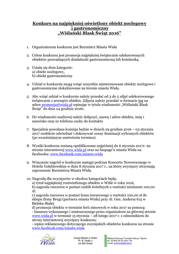 Konkurs na najpiękniej oświetlony obiekt noclegowy i gastronomiczny „Wiślański Blask Świąt 2016” 1. Organizatorem konkursu jest Burmistrz Miasta Wisła 2. Celem konkursu jest promocja najpiękniej świątecznie udekorowanych obiektów prowadzących działalność gastronomiczną lub hotelarską. 3. Ustala się dwie kategorie: a) obiekt noclegowy, b) obiekt gastronomiczny 4. Udział w konkursie mogą wziąć wszystkie zainteresowane obiekty noclegowe i gastronomiczne zlokalizowane na terenie miasta Wisła. 5. Aby wziąć udział w konkursie należy przesłać od 3 do 5 zdjęć udekorowanego świątecznie z zewnątrz obiektu. Zdjęcia należy przesłać w formacie jpg na adres [email protected] wpisując w tytule wiadomości „Wiślański Blask Świąt” do dnia 24 grudnia 2016r. 6. Do wiadomości mailowej należy dołączyć, nazwę i adres obiektu, imię i nazwisko oraz nr telefonu osoby do kontaktu 7. Specjalnie powołana komisja będzie w dniach 29 grudnia 2016 – 03 stycznia 2017 osobiście odwiedzać i dokonywać oceny iluminacji wybranych obiektów (po wcześniejszym umówieniu terminu). 8. Wyniki konkursu zostaną opublikowane najpóźniej do 6 stycznia 2017r. na stronie internetowej www.wisla.pl oraz na fanpage’u miasta Wisła na facebooku: www.facebook.com/miasto.wisla 9. Wręczenie nagród w konkursie nastąpi podczas Koncertu Noworocznego w Hotelu Gołębiewskim w dniu 8 stycznia 2017 r., na który zwycięzcy otrzymają zaproszenie Burmistrza Miasta Wisła. 10. Nagrodą dla zwycięzców w obydwu kategoriach będą: a) tytuł najpiękniej rozświetlonego obiektu w Wiśle w roku 2016, b) nagroda rzeczowa w postaci ozdób świetlnych o wartości minimum 100,00 zł; c) nagroda rzeczowa w postaci bonu towarowego o wartości 100,00 zł do sklepu firmy Brugi (partnera miasta Wisła) przy Al. Gen. Andersa 615 w Bielsku-Białej d) promocja obiektu w terminie ferii zimowych w roku 2017 za pomocą: - banneru wykonanego i umieszczonego przez organizatora na głównej stronie www.wisla.pl w terminie 15 stycznia – 28 lutego 2017 r. z odnośnikiem do strony internetowej zwycięzcy konkursu; - wpisu reklamowego dotyczącego zwycięskich obiektów konkursu na stronie www.facebook.com/miasto.wisla Urząd Miejski w Wiśle Pl. B. Hoffa 3 43-460 Wisła Referat Promocji Turystyki Kultury i Sportu tel. 33-855-24-25 wew.124 e-mail: [email protected] 11. Wysyłając zdjęcia obiektu wysyłający automatycznie akceptuje niniejszy regulamin i wyraża zgodę na ich publikację przez organizatora konkursu na stronach internetowych i w materiałach promocyjno-informacyjnych. 12. Organizator zastrzega sobie prawo nie rozstrzygnięcia konkursu. Urząd Miejski w Wiśle Pl. B. Hoffa 3 43-460 Wisła Referat Promocji Turystyki Kultury i Sportu tel. 33-855-24-25 wew.124 e-mail: [email protected]