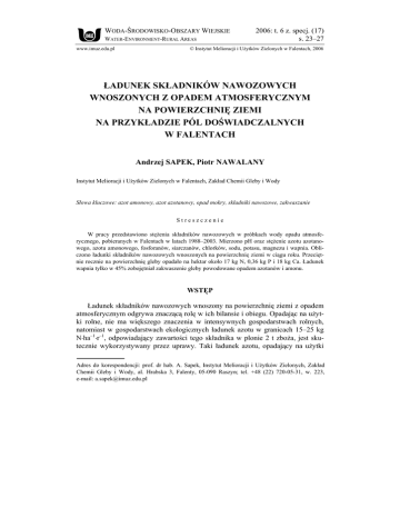 WODA-ŚRODOWISKO-OBSZARY WIEJSKIE WATER-ENVIRONMENT-RURAL AREAS www.imuz.edu.pl 2006: t. 6 z. specj. (17) s. 23–27 © Instytut Melioracji i Użytków Zielonych w Falentach, 2006 ŁADUNEK SKŁADNIKÓW NAWOZOWYCH WNOSZONYCH Z OPADEM ATMOSFERYCZNYM NA POWIERZCHNIĘ ZIEMI NA PRZYKŁADZIE PÓL DOŚWIADCZALNYCH W FALENTACH Andrzej SAPEK, Piotr NAWALANY Instytut Melioracji i Użytków Zielonych w Falentach, Zakład Chemii Gleby i Wody Słowa kluczowe: azot amonowy, azot azotanowy, opad mokry, składniki nawozowe, zakwaszanie Streszczenie W pracy przedstawiono stężenia składników nawozowych w próbkach wody opadu atmosferycznego, pobieranych w Falentach w latach 1988–2003. Mierzono pH oraz stężenie azotu azotanowego, azotu amonowego, fosforanów, siarczanów, chlorków, sodu, potasu, magnezu i wapnia. Obliczono ładunki składników nawozowych wnoszonych na powierzchnię ziemi w ciągu roku. Przeciętnie rocznie na powierzchnię gleby opadało na hektar około 17 kg N, 0,36 kg P i 18 kg Ca. Ładunek wapnia tylko w 45% zobojętniał zakwaszenie gleby powodowane opadem azotanów i amonu. WSTĘP Ładunek składników nawozowych wnoszony na powierzchnię ziemi z opadem atmosferycznym odgrywa znaczącą rolę w ich bilansie i obiegu. Opadając na użytki rolne, nie ma większego znaczenia w intensywnych gospodarstwach rolnych, natomiast w gospodarstwach ekologicznych ładunek azotu w granicach 15–25 kg N⋅ha–1⋅r–1, odpowiadający zawartości tego składnika w plonie 2 t zboża, jest skutecznie wykorzystywany przez uprawy. Taki ładunek azotu, opadający na użytki Adres do korespondencji: prof. dr hab. A. Sapek, Instytut Melioracji i Użytków Zielonych, Zakład Chemii Gleby i Wody, al. Hrabska 3, Falenty, 05-090 Raszyn; tel. +48 (22) 720-05-31, w. 223, e-mail: [email protected] 24 Woda-Środowisko-Obszary Wiejskie t. 6 z. specj. (17) ekologiczne, sprzyja ich eutrofizacji, co może przyczyniać się obumierania niektórych gatunków drzew i zmniejszania bioróżnorodności w wyniku wypadania gatunków siedlisk ubogich. Związki azotu w opadzie (azotany i amon) przyczyniają się prawie w 50% do zakwaszania środowiska w Polsce [SAPEK, 1998]. Celem pracy było określenie ładunków składników nawozowych wnoszonych z mokrym opadem atmosferycznym na powierzchnię łąk z doświadczeniami wieloletnimi. MATERIAŁ I METODY BADAŃ Doświadczenie umiejscowiono na terenie Zakładu Doświadczalnego Melioracji i Użytków Zielonych w Falentach, 13 km na południe od centrum Warszawy w pobliżu osiedla mieszkaniowego, lokalnej drogi powiatowej i gospodarstwa mlecznego z obsadą 100 krów. Automatyczne urządzenie do zbierania opadu mokrego i suchego oraz opadomierz Hellmana ustawiono w środkowej części doświadczenia na łące trwałej deszczowanej [SAPEK A., 2006]. Obok pola doświadczalnego znajduje się stacja meteorologiczna, na której mierzone są temperatura powietrza przy gruncie i w klatce meteorologicznej oraz wysokość opadu atmosferycznego. Pozostałe dwa doświadczenia wieloletnie są położone w odległości ok. 2 km w kierunku południowym [SAPEK B., 2006]. Automatyczne urządzenie do zbierania opadu składa się z: pojemników na mokry i suchy opad, obrotowej pokrywy, silniczka i układu sterującego oraz obudowy. Z chwilą rozpoczęcia się opadu układ sterujący otwiera pojemnik do zbierania opadu mokrego. Po ustaniu opadu (deszczu, śniegu) układ sterujący zamyka pojemnik z opadem mokrym i otwiera pojemnik do zbierania opadu suchego. Wodę z opadu mokrego pobiera się do analizy chemicznej z chwilą zgromadzenia odpowiedniej objętości (z jednorazowego większego opadu, a w przypadku niewielkich opadów wodę zbiera się przez dłuższy czas, odnotowując okres jej gromadzenia). W próbkach oznacza się pH, chlorki, azot amonowy (N-NH4), azot azotanowy (N-NO3), fosfor fosforanowy (P-PO4) oraz sód, potas, magnez i wapń. Ładunek wnoszony na powierzchnię ziemi jest sumą ładunków z poszczególnych opadów większych niż 0,1 mm, obliczonych na podstawie objętości opadu i stężenia składników. W latach objętych obserwacjami (1987–2001) zebrano ok. 870 próbek opadu mokrego. W tym okresie miesięczna liczba dni z opadem większym niż 0,1 mm wynosiła od 129 do 181 (średnio 156), natomiast suma opadu rocznego – od 445 do 667 mm (średnia z wielolecia 1966–2001 – 542,0 mm). A. Sapek, P. Nawalany: Ładunek składników nawozowych… 25 OMÓWIENIE I DYSKUSJA WYNIKÓW Stężenie składników nawozowych w opadzie mokrym ulega dużym zmianom powodowanym różnymi przyczynami, co znajduje wyraźne odzwierciedlenie nawet w średnich rocznych. Dobrą ilustracją tych zmian jest stężenie azotu azotanowego i amonowego w kolejnych latach (tab. 1), które wpływa na roczny ładunek azotu opadający na powierzchnię pola i powinien być uwzględniany w bilansie azotu na obiektach doświadczalnych. Tabela 1. Stężenie azotu azotanowego i amonowego w opadzie mokrym z Falent w latach 1988– –2003 Table 1. Concentration of nitrate and ammonium nitrogen in wet precipitation from Falenty in 1988– –2003 Rok Year 1988 1989 1990 1991 1992 1993 1994 1995 1996 1997 1998 1999 2000 2001 2002 2003 1988– 2003 Liczba obserwacji Number of observation 85 74 67 63 45 49 70 52 64 50 61 50 49 51 44 36 913 Stężenie N-NO3, mg·dm–3 Concentration of N-NO3, mg·dm–3 średnie mean 2,83 2,66 2,40 1,79 1,70 1,49 1,36 1,54 2,41 1,49 1,27 1,40 1,18 1,00 1,00 1,17 1,76 maksymalne maximum 20,2 7,9 15,0 8,5 4,8 5,3 3,9 5,8 15,0 8,4 3,2 7,2 4,3 2,7 2,9 3,3 10,0 minimalne minimum 0,03 0,09 0,32 0,01 0,01 0,30 0,28 0,16 0,36 0,25 0,06 0,19 0,22 0,30 0,23 0,16 0,01 Stężenie N-NH4, mg·dm–3 Concentration of N-NH4, mg·dm–3 średnie mean 3,18 2,82 2,26 2,11 1,89 1,70 1,75 2,61 2,82 2,43 2,17 1,58 1,84 1,83 1,65 1,50 2,22 maksymalne maximum 16,7 12,5 6,0 8,2 6,9 4,5 7,5 12,7 8,9 18,1 5,0 5,2 5,5 4,5 5,0 5,3 18,1 minimalne minimum 0,03 0,55 0,01 0,38 0,06 0,05 0,09 0,23 0,41 0,