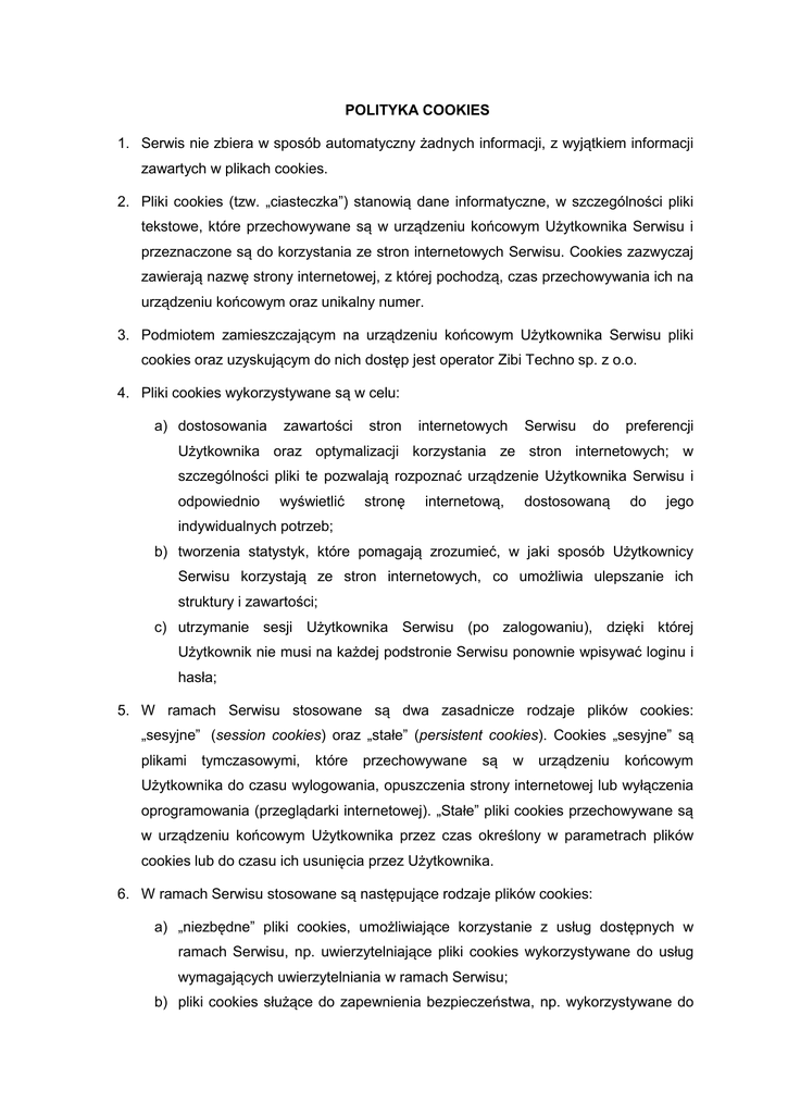 POLITYKA COOKIES 1. Serwis nie zbiera w sposób automatyczny żadnych informacji, z wyjątkiem informacji zawartych w plikach cookies. 2. Pliki cookies (tzw. „ciasteczka”) stanowią dane informatyczne, w szczególności pliki tekstowe, które przechowywane są w urządzeniu końcowym Użytkownika Serwisu i przeznaczone są do korzystania ze stron internetowych Serwisu. Cookies zazwyczaj zawierają nazwę strony internetowej, z której pochodzą, czas przechowywania ich na urządzeniu końcowym oraz unikalny numer. 3. Podmiotem zamieszczającym na urządzeniu końcowym Użytkownika Serwisu pliki cookies oraz uzyskującym do nich dostęp jest operator Zibi Techno sp. z o.o. 4. Pliki cookies wykorzystywane są w celu: a) dostosowania zawartości stron internetowych Serwisu do preferencji Użytkownika oraz optymalizacji korzystania ze stron internetowych; w szczególności pliki te pozwalają rozpoznać urządzenie Użytkownika Serwisu i odpowiednio wyświetlić stronę internetową, dostosowaną do jego indywidualnych potrzeb; b) tworzenia statystyk, które pomagają zrozumieć, w jaki sposób Użytkownicy Serwisu korzystają ze stron internetowych, co umożliwia ulepszanie ich struktury i zawartości; c) utrzymanie sesji Użytkownika Serwisu (po zalogowaniu), dzięki której Użytkownik nie musi na każdej podstronie Serwisu ponownie wpisywać loginu i hasła; 5. W ramach Serwisu stosowane są dwa zasadnicze rodzaje plików cookies: „sesyjne” (session cookies) oraz „stałe” (persistent cookies). Cookies „sesyjne” są plikami tymczasowymi, które przechowywane są w urządzeniu końcowym Użytkownika do czasu wylogowania, opuszczenia strony internetowej lub wyłączenia oprogramowania (przeglądarki internetowej). „Stałe” pliki cookies przechowywane są w urządzeniu końcowym Użytkownika przez czas określony w parametrach plików cookies lub do czasu ich usunięcia przez Użytkownika. 6. W ramach Serwisu stosowane są następujące rodzaje plików cookies: a) „niezbędne” pliki cookies, umożliwiające korzystanie z usług dostępnych w ramach Serwisu, np. uwierzytelniające pliki cookies wykorzystywane do usług wymagających uwierzytelniania w ramach Serwisu; b) pliki cookies służące do zapewnienia bezpieczeństwa, np. wykorzystywane do wykrywania nadużyć w zakresie uwierzytelniania w ramach Serwisu; c) „wydajnościowe” pliki cookies, umożliwiające zbieranie informacji o sposobie korzystania ze stron internetowych Serwisu; d) „funkcjonalne” pliki cookies, umożliwiające „zapamiętanie” wybranych przez Użytkownika ustawień i personalizację interfejsu Użytkownika, np. w zakresie wybranego języka lub regionu, z którego pochodzi Użytkownik, rozmiaru czcionki, wyglądu strony internetowej itp.; e) „reklamowe” pliki cookies, umożliwiające dostarczanie Użytkownikom treści reklamowych bardziej dostosowanych do ich zainteresowań. 7. W wielu przypadkach oprogramowanie służące do przeglądania stron internetowych (przeglądarka internetowa) domyślnie dopuszcza przechowywanie plików cookies w urządzeniu końcowym Użytkownika. Użytkownicy Serwisu mogą dokonać w każdym czasie zmiany ustawień dotyczących plików cookies. Ustawienia te mogą zostać zmienione w szczególności w taki sposób, aby blokować automatyczną obsługę plików cookies w ustawieniach przeglądarki internetowej bądź informować o ich każdorazowym zamieszczeniu w urządzeniu Użytkownika Serwisu. Szczegółowe informacje o możliwości i sposobach obsługi plików cookies dostępne są w ustawieniach oprogramowania (przeglądarki internetowej). 8. Operator Serwisu informuje, że ograniczenia stosowania plików cookies mogą wpłynąć na niektóre funkcjonalności dostępne na stronach internetowych Serwisu. 9. Pliki cookies zamieszczane w urządzeniu końcowym Użytkownika Serwisu i wykorzystywane mogą być również przez współpracujących z operatorem Serwisu reklamodawców oraz partnerów. 10. Więcej informacji na temat plików cookies dostępnych jest w sekcji „Pomoc” w menu przeglądarki internetowej.