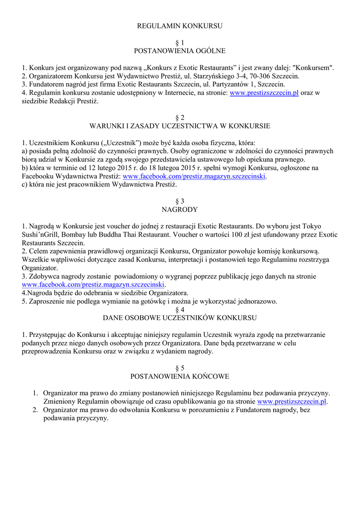 REGULAMIN KONKURSU §1 POSTANOWIENIA OGÓLNE 1. Konkurs jest organizowany pod nazwą „Konkurs z Exotic Restaurants” i jest zwany dalej: "Konkursem". 2. Organizatorem Konkursu jest Wydawnictwo Prestiż, ul. Starzyńskiego 3-4, 70-306 Szczecin. 3. Fundatorem nagród jest firma Exotic Restaurants Szczecin, ul. Partyzantów 1, Szczecin. 4. Regulamin konkursu zostanie udostępniony w Internecie, na stronie: www.prestizszczecin.pl oraz w siedzibie Redakcji Prestiż. §2 WARUNKI I ZASADY UCZESTNICTWA W KONKURSIE 1. Uczestnikiem Konkursu („Uczestnik”) może być każda osoba fizyczna, która: a) posiada pełną zdolność do czynności prawnych. Osoby ograniczone w zdolności do czynności prawnych biorą udział w Konkursie za zgodą swojego przedstawiciela ustawowego lub opiekuna prawnego. b) która w terminie od 12 lutego 2015 r. do 18 lutegoa 2015 r. spełni wymogi Konkursu, ogłoszone na Facebooku Wydawnictwa Prestiż: www.facebook.com/prestiz.magazyn.szczecinski. c) która nie jest pracownikiem Wydawnictwa Prestiż. §3 NAGRODY 1. Nagrodą w Konkursie jest voucher do jednej z restauracji Exotic Restaurants. Do wyboru jest Tokyo Sushi’nGrill, Bombay lub Buddha Thai Restaurant. Voucher o wartości 100 zł jest ufundowany przez Exotic Restaurants Szczecin. 2. Celem zapewnienia prawidłowej organizacji Konkursu, Organizator powołuje komisję konkursową. Wszelkie wątpliwości dotyczące zasad Konkursu, interpretacji i postanowień tego Regulaminu rozstrzyga Organizator. 3. Zdobywca nagrody zostanie powiadomiony o wygranej poprzez publikację jego danych na stronie www.facebook.com/prestiz.magazyn.szczecinski. 4.Nagroda będzie do odebrania w siedzibie Organizatora. 5. Zaproszenie nie podlega wymianie na gotówkę i można je wykorzystać jednorazowo. §4 DANE OSOBOWE UCZESTNIKÓW KONKURSU 1. Przystępując do Konkursu i akceptując niniejszy regulamin Uczestnik wyraża zgodę na przetwarzanie podanych przez niego danych osobowych przez Organizatora. Dane będą przetwarzane w celu przeprowadzenia Konkursu oraz w związku z wydaniem nagrody. §5 POSTANOWIENIA KOŃCOWE 1. Organizator ma prawo do zmiany postanowień niniejszego Regulaminu bez podawania przyczyny. Zmieniony Regulamin obowiązuje od czasu opublikowania go na stronie www.prestizszczecin.pl. 2. Organizator ma prawo do odwołania Konkursu w porozumieniu z Fundatorem nagrody, bez podawania przyczyny.
