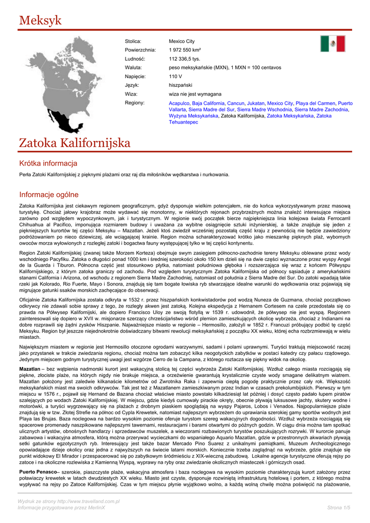 Meksyk Stolica: Mexico City Powierzchnia: 1 972 550 km² Ludność: 112 336,5 tys. Waluta: peso meksykańskie (MXN), 1 MXN = 100 centavos Napięcie: 110 V Język: hiszpański Wiza: wiza nie jest wymagana Regiony: Acapulco, Baja California, Cancun, Jukatan, Mexico City, Playa del Carmen, Puerto Vallarta, Sierra Madre del Sur, Sierra Madre Wschodnia, Sierra Madre Zachodnia, Wyżyna Meksykańska, Zatoka Kalifornijska, Zatoka Meksykańska, Zatoka Tehuantepec Zatoka Kalifornijska Krótka informacja Perła Zatoki Kalifornijskiej z pięknymi plażami oraz raj dla miłośników wędkarstwa i nurkowania. Informacje ogólne Zatoka Kalifornijska jest ciekawym regionem geograficznym, gdyż dysponuje wielkim potencjałem, nie do końca wykorzystywanym przez masową turystykę. Chociaż jałowy krajobraz może wydawać się monotonny, w niektórych rejonach przybrzeżnych można znaleźć interesujące miejsca zarówno pod względem wypoczynkowym, jak i turystycznym. W regionie swój początek bierze najpiękniejsza linia kolejowa świata Ferrocarril Chihuahua al Pacifico, imponująca rozmiarem budowy i uważana za wybitne osiągnięcie sztuki inżynierskiej, a także znajduje się jeden z piękniejszych kurortów tej części Meksyku – Mazatlan. Jeżeli ktoś zwiedził wcześniej pozostałą część kraju z pewnością nie będzie zawiedziony podróżowaniem po nieco dziewiczej, ale wciągającej krainie. Region można scharakteryzować krótko jako mieszankę pięknych plaż, wybornych owoców morza wyłowionych z rozległej zatoki i bogactwa fauny występującej tylko w tej części kontynentu. Region Zatoki Kalifornijskiej (zwanej także Morzem Korteza) obejmuje swym zasięgiem północno-zachodnie tereny Meksyku oblewane przez wody wschodniego Pacyfiku. Zatoka o długości ponad 1000 km i średniej szerokości około 150 km dzieli się na dwie części wyznaczone przez wyspy Angel de la Guarda i Tiburon. Północna część jest stosunkowo płytka, natomiast południowa głęboka i rozszerzająca się wraz z końcem Półwyspu Kalifornijskiego, z którym zatoka graniczy od zachodu. Pod względem turystycznym Zatoka Kalifornijska od północy sąsiaduje z amerykańskimi stanami California i Arizona, od wschodu z regionem Sierra Madre Zachodniej, natomiast od południa z Sierra Madre del Sur. Do zatoki wpadają takie rzeki jak Kolorado, Rio Fuerte, Mayo i Sonora, znajdują się tam bogate łowiska ryb stwarzające idealne warunki do wędkowania oraz pojawiają się migrujące gatunki ssaków morskich zachęcające do obserwacji. Oficjalnie Zatoka Kalifornijska została odkryta w 1532 r. przez hiszpańskich konkwistadorów pod wodzą Nuneza de Guzmana, chociaż początkowo odkrywcy nie zdawali sobie sprawy z tego, że rozległy akwen jest zatoką. Kolejna ekspedycja z Hernanem Cortesem na czele przedostała się co prawda na Półwysep Kalifornijski, ale dopiero Francisco Uloy ze swoją flotyllą w 1539 r. udowodnił, że półwysep nie jest wyspą. Regionem zainteresowali się dopiero w XVII w. misjonarze szerzący chrześcijaństwo wśród plemion zamieszkujących okolicę wybrzeża, chociaż z Indianami na dobre rozprawili się żądni zysków Hiszpanie. Najważniejsze miasto w regionie – Hermosillo, założyli w 1852 r. Francuzi próbujący podbić tę część Meksyku. Region był jeszcze niejednokrotnie doświadczany bitwami rewolucji meksykańskiej z początku XX wieku, której echa rozbrzmiewają w wielu miastach. Największym miastem w regionie jest Hermosillo otoczone ogrodami warzywnymi, sadami i polami uprawnymi. Turyści traktują miejscowość raczej jako przystanek w trakcie zwiedzania regionu, chociaż można tam zobaczyć kilka neogotyckich zabytków w postaci katedry czy pałacu rządowego. Jedynym miejscem godnym turystycznej uwagi jest wzgórze Cerro de la Campana, z którego roztacza się piękny widok na okolicę. Mazatlan – bez wątpienia nadmorski kurort jest wakacyjną stolicą tej części wybrzeża Zatoki Kalifornijskiej. Wzdłuż całego miasta rozciągają się piękne, złociste plaże, na których nigdy nie brakuje miejsca, a orzeźwienie gwarantują krystalicznie czyste wody smagane delikatnym wiatrem. Mazatlan położony jest zaledwie kilkanaście kilometrów od Zwrotnika Raka i zapewnia ciepłą pogodę praktycznie przez cały rok. Większość meksykańskich miast ma swoich odkrywców. Tak jest też z Mazatlanem zamieszkiwanym przez Indian w czasach prekolumbijskich. Pierwszy w tym miejscu w 1576 r., pojawił się Hernand de Bazana chociaż właściwe miasto powstało kilkadziesiąt lat później i dosyć często padało łupem piratów szalejących po wodach Zatoki Kalifornijskiej. W miejscu, gdzie kiedyś cumowały pirackie okręty, obecnie pływają luksusowe jachty, skutery wodne i motorówki, a turyści wygrzewający się na plażach z drobnym piaskiem spoglądają na wyspy Pajaros, Lobos i Venados. Najpopularniejsze plaże znajdują się w tzw. Złotej Strefie na północ od Cypla Krewetek, natomiast najlepszym wybrzeżem do uprawiania szerokiej gamy sportów wodnych jest Playa las Brujas. Baza noclegowa na bardzo wysokim poziomie oferuje turystom szereg wakacyjnych dogodności. Wzdłuż wybrzeża rozciągają się spacerowe promenady naszpikowane najlepszymi tawernami, restauracjami i barami otwartymi do późnych godzin. W ciągu dnia można tam spotkać ulicznych artystów, obnośnych handlarzy i sprzedawców muszelek, a wieczorami rozbawionych turystów poszukujących rozrywki. W kurorcie panuje zabawowa i wakacyjna atmosfera, którą można przerywać wycieczkami do wspaniałego Aquario Mazatlan, gdzie w przestronnych akwariach pływają setki gatunków egzotycznych ryb. Interesujący jest także bazar Mercado Pino Suarez z unikalnymi pamiątkami, Muzeum Archeologicznego opowiadające dzieje okolicy oraz jedna z najwyższych na świecie latarni morskich. Koniecznie trzeba zaglądnąć na wybrzeże, gdzie znajduje się punkt widokowy El Mirador i p