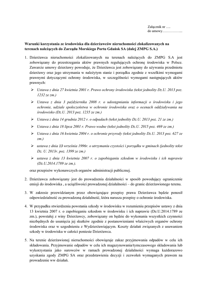 Załącznik nr …. do umowy……………... Warunki korzystania ze środowiska dla dzierżawców nieruchomości zlokalizowanych na terenach należących do Zarządu Morskiego Portu Gdańsk SA (dalej ZMPG S.A.) 1. Dzierżawca nieruchomości zlokalizowanych na terenach należących do ZMPG S.A jest zobowiązany do przestrzegania aktów prawnych regulujących ochronę środowiska w Polsce. Zawarcie umowy dzierżawy powoduje, że Dzierżawca jest zobowiązany do używania przedmiotu dzierżawy oraz jego utrzymania w należytym stanie i porządku zgodnie z wszelkimi wymogami prawnymi dotyczącymi ochrony środowiska, w szczególności wymogami następujących aktów prawnych: Ustawa z dnia 27 kwietnia 2001 r. Prawo ochrony środowiska (tekst jednolity Dz.U. 2013 poz. 1232 ze zm.) Ustawa z dnia 3 października 2008 r. o udostępnianiu informacji o środowisku i jego ochronie, udziale społeczeństwa w ochronie środowiska oraz o ocenach oddziaływania na środowisko (Dz.U. 2013 poz. 1235 ze zm.) Ustawa z dnia 14 grudnia 2012 r. o odpadach (tekst jednolity Dz.U. 2013 poz. 21 ze zm.) Ustawa z dnia 18 lipca 2001 r. Prawo wodne (tekst jednolity Dz.U. 2015 poz. 469 ze zm.) Ustawa z dnia 16 kwietnia 2004 r. o ochronie przyrody (tekst jednolity Dz.U. 2013 poz. 627 ze zm.) ustawa z dnia 13 września 1996r. o utrzymaniu czystości i porządku w gminach (jednolity tekst Dz. U. 2013r. poz. 1399 ze zm.) ustawa z dnia 13 kwietnia 2007 r. o zapobieganiu szkodom w środowisku i ich naprawie (Dz.U.2014.1789 ze zm.). oraz przepisów wykonawczych organów administracji publicznej. 2. Dzierżawca zobowiązany jest do prowadzenia działalności w sposób powodujący ograniczenie emisji do środowiska , a uciążliwości prowadzonej działalności – do granic dzierżawionego terenu. 3. W zakresie przewidzianym przez obowiązujące przepisy prawa Dzierżawca będzie ponosił odpowiedzialność za prowadzoną działalność, która narusza przepisy o ochronie środowiska. 4. W przypadku stwierdzenia powstania szkody w środowisku w rozumieniu przepisów ustawy z dnia 13 kwietnia 2007 r. o zapobieganiu szkodom w środowisku i ich naprawie (Dz.U.2014.1789 ze zm.), powstałej z winy Dzierżawcy, zobowiązany on będzie do wykonania wszystkich czynności niezbędnych do usunięcia jej skutków zgodnie z postanowieniami właściwych organów ochrony środowiska oraz w uzgodnieniu z Wydzierżawiającym. Koszty działań związanych z usuwaniem szkody w środowisku w całości poniesie Dzierżawca. 5. Na terenie dzierżawionej nieruchomości obowiązuje zakaz przyjmowania odpadów w celu ich składowania. Przyjmowanie odpadów w celu ich magazynowania/tymczasowego składowania lub wykorzystania jako surowców w ramach prowadzonej działalności wymaga każdorazowo uzyskania zgody ZMPG SA oraz przedstawienia decyzji i zezwoleń wymaganych prawem na prowadzenie ww działań. W przypadku wątpliwości co do statusu przedmiotów lub substancji, które będą znajdowały się na terenie Nieruchomości w związku z działalnością/inwestycją Dzierżawcy wykazanie, iż nie są one odpadami leży po stronie Dzierżawcy. W przypadku stwierdzenia postępowania z odpadami niezgodnego z przepisami prawa lub zapisami niniejszych warunków ZMPG SA będzie uprawniony do żądania, aby Dzierżawca w wyznaczonym terminie usunął odpady, których dotyczą w/w nieprawidłowości, na własny koszt i ryzyko. Dzierżawca ponosi wszelkie koszty związane z gospodarką odpadami i nie przysługuje mu roszczenie o zwrot kosztów poniesionych z tego tytułu. 6. W przypadku gdy na dzierżawionym terenie występują drzewa i krzewy, które kolidują z planowaną przez dzierżawcę działalnością/inwestycją, a których usunięcie wymaga uzyskania decyzji administracyjnej, dzierżawca jest zobowiązany do jej uzyskania i postępowania zgodnie z zapisami ustawy o ochronie przyrody. Jednocześnie, dzierżawca jest zobligowany do bieżącej pielęgnacji zieleni. Sadzenie jakiejkolwiek roślinności wymaga uzgodnienia z ZMPG SA. 7. ZMPG SA przysługuje prawo do dokonania inspekcji w zakresie przestrzegania przez Dzierżawcę przepisów ochrony środowiska oraz warunków korzystania ze środowiska określonych niniejszym załącznikiem na dzierżawionym terenie. W przypadku stwierdzenia przez inspekcję ZMPG SA nie przestrzegania ww, Dzierżawca zobowiązany jest do niezwłocznego usunięcia nieprawidłowości zgodnie z wytycznymi Wydzierżawiającego. ZMPG SA ma także prawo zwrócić się do organów administracji publicznej o dokonanie inspekcji w zakresie przestrzegania przepisów i stwarzania zagrożeń dla środowiska. 8. Przed rozpoczęciem, a także przed każdą zmianą rodzaju i zakresu, działalności na terenach dzierżawionych od ZMPG SA , Dzierżawca zobowiązany jest do: 8.1. uzgodnienia z ZMPG SA rodzaju i zakresu działalności, którą zamierza prowadzić na dzierżawionym terenie; 8.2. uzyskania własnym staraniem oraz na własny koszt i ryzyko wszelkich pozwoleń i zgód środowiskowych, w tym decyzji o środowiskowych uwarunkowaniach i pozwoleń emisyjnych niezbędnych w działalności Dzierżawcy na terenie Nieruchomości, w tym inwestycji; 8.3. przekazywania ZMPG SA do uzgodnienia wszelkich wniosków o wydanie wymaganych obowiązującym prawem decyzji i zezwoleń dotyczących prowadzonej działalności lub planowanych inwestycji; 8.4. niezwłocznego przekazywania uzyskanych decyzji i zezwoleń oraz wszelkiej dokumentacji uzgodnieniowej i opiniującej powstającej w procedurze uzyskiwania ww decyzji i zezwoleń; 8.5. realizacji własnym staraniem oraz na własny koszt i ryzyko wszelkich prac dostosowawczych oraz prac związanych z działaniami minimalizującymi lub kompensującymi straty wartości przyrodniczych, których obowiązek zostanie nałożony przez odpowiednie organy administracji publicznej w zezwoleniach i decyzjach wydanych na rzecz Dzierżawcy, również w przypadku konieczności przeniesienia osobników lub sta