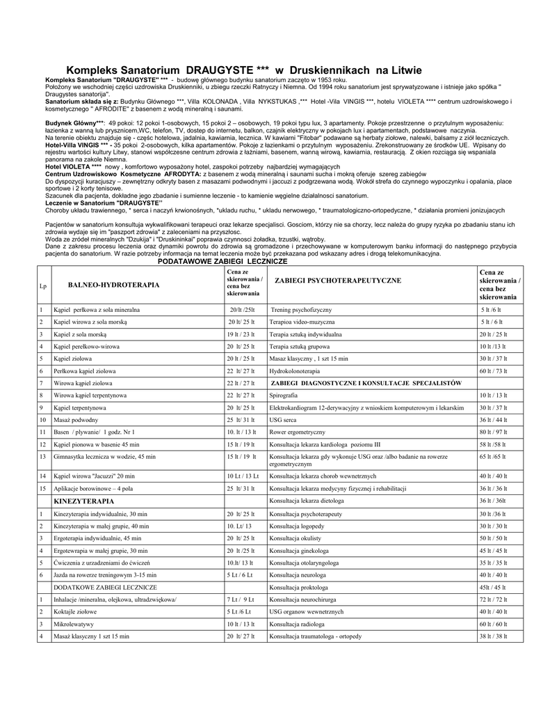 Kompleks Sanatorium DRAUGYSTE *** w Druskiennikach na Litwie Kompleks Sanatorium ''DRAUGYSTE'' *** - budowę głównego budynku sanatorium zaczęto w 1953 roku. Położony we wschodniej części uzdrowiska Druskienniki, u zbiegu rzeczki Ratnyczy i Niemna. Od 1994 roku sanatorium jest sprywatyzowane i istnieje jako spółka '' Draugystes sanatorija''. Sanatorium składa się z: Budynku Głównego ***, Villa KOLONADA , Villa NYKSTUKAS ,*** Hotel -Vila VINGIS ***, hotelu VIOLETA **** centrum uzdrowiskowego i kosmetycznego '' AFRODITE'' z basenem z wodą mineralną i saunami. Budynek Główny***: 49 pokoi: 12 pokoi 1-osobowych, 15 pokoi 2 – osobowych, 19 pokoi typu lux, 3 apartamenty. Pokoje przestrzenne o przytulnym wyposażeniu: łazienka z wanną lub prysznicem,WC, telefon, TV, dostep do internetu, balkon, czajnik elektryczny w pokojach lux i apartamentach, podstawowe naczynia. Na terenie obiektu znajduje się - częśc hotelowa, jadalnia, kawiarnia, lecznica. W kawiarni ''Fitobar'' podawane są herbaty ziołowe, nalewki, balsamy z ziół leczniczych. Hotel-Villa VINGIS *** - 35 pokoi 2-osobowych, kilka apartamentów. Pokoje z łazienkami o przytulnym wyposażeniu. Zrekonstruowany ze środków UE. Wpisany do rejestru wartości kultury Litwy, stanowi współczesne centrum zdrowia z łażniami, basenem, wanną wirową, kawiarnia, restauracją. Z okien rozciąga się wspaniala panorama na zakole Niemna. Hotel VIOLETA **** nowy , komfortowo wyposażony hotel, zaspokoi potrzeby najbardziej wymagających Centrum Uzdrowiskowo Kosmetyczne AFRODYTA: z basenem z wodą mineralną i saunami sucha i mokrą oferuje szereg zabiegów Do dyspozycji kuracjuszy – zewnętrzny odkryty basen z masazami podwodnymi i jaccuzi z podgrzewana wodą. Wokół strefa do czynnego wypoczynku i opalania, place sportowe i 2 korty tenisowe. Szacunek dla pacjenta, dokładne jego zbadanie i sumienne leczenie - to kamienie węgielne działalnosci sanatorium. Leczenie w Sanatorium "DRAUGYSTE’’ Choroby układu trawiennego, * serca i naczyń krwionośnych, *ukladu ruchu, * ukladu nerwowego, * traumatologiczno-ortopedyczne, * działania promieni jonizujacych Pacjentów w sanatorium konsultuja wykwalifikowani terapeuci oraz lekarze specjalisci. Gosciom, którzy nie sa chorzy, lecz należa do grupy ryzyka po zbadaniu stanu ich zdrowia wydaje się im "paszport zdrowia" z zaleceniami na przyszłosc. Woda ze zródeł mineralnych "Dzukija" i "Druskininkai" poprawia czynnosci żoładka, trzustki, wątroby. Dane z zakresu procesu leczenia oraz dynamiki powrotu do zdrowia są gromadzone i przechowywane w komputerowym banku informacji do następnego przybycia pacjenta do sanatorium. W razie potrzeby informacja na temat leczenia może być przekazana pod wskazany adres i drogą telekomunikacyjna. PODATAWOWE ZABIEGI LECZNICZE Lp BALNEO-HYDROTERAPIA 1 Kąpiel perłkowa z sola mineralna 2 3 Cena ze skierowania / cena bez skierowania ZABIEGI PSYCHOTERAPEUTYCZNE Cena ze skierowania / cena bez skierowania 20/lt /25lt Trening psychofizyczny Kapiel wirowa z sola morską 20 lt/ 25 lt Terapioa video-muzyczna 5 lt / 6 lt Kapiel z sola morską 19 lt / 23 lt Terapia sztuką indywidualna 20 lt / 25 lt 4 Kąpiel perełkowo-wirowa 20 lt/ 25 lt Terapia sztuką grupowa 10 lt /13 lt 5 Kąpiel ziolowa 20 lt / 25 lt Masaz klasyczny , 1 szt 15 min 30 lt / 37 lt 6 Perłkowa kąpiel ziolowa 22 lt/ 27 lt Hydrokolonoterapia 60 lt / 73 lt 7 Wirowa kąpiel ziolowa 22 lt / 27 lt ZABIEGI DIAGNOSTYCZNE I KONSULTACJE SPECJALISTÓW 8 Wirowa kąpiel terpentynowa 22 lt/ 27 lt Spirografia 10 lt / 13 lt 9 Kąpiel terpentynowa 20 lt/ 25 lt Elektrokardiogram 12-derywacyjny z wnioskiem komputerowym i lekarskim 30 lt / 37 lt 10 Masaż podwodny 25 lt/ 31 lt USG serca 36 lt / 44 lt 11 Basen / plywanie/ 1 godz. Nr 1 10. lt / 13 lt Rower ergometryczny 80 lt / 97 lt 12 Kąpiel pionowa w basenie 45 min 15 lt / 19 lt Konsultacja lekarza kardiologa poziomu III 58 lt /58 lt 13 Gimnasytka lecznicza w wodzie, 45 min 15 lt / 19 lt Konsultacja lekarza gdy wykonuje USG oraz /albo badanie na rowerze ergometrycznym 65 lt /65 lt 14 Kąpiel wirowa ''Jacuzzi'' 20 min 10 Lt / 13 Lt Konsultacja lekarza chorob wewnetrznych 40 lt / 40 lt 15 Aplikacje borowinowe – 4 pola 25 lt/ 31 lt Konsultacja lekarza medycyny fizycznej i rehabilitacji 36 lt / 36 lt Konsultacja lekarza dietologa 36 lt / 36lt KINEZYTERAPIA 5 lt /6 lt 1 Kinezyterapia indywidualnie, 30 min 20 lt/ 25 lt Konsultacja psychoterapeuty 30 lt /36 lt 2 Kinezyterapia w małej grupie, 40 min 10. Lt/ 13 Konsultacja logopedy 30 lt / 30 lt 3 Ergoterapia indywidualnie, 45 min 20 lt/ 25 lt Konsultacja okulisty 50 lt / 50 lt 4 Ergotewrapia w małej grupie, 30 min 20 lt /25 lt Konsultacja ginekologa 45 lt / 45 lt 5 Ćwiczenia z urzadzeniami do ćwiczeń 10.lt/ 13 lt Konsultacja otolaryngologa 35 lt / 35 lt 6 Jazda na rowerze treningowym 3-15 min 5 Lt / 6 Lt Konsultacja neurologa 40 lt / 40 lt Konsultacja proktologa 45lt / 45 lt DODATKOWE ZABIEGI LECZNICZE 1 Inhalacje /mineralna, olejkowa, ultradzwiękowa/ 7 Lt / 9 Lt Konsultacja neurochirurga 72 lt / 72 lt 2 Koktajle ziołowe 5 Lt /6 Lt USG organow wewnetrznych 40 lt / 40 lt 3 Mikrolewatywy 10 lt / 13 lt Konsultacja radiologa 60 lt / 60 lt 4 Masaż klasyczny 1 szt 15 min 20 lt/ 27 lt Konsultacja traumatologa - ortopedy 38 lt / 38 lt Konsultacja gastroenterologa 36 lt / 36lt 1 Ultradżwiek aparatem ''PHYSIOMED IONOSON expert'' 15 lt/ 19 lt Konsultacja endokrynologa 40 l t / 40 lt 2 Terapia ultradzwiekowa 10 lt / 13 lt Konsultacja pulmonologaz badaniem funkcji oddechowych 63 lt / 63 lt 3 Ultrafonoreza 10 lt / 13 lt 4 Prądy interfencyjne aparatem PHysioson 10 lt / 13 lt Morfologia krwi sposobem automatycznym /norma/ 30 lt /30 lt 5 Prądy diadynamiczne aparatem PHYSIOSON 10 lt / 13 lt Morfologia krwi sposobem automatycznym /patologia/ 40 lt / 40 lt 6 Magnetoterapia aparatem MAGNETOBOX 10 lt / 13 lt Ustalenie białka ogolnego 10 lt /10 lt 7 Czynnościowa stymulacja miesni aparatem NEUROTRAC 10 lt / 1