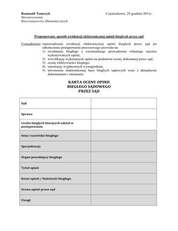 Romuald Tomczyk Stowarzyszenie Rzeczoznawców Ekonomicznych Częstochowa, 29 grudnia 2011r. Proponowany sposób ewidencji elektronicznej opinii biegłych przez sąd Uzasadnienie: wprowadzenie ewidencji elektronicznej opinii biegłych przez sąd po zakończeniu postępowania procesowego pozwala na: 1) zwolnienie biegłego z ewentualnego prowadzenia własnego rejestru wykonywanych opinii, 2) weryfikację wykonanych opinii na podstawie oceny dokonanej przez sąd, 3) ocenę efektywności biegłego, 4) rejestrację wypłaconych wynagrodzeń, 5) utworzenie elektronicznej bazy biegłych sądowych wraz z aktualnymi dokonaniami i zmianami. KARTA OCENY OPINII BIEGŁEGO SĄDOWEGO PRZEZ SĄD Sąd Sprawa Liczba biegłych biorących udział w postępowaniu Imię i nazwisko biegłego Specjalizacja Organ powołujący biegłego Tytuł opinii Koszt opinii / Należność biegłego Ocena opinii przez sąd Uwagi