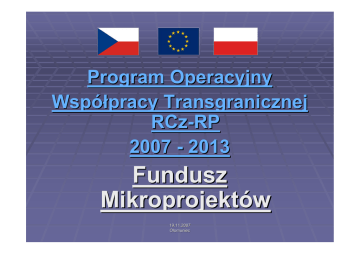 Program Operacyjny Współpracy Transgranicznej RCz-RP 2007 - 2013 Fundusz Mikroprojektów 19.11.2007 Ołomuniec Europejska współpraca transgraniczna = Cel 3, który jest nastawiony na wzmocnienie: (73,86%) wspólpraca transgraniczna ……………….. (20,95%) ……………….. (5,19%) 19.11.2007 Ołomuniec Programy Operacyjne Współpracy Transgranicznej (POWT) v RCz 2007 – 2013 Nazwa programu Alokacia EU (dla CZ) POWT RCz - Polska 103 680 000 EUR POWT RCz - Bavorsko 55 037 599 EUR POWT RCz - Sasko 67 199 631 EUR POWT RCz - Austria 69 120 000 EUR POWT RCz – Słowacia 56 552 727 EUR Łącznie 351 589 957 EUR 19.11.2007 Ołomuniec Historia UE programów czesko-polskiej współpracy transgranicznej Phare CBC 1999 – 2003 - łącznie 23 mil. EUR INTERREG IIIA 2004 – 2006 - łącznie 16,5 mil. EUR PO Współpracy Transgranicznej 2007 – 2013 - łącznie 103,68 mil. EUR 19.11.2007 Ołomuniec POWT CZ-PL 2007-2013 Osie prioritetowe: I. II. III. IV. Wzmacnianie dostępności komunikacyjnej, ochrona środowiska, profilaktyka zagrożeń Poprawa warunków rozwoju przedsiębiorczości i turystyki Wspieranie współpracy społeczności lokalnych Pomoc techniczna 19.11.2007 Ołomuniec Projekty do Funduszu mikroprojektów Fundusz mikroprojektów = narzędzie realizacji nieinvesticyjnych i małych investicyjnych projektów s finansową dotacią UE w wysokośći od 2 000 EUR do 30 000 EUR 19.11.2007 Ołomuniec Historia „funduszu małych projektów“ w unijnych programach czesko-polskiej współpracy transgranicznej Phare CBC 1999 – 2003 Wspólny Fundusz Małych Projektów = schemat grantowy : 10% programu INTERREG IIIA 2004 – 2006 Fundusz Mikroprojektów = działanie 2.2 : 15% programu PO Współpracy Transgranicznej 2007 – 2013 Fundusz Mikroprojektów = dziedzina wsparcia 3.3 : 20% programu 19.11.2007 Ołomuniec Podstawowa specyfika „funduszu małych projektów“ = zarządzanie Funduszem oddelegowane na szczebel euroregionów (ER Nysa, Glacensis, Pradziad, Silesia, Śląsk Cieszyński, Beskidy) ÐÐÐÐÐÐ „życie“ małych projektów różni się od dużych projektów 19.11.2007 Ołomuniec MAŁY czy DUŻY projekt ? MAŁY DUŻY Minimalna wysokość dofinansowania UE 2 000 EUR 30 001 EUR Maksymalna wysokość dofinansowania UE 30 000 EUR nieokreślona 85% 85% Maksymalne całkowite koszty projektu 60 000 EUR nieokreślone Projekty inwestycyjne tak, ale nie wszystkie rodzaje tak Obowiązkowa zasada Partnera Wiodącego nie tak Maksymalna stopa dofinansowania UE 19.11.2007 Ołomuniec MAŁY projekt (= tzw. mikroprojekt) ! Gdzie znajdę informacje? Jakie dokumenty są dla mnie ważne ? Gdzie mogę skorzystać z konsultacji ? Gdzie powinienem dokonać rejestracji projektu ? Kdo będzie dokonywał oceny projektu i kto będzie go zatwierdzał ? Z kim będę zawierał umowę ? Kto będzie przeprowadzał kontrolę projektu ? Dokąd będę składał raport końcowy i wniosek o płatność ? … i czy jest wystarczająca ilość środków finansowych ? 19.11.2007 Ołomuniec Projekty do Funduszu mikroprojektów Konzultace poskytují příslušné euroregiony, informace a dokumenty – viz dále Projekty se předkládají na sekretariátech příslušných euroregionů Projekty se předkládají v podobě elektronické žádosti BENEFIT 7+ pro FMP OPPS ČR-PR Projekty schvaluje společný česko-polský Euroregionální řídící výbor příslušného euroregionu (6 euroregionů = 6 EŘV) 19.11.2007 Ołomuniec Przynależność terytorialna Przynależność terytorialna zależna jest od siedziby wnioskodawcy, nie zaś od miejsca realizacji projektu. Dla celów programu każdy euroregion zarządza określonym obszarem, który nie musi być zgodny z obszarem danego euroregionu. Dla celów programu przynależność do euroregionu nie jest ważna. Partner transgraniczny nie musi pochodzić z obszaru tego samego euroregionu. 19.11.2007 Ołomuniec Przynależność terytorialna wnioskodawcy (I) ER Těšínské Slezsko - Śląsk Cieszyński CZ : powiat Karviná, powiat Frýdek-Místek - część (wg poszczególnych gmin) PL : powiat wodzisławski – część (gmina Godów), powiat cieszyński, powiat bielski – część (gminy Jasienica, Jaworze), Miasto Jastrzębie-Zdrój ER Beskydy – Beskidy CZ : powiat Frýdek-Místek - część (wg poszczególnych gmin) PL : powiat bielski – część, powiat żywiecki, powiat pszczyński, Miasto Bielsko-Biała 19.11.2007 Ołomuniec Przynależność terytorialna wnioskodawcy (II) ER Silesia CZ : powiaty Opava, Ostrava, Nový Jičín PL : powiat głubczycki, raciborski, rybnicki, wodzisławski (bez gminy Godów), miasta Rybnik i Żory ER Praděd - Pradziad CZ : powiaty Bruntál, Jeseník, Olomouc, Přerov, Prostějov PL : powiat brzeski, kędziersko-kozielski, kluczborski, krapkowicki, namysłowski, nyski, oleski, opolski, prudnicki, strzelecki, Miasto Opole 19.11.2007 Ołomuniec Przynależność terytorialna wnioskodawcy (III) ER Glacensis CZ : powiaty Jičín, Trutnov, Náchod, Hradec Králové, Rychnov nad Kněžnou, Pardubice, Chrudim, Ústí nad orlicí, Svitavy, Šumperk PL : powiat dzierżoniowski, kłodzki, strzeliński, świdnicki, wałbrzyski, ząbkowicki, Miasto Wałbrzych ER Nisa - Nysa CZ : powiaty Česká Lípa, Liberec, Jablonec nad Nisou, Semily PL : powiat bolesławiecki, jaworski, jeleniogórski, kamiennogórski, lubański, lwówecki, złotoryjski, Miasto Jelenia Góra 19.11.2007 Ołomuniec MAŁY projekt - dokumenty Każdy euroregion jako Zarządzający właściwą cześcią Funduszu Mikroprojektów musi opracować dokumenty, na podstawie których Fundusz będzie zarządzany – dokumentacja ta może być różna w poszczególnych euroregionach, musi być jednak zgodna z zasadami Programu i zaleceniami Instytucji Zarządzającej (MRR RCz) / Koordynatora Krajowego (MRR RP) !!! 19.11.2007 Ołomuniec Przykładowe dokumenty Funduszu Mikroprojektów (FMP) Wytyczne dla wnioskodawcy z załącznikami (tabele oceny, wzór umowy, plan raportu ko