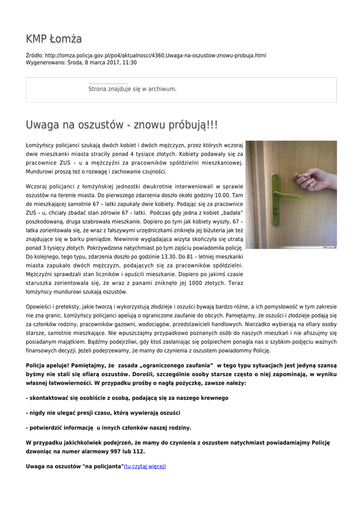 KMP Łomża Źródło: http://lomza.policja.gov.pl/po4/aktualnosci/4360,Uwaga-na-oszustow-znowu-probuja.html Wygenerowano: Środa, 8 marca 2017, 11:30 Strona znajduje się w archiwum. Uwaga na oszustów - znowu próbują!!! Łomżyńscy policjanci szukają dwóch kobiet i dwóch mężczyzn, przez których wczoraj dwie mieszkanki miasta straciły ponad 4 tysiące złotych. Kobiety podawały się za pracownice ZUS – u a mężczyźni za pracowników spółdzielni mieszkaniowej. Mundurowi proszą też o rozwagę i zachowanie czujności. Wczoraj policjanci z łomżyńskiej jednostki dwukrotnie interweniowali w sprawie oszustów na terenie miasta. Do pierwszego zdarzenia doszło około godziny 10.00. Tam do mieszkającej samotnie 67 – latki zapukały dwie kobiety. Podając się za pracownice ZUS – u, chciały zbadać stan zdrowie 67 – latki. Podczas gdy jedna z kobiet „badała” poszkodowaną, druga szabrowała mieszkanie. Dopiero po tym jak kobiety wyszły, 67 – latka zorientowała się, że wraz z fałszywymi urzędniczkami zniknęła jej biżuteria jak też znajdujące się w barku pieniądze. Niewinnie wyglądająca wizyta skończyła się utratą ponad 3 tysięcy złotych. Pokrzywdzona natychmiast po tym zajściu powiadomiła policję. Do kolejnego, tego typu, zdarzenia doszło po godzinie 13.30. Do 81 – letniej mieszkanki miasta zapukało dwóch mężczyzn, podających się za pracowników spółdzielni. Mężczyźni sprawdzali stan liczników i opuścili mieszkanie. Dopiero po jakimś czasie staruszka zorientowała się, że wraz z panami zniknęło jej 1000 złotych. Teraz łomżyńscy mundurowi szukają oszustów. Opowieści i preteksty, jakie tworzą i wykorzystują złodzieje i oszuści bywają bardzo różne, a ich pomysłowość w tym zakresie nie zna granic. Łomżyńscy policjanci apelują o ograniczone zaufanie do obcych. Pamiętajmy, że oszuści i złodzieje podają się za członków rodziny, pracowników gazowni, wodociągów, przedstawicieli handlowych. Nierzadko wybierają na ofiary osoby starsze, samotnie mieszkające. Nie wpuszczajmy przypadkowo poznanych osób do naszych mieszkań i nie afiszujmy się posiadanym majątkiem. Bądźmy podejrzliwi, gdy ktoś zasłaniając się pośpiechem ponagla nas o szybkim podjęciu ważnych finansowych decyzji. Jeżeli podejrzewamy, że mamy do czynienia z oszustem powiadommy Policję. Policja apeluje! Pamiętajmy, że zasada „ograniczonego zaufania” w tego typu sytuacjach jest jedyną szansą byśmy nie stali się ofiarą oszustów. Dorośli, szczególnie osoby starsze często o niej zapominają, w wyniku własnej łatwowierności. W przypadku prośby o nagłą pożyczkę, zawsze należy: - skontaktować się osobiście z osobą, podającą się za naszego krewnego - nigdy nie ulegać presji czasu, którą wywierają oszuści - potwierdzić informację u innych członków naszej rodziny. W przypadku jakichkolwiek podejrzeń, że mamy do czynienia z oszustem natychmiast powiadamiajmy Policję dzwoniąc na numer alarmowy 997 lub 112. Uwaga na oszustów "na policjanta"(tu czytaj więcej) Uwaga na oszustów "na wnuczka"(tu czytaj więcej) Uwaga na oszustów "na majstra"(tu czytaj więcej) Uwaga na oszustów "na urzędnika"(tu czytaj więcej) Uwaga na oszustów "na obcokrajowca"(tu czytaj więcej) NIE DAJMY SIĘ OSZUKAĆ!! Ocena: 0/5 (0) Tweetnij