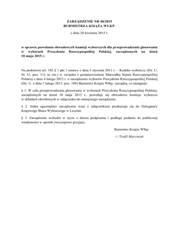 ZARZĄDZENIE NR 48/2015 BURMISTRZA KSIĄŻA WLKP. z dnia 20 kwietnia 2015 r. w sprawie powołania obwodowych komisji wyborczych dla przeprowadzenia głosowania w wyborach Prezydenta Rzeczypospolitej Polskiej, zarządzonych na dzień 10 maja 2015 r. Na podstawie art. 182 § 1 pkt 1 ustawy z dnia 5 stycznia 2011 r. – Kodeks wyborczy (Dz. U. Nr 21, poz. 112 ze zm.) w związku z postanowieniem Marszałka Sejmu Rzeczypospolitej Polskiej z dnia 4 lutego 2015 r. o zarządzeniu wyborów Prezydenta Rzeczypospolitej Polskiej (Dz. U. z dnia 7 lutego 2015, poz. 188) Burmistrz Książa Wlkp. zarządza, co następuje: § 1. W celu przeprowadzenia głosowania w wyborach Prezydenta Rzeczypospolitej Polskiej, zarządzonych na dzień 10 maja 2015 r., powołuje się obwodowe komisje wyborcze w składach określonych w załączniku do niniejszego zarządzenia. § 2. Jeden egzemplarz zarządzenia wraz z załącznikiem przekazuje się do Delegatury Krajowego Biura Wyborczego w Lesznie. § 3. Zarządzenie wchodzi w życie z dniem podpisania i podlega podaniu do publicznej wiadomości w sposób zwyczajowo przyjęty. Burmistrz Książa Wlkp. /-/ Teofil Marciniak Załącznik do Zarządzenia nr 48 /2015 Burmistrza Książa Wlkp. z dnia 20 kwietnia 2015 r. 1) Obwodowa Komisja Wyborcza Nr 1 z siedzibą w Szkole Podstawowej w Książu Wlkp., ul. Wichury 27 Roman Chrzanowiecki, zam. Książ Wlkp., zgłoszony przez Komitet Wyborczy Kandydata na Prezydenta Rzeczypospolitej Polskiej Magdaleny Ogórek Barbara Lewandowska, zam. Książ Wlkp., zgłoszona przez Komitet Wyborczy Kandydata na Prezydenta Rzeczypospolitej Polskiej Mariana Janusza Kowalskiego Małgorzata Zakrzewska, zam. Chwałkowo Kość., zgłoszona przez Komitet Wyborczy Kandydata na Prezydenta Rzeczypospolitej Polskiej Adama Jarubasa Agnieszka Walkowiak, zam. Włościejewki, zgłoszona przez Komitet Wyborczy Kandydata na Prezydenta Rzeczypospolitej Polskiej Grzegorza Michała Brauna Joanna Łeńska, zam. Kiełczynek, zgłoszona przez Komitet Wyborczy Kandydata na Prezydenta Rzeczypospolitej Polskiej Pawła Tanajno Lucyna Czesława Korcz, zam. Książ Wlkp., zgłoszona przez Komitet Wyborczy Kandydata na Prezydenta Rzeczypospolitej Polskiej Andrzeja Dudy Adrianna Nowaczyk, zam. Książ Wlkp., zgłoszona przez Komitet Wyborczy Kandydata na Prezydenta Rzeczypospolitej Polskiej Pawła Kukiza Ewa Franciszka Walkowiak, Książ Wlkp., zgłoszona przez Komitet Wyborczy Kandydata na Prezydenta Rzeczypospolitej Polskiej Bronisława Komorowskiego Ewa Halina Lis, zam. Książ Wlkp., wskazana przez Burmistrza Książa Wlkp. 2) Obwodowa Komisja Wyborcza Nr 2 z siedzibą w Szkole Podstawowej w Książu Wlkp., ul. Wichury 27 Magdalena Sylwia Bukowiecka, zam. Książ Wlkp., zgłoszona przez Komitet Wyborczy Kandydata na Prezydenta Rzeczypospolitej Polskiej Magdaleny Ogórek Marian Korcz, zam. Książ Wlkp., zgłoszony przez Komitet Wyborczy Kandydata na Prezydenta Rzeczypospolitej Polskiej Mariana Janusza Kowalskiego Ewa Irena Kujawska, zam. Kiełczyn, zgłoszona przez Komitet Wyborczy Kandydata na Prezydenta Rzeczypospolitej Polskiej Adama Jarubasa Arkadiusz Marcin Muślewski, zam. Włościejewki, zgłoszony przez Komitet Wyborczy Kandydata na Prezydenta Rzeczypospolitej Polskiej Grzegorza Michała Brauna Marlena Joanna Bartosik, zam. Włościejewice, zgłoszona przez Komitet Wyborczy Kandydata na Prezydenta Rzeczypospolitej Polskiej Pawła Tanajno Paweł Józef Gruszczyński, zam. Kiełczynek, zgłoszony przez Komitet Wyborczy Kandydata na Prezydenta Rzeczypospolitej Polskiej Andrzeja Dudy Anna Bijak, zam. Świączyń, zgłoszona przez Komitet Wyborczy Kandydata na Prezydenta Rzeczypospolitej Polskiej Pawła Kukiza Patrycja Szaroszyk, zam. Książ Wlkp., zgłoszona przez Komitet Wyborczy Kandydata na Prezydenta Rzeczypospolitej Polskiej Bronisława Komorowskiego Anna Śledź, zam. Kiełczynek, wskazana przez Burmistrza Książa Wlkp. 3) Obwodowa Komisja Wyborcza Nr 3 z siedzibą w Zespole Szkół w Mchach, Mchy 39 Andrzej Miśkiewicz, zam. Włościejewice, zgłoszony przez Komitet Wyborczy Kandydata na Prezydenta Rzeczypospolitej Polskiej Magdaleny Ogórek Barbara Alicja Radwańska, zam. Książ Wlkp., zgłoszona przez Komitet Wyborczy Kandydata na Prezydenta Rzeczypospolitej Polskiej Mariana Janusza Kowalskiego Hanna Maria Ignaszak Wojtkowiak, zam. Chwałkowo Kość., zgłoszona przez Komitet Wyborczy Kandydata na Prezydenta Rzeczypospolitej Polskiej Adama Jarubasa Małgorzata Banaszak, zam. Włościejewki, zgłoszona przez Komitet Wyborczy Kandydata na Prezydenta Rzeczypospolitej Polskiej Grzegorza Michała Brauna Elżbieta Studzińska, zam. Książ Wlkp., zgłoszona przez Komitet Wyborczy Kandydata na Prezydenta Rzeczypospolitej Polskiej Andrzeja Dudy Justyna Horała, zam. Ługi, zgłoszona przez Komitet Wyborczy Kandydata na Prezydenta Rzeczypospolitej Polskiej Pawła Kukiza Ziemowit Czesław Potocki, zam. Książ Wlkp., zgłoszony przez Komitet Wyborczy Kandydata na Prezydenta Rzeczypospolitej Polskiej Bronisława Komorowskiego Alina Stachowiak, zam. Konarzyce, wskazana przez Burmistrza Książa Wlkp. 4) Obwodowa Komisja Wyborcza Nr 4 z siedzibą w Szkole Podstawowej w Konarzycach, ul. Szkolna 6 Martyna Anna Mostowska, zam. Książ Wlkp., zgłoszona przez Komitet Wyborczy Kandydata na Prezydenta Rzeczypospolitej Polskiej Magdaleny Ogórek Marian Lewandowski, zam. Książ Wlkp., zgłoszony przez Komitet Wyborczy Kandydata na Prezydenta Rzeczypospolitej Polskiej Mariana Janusza Kowalskiego Henryk Jan Konopka, zam. Konarzyce, zgłoszony przez Komitet Wyborczy Kandydata na Prezydenta Rzeczypospolitej Polskiej Adama Jarubasa Norbert Janicki, zam. Feliksowo, zgłoszony przez Komitet Wyborczy Kandydata na Prezydenta Rzeczypospolitej Polskiej Janusza Korwin- Mikke Iwona Maria Zegar, zam. Włościejewki, zgłoszona przez Komitet Wyborczy Kandydata na Prezydenta Rzeczypospolitej Polskiej Grzegorza Michała Brauna Leszek Franciszek Andrzejczak, zam. Ługi, zgłoszony przez Komi