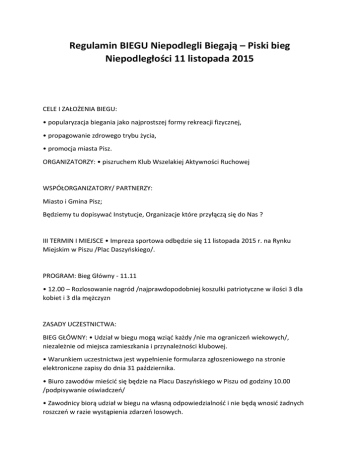 Regulamin BIEGU Niepodlegli Biegają – Piski bieg Niepodległości 11 listopada 2015 CELE I ZAŁOŻENIA BIEGU: • popularyzacja biegania jako najprostszej formy rekreacji fizycznej, • propagowanie zdrowego trybu życia, • promocja miasta Pisz. ORGANIZATORZY: • piszruchem Klub Wszelakiej Aktywności Ruchowej WSPÓŁORGANIZATORY/ PARTNERZY: Miasto i Gmina Pisz; Będziemy tu dopisywać Instytucje, Organizacje które przyłączą się do Nas ? III TERMIN I MIEJSCE • Impreza sportowa odbędzie się 11 listopada 2015 r. na Rynku Miejskim w Piszu /Plac Daszyńskiego/. PROGRAM: Bieg Główny - 11.11 • 12.00 – Rozlosowanie nagród /najprawdopodobniej koszulki patriotyczne w ilości 3 dla kobiet i 3 dla mężczyzn ZASADY UCZESTNICTWA: BIEG GŁÓWNY: • Udział w biegu mogą wziąć każdy /nie ma ograniczeń wiekowych/, niezależnie od miejsca zamieszkania i przynależności klubowej. • Warunkiem uczestnictwa jest wypełnienie formularza zgłoszeniowego na stronie elektroniczne zapisy do dnia 31 października. • Biuro zawodów mieścić się będzie na Placu Daszyńskiego w Piszu od godziny 10.00 /podpisywanie oświadczeń/ • Zawodnicy biorą udział w biegu na własną odpowiedzialność i nie będą wnosić żadnych roszczeń w razie wystąpienia zdarzeń losowych. • Trasa biegu wiedzie ulicami Pisza / 4 piskie ronda, z placu Daszyńskiego i kierujemy się w lewo/. • trasa będzie przebiegała ulicami miast, jeśli nie uda się ,,załatwić” wymagane pozwolenia bieg będzie przebiegał chodnikami • Nie będzie prowadzona klasyfikacja generalna • Uczestnicy mają obowiązek podczas trwania biegu zachowania zasad fair-play. • Na czas trwania biegu głównego ruch kołowy zostanie wstrzymany • Organizator zastrzega sobie prawo interpretacji niniejszego regulaminu. W przypadku pytań prosimy o kontakt: 530335252 lub 503845080 Limit : 100 uczestników a każdy z uczestników otrzyma pamiątkowy medal Informacje: limit 100 osób, zapisy do końca października