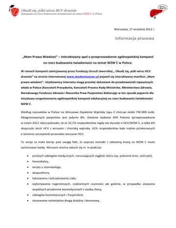 Warszawa, 17 września 2012 r. Informacja prasowa „Mam Prawo Wiedzieć” – interaktywny apel o przeprowadzenie ogólnopolskiej kampanii na rzecz budowania świadomości na temat WZW C w Polsce. W ramach kampanii zainicjowanej przez Fundację Urszuli Jaworskiej „ Obudź się, póki wirus HCV drzemie” na stronie internetowej www.akademiawzwc.pl pojawił się interaktywny manifest „Mam prawo wiedzieć”. Użytkownicy Internetu mogą przesłać dokument do przedstawicieli najwyższych władz w Polsce (Kancelarii Prezydenta, Kancelarii Prezesa Rady Ministrów, Ministerstwa Zdrowia, Narodowego Funduszu Zdrowia i Rzecznika Praw Pacjentów) deklarując w ten sposób poparcie dla inicjatywy zorganizowania ogólnopolskiej kampanii edukacyjnej na rzecz budowania świadomości WZW C. Według szacunków w Polsce na Wirusowe Zapalenie Wątroby typu C choruje około 730 000 osób. Zdiagnozowanych pacjentów jest jedynie 8%. Ostatnie badanie GFK Polonia (przeprowadzone w lutym 2012 roku) pokazało, że aż 32,1% respondentów nigdy nie słyszało o HCV/WZW C, a tylko 6% skojarzyło skrót HCV z wirusem i chorobą wątroby. 61% respondentów było mylnie przekonanych o istnieniu szczepionki przeciwko wirusowi HCV. To wciąż za mało biorąc pod uwagę fakt, że poprzez kontakt z zakażoną krwią na WZW C może zachorować każdy. Wirusem można zakazić się m. in podczas: • prostych zabiegów medycznych, naruszających ciągłość skóry (np. pobranie krwi, zastrzyki), • hemodializy, • wizyty u stomatologa, • akupunktury, • tatuowania i kolczykowania ciała, • wykonywania najprostszych, codziennych czynności jak golenie, w przypadku używania wspólnych przyborów kosmetycznych z osobą chorą, • zabiegów kosmetycznych i fryzjerskich, • stosowania narkotyków drogą dożylną i donosową, • stosunku seksualnego z osobą chorującą na WZW C (tu ryzyko znacznie mniejsze niż drogą krwiopochodną). Problem jest o tyle większy, że dopiero w 1992 roku w Polsce zaczęto stosować procedury badania krwi, wykorzystywanej do transfuzji, na obecność wirusa HCV. W związku z tym pacjenci, ale także pracownicy medyczni, przed tą datą byli bardziej narażeni na zakażenie w trakcie hospitalizacji, czy innych kontaktów z placówkami medycznymi. W Polsce nadal brakuje społecznej świadomości, jakim zagrożeniem jest wirus HCV, a także powszechnej edukacji na temat podstawowych zasad profilaktyki i diagnostyki tej choroby. Brakuje również systemu informacji dla osób, u których zdiagnozowano WZW C. Dlatego też konieczna jest powszechna edukacja na temat WZW C. Prosimy użytkowników Internetu o apel do władz, by podobnie jak w innych krajach m.in. w Stanach Zjednoczonych i państwach Europy Zachodniej przeprowadzono szeroką akcję informacyjną dotyczącą: - możliwości zakażenia u każdego hospitalizowanego oraz osób, które miały przeprowadzane zabiegi medyczne przed 1993 rokiem, - ryzyka zakażenia przy braku przestrzegania zasad higieny i zasad sterylizacji narzędzi używanych przy zabiegach medycznych, - możliwości zakażenia przy wszystkich zabiegach, gdzie dochodzi do przerwania naskórka (tatuowanie, kolczykowanie itp.), - obowiązkowej diagnostyki na obecność wirusa HCV u kobiet w ciąży i podczas badań z zakresu medycyny pracy, - „wdrożenia systemu informacji dla osób chorych na WZW C, który pozwoli im na lepsze funkcjonowanie w codziennym życiu” - apeluje Urszula Jaworska, prezes Fundacji Urszuli Jaworskiej. Wszyscy zainteresowani mogą podpisywać się pod manifestem na stronie internetowej kampanii „Obudź się póki, wirus HCV drzemie” - www.akademiawzwc.pl . Honorowy Patronat nad kampanią objęła Małżonka Prezydenta RP Pani Anna Komorowska. W inicjatywę Fundacji Urszuli Jaworskiej włączyła się także Agnieszka Kowalska, żona Macieja Kozłowskiego, aktora zmarłego na Wirusowe Zapalenie Wątroby typu C. Kampanię wspierają również znani artyści i dziennikarze: Katarzyna Dowbor, Zbigniew Hołdys, Edyta Olszówka, Dariusz Dziekanowski, Tomasz Schimscheiner, Marek Siudym, Piotr Zelt, Anna Przybylska, Andrzej Nejman, Beata Rybotycka, Arkadiusz Janiczek i Małgorzata Kożuchowska. *** Ogólnopolska kampania społeczna o charakterze edukacyjnym pod hasłem „Obudź się, póki wirus HCV drzemie” to projekt zainicjowany przez Fundację Urszuli Jaworskiej w porozumieniu i we współpracy z Koalicją Hepatologiczną. Ma ona na celu podniesienie społecznej wiedzy na temat zakażenia wirusem HCV, powodującym Wirusowe Zapalenie Wątroby typu C (WZW C), ograniczenie skali epidemii oraz poprawę jakości życia pacjentów z WZW C. Patronat honorowy nad projektem objęła Małżonka Prezydenta RP – Pani Anna Komorowska. Partnerem merytorycznym wszystkich działań podejmowanych w ramach kampanii jest Polska Grupa Ekspertów HCV. Działania social media pod hasłem „Poznaj klasę C!” są częścią kampanii na rzecz budowania świadomości na temat wirusowego zapalenia wątroby typu C w Polsce "Obudź się, póki wirus HCV drzemie". WZW C jest chorobą przewlekłą, która niszczy wątrobę i przez długie lata może przebiegać bezobjawowo. Szacuje się, że na świecie 3% populacji jest zakażone wirusem zapalenia wątroby typu C zwanym inaczej HCV (Hepatitis C Virus). Ze względu na przebieg choroby oraz jej zasięg WZW C określanie jest często „cichą epidemią”. Odpowiednio wczesne rozpoznanie i leczenie wirusowego zapalenia wątroby typu C może znacznie zmniejszyć lub zapobiec uszkodzeniu wątroby. Natomiast brak podjęcia terapii we właściwym czasie może spowodować marskość a w ekstremalnym przypadku również raka wątroby. Organizator kampanii: Dodatkowych informacji udziela: Joanna Trakul [email protected] 884 838 886 Partner strategiczny: wątroby,