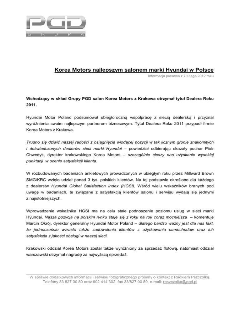 Korea Motors najlepszym salonem marki Hyundai w Polsce Informacja prasowa z 7 lutego 2012 roku Wchodzący w skład Grupy PGD salon Korea Motors z Krakowa otrzymał tytuł Dealera Roku 2011. Hyundai Motor Poland podsumował ubiegłoroczną współpracę z siecią dealerską i przyznał wyróżnienia swoim najlepszym partnerom biznesowym. Tytuł Dealera Roku 2011 przypadł firmie Korea Motors z Krakowa. Trudno się dziwić naszej radości z osiągnięcia wiodącej pozycji w tak licznym gronie znakomitych i doświadczonych dealerów sieci marki Hyundai – powiedział odbierając okazały puchar Piotr Chwedyk, dyrektor krakowskiego Korea Motors – szczególnie cieszy nas uzyskanie wysokiej punktacji w ocenie satysfakcji klienta. W rozbudowanych badaniach ankietowych prowadzonych w ubiegłym roku przez Millward Brown SMG/KRC wzięło udział ponad 3 tys. polskich klientów. Na tej podstawie określono dla każdego z dealerstw Hyundai Global Satisfaction Index (HGSI). Wśród wielu wskaźników branych pod uwagę w badaniach, te związane z satysfakcją klientów salonu i serwisu wydają się jednymi z najistotniejszych. Wprowadzenie wskaźnika HGSI ma na celu stałe podnoszenie poziomu usług w sieci marki Hyundai. Nasza pozycja na polskim rynku staje się z roku na rok coraz mocniejsza – komentuje Marcin Okrój, dyrektor generalny Hyundai Motor Poland – dlatego bardzo ważny jest dla nas fakt, że jednocześnie wzrasta także zadowolenie klientów z użytkowania samochodów oraz ich satysfakcja z jakości obsługi w naszej sieci. Krakowski oddział Korea Motors został także wyróżniony za sprzedaż flotową, natomiast oddział warszawski otrzymał nagrodę za najwyższą sprzedaż. __________________________________________________________________________________________ W sprawie dodatkowych informacji i serwisu fotograficznego prosimy o kontakt z Radkiem Pszczółką. Telefony 33 827 00 80 oraz 602 414 302, fax 33/827 00 89, e-mail: [email protected]