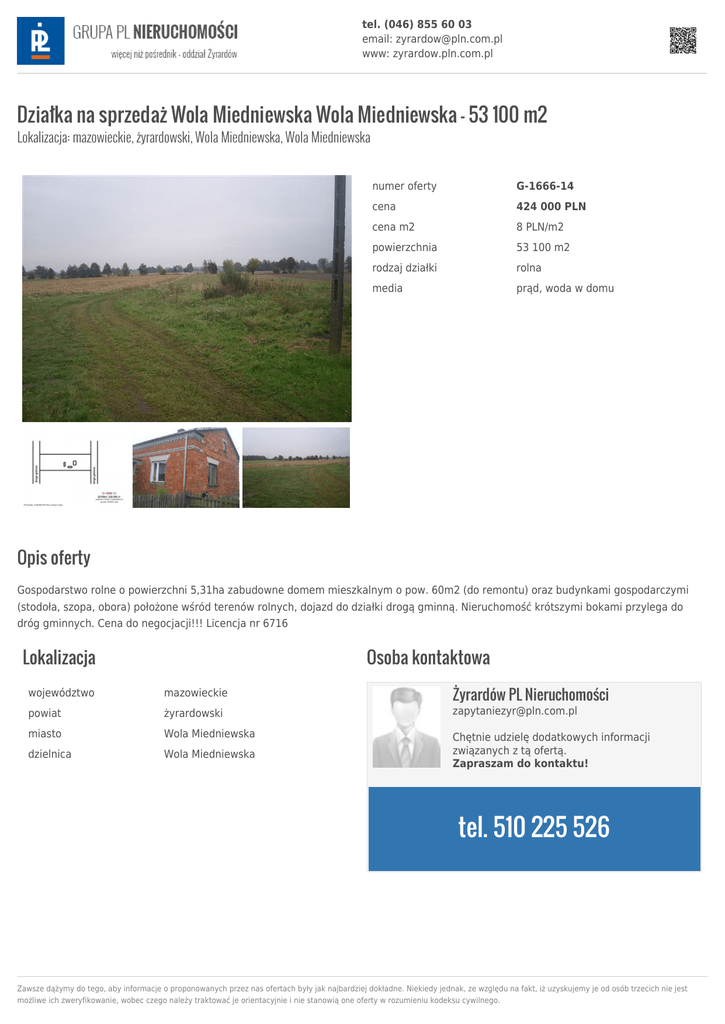 tel. (046) 855 60 03 email: [email protected] www: zyrardow.pln.com.pl Działka na sprzedaż Wola Miedniewska Wola Miedniewska - 53 100 m2 Lokalizacja: mazowieckie, żyrardowski, Wola Miedniewska, Wola Miedniewska numer oferty G-1666-14 cena 424 000 PLN cena m2 8 PLN/m2 powierzchnia 53 100 m2 rodzaj działki rolna media prąd, woda w domu Opis oferty Gospodarstwo rolne o powierzchni 5,31ha zabudowne domem mieszkalnym o pow. 60m2 (do remontu) oraz budynkami gospodarczymi (stodoła, szopa, obora) położone wśród terenów rolnych, dojazd do działki drogą gminną. Nieruchomość krótszymi bokami przylega do dróg gminnych. Cena do negocjacji!!! Licencja nr 6716 Lokalizacja Osoba kontaktowa Żyrardów PL Nieruchomości województwo mazowieckie powiat żyrardowski [email protected] miasto Wola Miedniewska dzielnica Wola Miedniewska Chętnie udzielę dodatkowych informacji związanych z tą ofertą. Zapraszam do kontaktu! tel. 510 225 526 Zawsze dążymy do tego, aby informacje o proponowanych przez nas ofertach były jak najbardziej dokładne. Niekiedy jednak, ze względu na fakt, iż uzyskujemy je od osób trzecich nie jest możliwe ich zweryfikowanie, wobec czego należy traktować je orientacyjnie i nie stanowią one oferty w rozumieniu kodeksu cywilnego.