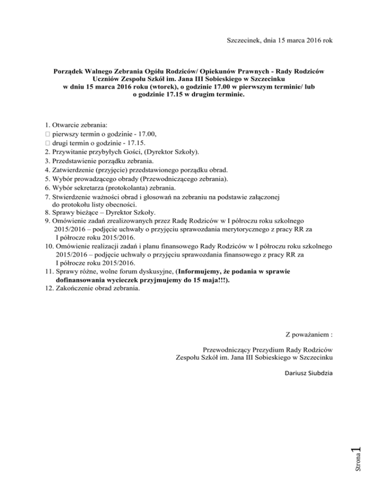 Szczecinek, dnia 15 marca 2016 rok Porządek Walnego Zebrania Ogółu Rodziców/ Opiekunów Prawnych - Rady Rodziców Uczniów Zespołu Szkół im. Jana III Sobieskiego w Szczecinku w dniu 15 marca 2016 roku (wtorek), o godzinie 17.00 w pierwszym terminie/ lub o godzinie 17.15 w drugim terminie. 1. Otwarcie zebrania: - 17.00, - 17.15. 2. Przywitanie przybyłych Gości, (Dyrektor Szkoły). 3. Przedstawienie porządku zebrania. 4. Zatwierdzenie (przyjęcie) przedstawionego porządku obrad. 5. Wybór prowadzącego obrady (Przewodniczącego zebrania). 6. Wybór sekretarza (protokolanta) zebrania. 7. Stwierdzenie ważności obrad i głosowań na zebraniu na podstawie załączonej do protokołu listy obecności. 8. Sprawy bieżące – Dyrektor Szkoły. 9. Omówienie zadań zrealizowanych przez Radę Rodziców w I półroczu roku szkolnego 2015/2016 – podjęcie uchwały o przyjęciu sprawozdania merytorycznego z pracy RR za I półrocze roku 2015/2016. 10. Omówienie realizacji zadań i planu finansowego Rady Rodziców w I półroczu roku szkolnego 2015/2016 – podjęcie uchwały o przyjęciu sprawozdania finansowego z pracy RR za I półrocze roku 2015/2016. 11. Sprawy różne, wolne forum dyskusyjne, (Informujemy, że podania w sprawie dofinansowania wycieczek przyjmujemy do 15 maja!!!). 12. Zakończenie obrad zebrania. Z poważaniem : Przewodniczący Prezydium Rady Rodziców Zespołu Szkół im. Jana III Sobieskiego w Szczecinku Strona 1 Dariusz Siubdzia WAŻNE - INFORMACJA DLA RODZICÓW !!! W dniu 30.09.2015 r. (środa) o godzinie 17,00 – odbyło się Walne Zebranie Ogółu Rodziców/ Opiekunów Prawnych uczniów Zespołu Szkół im. Jana III Sobieskiego w Szczecinku, podczas którego odbyły się m.in. wybory do Rady Rodziców na rok szkolny 2015/2016. Wysokość rocznej składki na Radę Rodziców w roku szkolnym 2015/2016: 15,00 zł – za jednego ucznia, 20,00 zł – za rodzeństwo lub więcej dzieci z tej samej Rodziny. Przypominamy, że wszystkie środki zostają w Szkole i są do dyspozycji Naszych Dzieci. To tylko 1,50 zł miesięcznie zakładając 10 miesięczny okres roku szkolnego, a umożliwia wspieranie szkolnych imprez, inicjatyw oraz doposażenia w elementy, itp.; które nie mieszczą się w budżecie szkolnym. Decyzją Walnego Zebrania Rady Rodziców z dnia 30 września 2015 r. postanawia się co do wprowadzenia w roku szkolnym 2015/2016 i ustanowienia podziału procentowego kwot wpłaconych przez daną Klasę na Radę Rodziców w stosunku: a) 80% do 20%, czyli 80% wpłaconej kwoty wraca do danej klasy, zaś 20% wpłaconej kwoty pozostaje w dyspozycji Rady Rodziców, pod warunkiem tylko i wyłącznie dokonania wpłaty przez daną klasę kwoty w wysokości pełnej, tj.: 100% składki klasowej na Radę Rodziców do dnia 31 grudnia 2015 r.; b) 70% do 30%, czyli 70% wpłaconej kwoty wraca do danej klasy, zaś 30% wpłaconej kwoty pozostaje w dyspozycji Rady Rodziców, pod warunkiem, gdy wpłata od danej klasy na Radę Rodziców jest na poziomie 90 % składki klasowej na Radę Rodziców danej klasy; c) 60% do 40%, czyli 60% wpłaconej kwoty wraca do danej klasy, zaś 40% wpłaconej kwoty pozostaje w dyspozycji Rady Rodziców, pod warunkiem, gdy wpłata od danej klasy na Radę Rodziców jest na poziomie do 80 % składki klasowej na Radę Rodziców danej klasy. Informujemy, że podania w sprawie dofinansowania wycieczek przyjmujemy tylko i wyłącznie do 15 maja - ta data jest terminem ostatecznym !!! Strona 2 Ponadto Rada Rodziców przypomina, że podania o dofinansowanie przez Radę Rodziców wycieczek czy innych wydarzeń związanych z życiem szkoły należy składać najpóźniej na dwa tygodnie przed terminem realizacji.