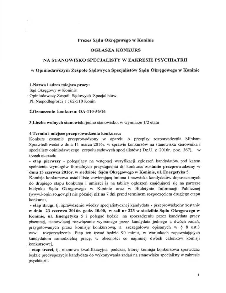 P rezes Sądu O kręgow ego w K oninie O G Ł A SZ A K O N K U R S N A S T A N O W ISK O SP E C JA L IST Y W Z A K R E SIE PSY C H IA T R II w O piniodaw czym Z esp ole Sądow ych Specjalistów Sądu O kręgow ego w K oninie l.Nazwa i adres miejsca pracy: Sąd Okręgowy w Koninie Opiniodawczy Zespół Sądowych Specjalistów PI. Niepodległości 1 ; 62-510 Konin 2,Oznaczenie konkursu: O A -l 10-56/16 3.Liczba wolnych stanowisk: jedno stanowisko, w wymiarze 1/2 etatu 4.Termin i miejsce przeprowadzenia konkursu: Konkurs zostanie przeprowadzony w oparciu o przepisy rozporządzenia Ministra Sprawiedliwości z dnia 11 marca 2016r. w sprawie konkursów na stanowiska kierownika i specjalisty opiniodawczego zespołu sądowych specjalistów ( Dz.U. z 2016r. poz. 367), w trzech etapach: - etap pierwszy - polegający na wstępnej weryfikacji zgłoszeń kandydatów pod kątem spełnienia wymogów formalnych przystąpienia do konkursu zostanie przeprowadzony w dniu 15 czerwca 2016r. w siedzibie Sądu Okręgowego w Koninie, ul. Energetyka 5. Komisja konkursowa ustali listę zawierającą imiona i nazwiska kandydatów dopuszczonych do drugiego etapu konkursu i umieści ją na tablicy ogłoszeń znajdującej się na parterze budynku Sądu Okręgowego w Koninie oraz w Biuletynie Informacji Publicznej (www.konin.so.gov.pl) nie później niż na 7 dni przed terminem rozpoczęciem drugiego etapu konkursu, - etap drugi, tj. sprawdzenie wiedzy specjalistycznej kandydata - przeprowadzony zostanie w dniu 23 czerwca 2016r. godz. 10.00, w sali nr 223 w siedzibie Sądu Okręgowego w Koninie, ul. Energetyka 5 i polegać będzie na sporządzeniu przez kandydata pracy pisemnej, stanowiącej rozwiązanie wybranego przez kandydata jednego z dwóch zadań, przygotowanych przez komisję konkursową, a szczegółowo opisanych w § 8 ust.3 w/w rozporządzenia. Etap ten trwać będzie 90 minut, w warunkach zapewniających kandydatom samodzielną pracę, w obecności co najmniej dwóch członków komisji konkursowej, - etap trzeci, tj. rozmowa kwalifikacyjna podczas, której komisja konkursowa sprawdzać będzie predyspozycje kandydata do wykonywania zadań na stanowisku specjalisty w zakresie psychiatrii. 1 5.Wymagania konieczne: a) pełna zdolność do czynności prawnych; b) posiadanie obywatelstwa polskiego lub innego, o którym mowa w art. 8 ust.2 pkt 2 ustawy z dnia 5 sierpnia 2015r. o opiniodawczych zespołach sądowych specjalistów ( Dz. U. z 2015r., poz. 1418); c) posiadanie nieposzlakowanej opinii; d) brak skazania prawomocnym wyrokiem za przestępstwo ściganie z oskarżenia publicznego lub przestępstwo skarbowe; e) brak prowadzonych postępowań o przestępstwo ścigane z oskarżenia publicznego lub przestępstwo skarbowe; f) stan zdrowia pozwalający na zatrudnienie na stanowisku specjalisty; g) prawo wykonywania zawodu lekarza i posiadanie specjalizacji z zakresu psychiatrii. 6. Dodatkowe wymagania i ewentualne atuty: a) wysoka kultura osobista; b) łatwość nawiązywania relacji z osobami poddanymi badaniom; c) łatwość formułowania wypowiedzi na piśmie; d) znajomość obsługi komputera ( zwłaszcza edytora tekstu Word); e) umiejętność pracy w zespole; ewentualnie: doświadczenie w pracy na stanowisku biegłego sądowego w zakresie psychiatrii 7.Wykaz dokumentów wymaganych od kandydata: a) wniosek o zatrudnienie na stanowisku, na które jest przeprowadzany konkurs; b) życiorys i informacja o przebiegu kariery zawodowej; c) oryginały lub urzędowo poświadczone odpisy dokumentów potwierdzających prawo wykonywania zawodu lekarza i posiadanie specjalizacji z zakresu psychiatrii; d) oświadczenie, że kandydat jest obywatelem Rzeczypospolitej Polskiej, obywatelem innego państwa członkowskiego Unii Europejskiej, państwa członkowskiego Europejskiego Porozumienia o Wolnym Handlu (EFTA) - stron umowy o Europejskim Obszarze Gospodarczym lub Konfederacji Szwajcarskiej, albo obywatelem innego państwa, jeżeli na podstawie przepisów prawa Unii Europejskiej przysługuje mu prawo podjęcia zatrudnienia lub samozatrudnienia na terytorium Rzeczypospolitej Polskiej na zasadach określonych w tych przepisach; e) oświadczenie kandydata, że ma pełną zdolność do czynności prawnych; f) oświadczenie kandydata, że nie został skazany prawomocnym wyrokiem za przestępstwo ścigane z oskarżenia publicznego lub przestępstwo skarbowe oraz, że nie jest prowadzone przeciwko niemu postępowanie o przestępstwo ścigane z oskarżenia publicznego lub przestępstwo skarbowe; g) zaświadczenie o stanie zdrowia kandydata pozwalającym na zatrudnienie na stanowisku, na którym przeprowadzany jest konkurs, wydane przez lekarza uprawnionego do przeprowadzania wstępnych, okresowych i kontrolnych badań lekarskich pracowników, na podstawie wyników badania lekarskiego, przeprowadzonego przy uwzględnieniu tego, że na stanowisku specjalisty występują zagrożenia wynikające z pracy na stanowiskach decyzyjnych i związanych z odpowiedzialnością, oraz obejmującego, jeśli lekarz 2 przeprowadzający badanie uzna to za niezbędne do prawidłowej oceny stanu zdrowia, skorzystanie z konsultacji psychologicznej; h) kwestionariusz osobowy dla osoby ubiegającej się o zatrudnienie. Dokumenty, o których mowa w pkt 7 ust. a, b, d, e, f, h winny być podpisane własnoręcznie przez kandydata. Do zgłoszenia kandydat może dołączyć dokumenty potwierdzające dodatkowe kwalifikacje i osiągnięcia. 8. Zgłoszenia do konkursu wraz z kompletem dokumentów należy składać w terminie do dnia 7 czerwca 2016r. W przypadku przesłania zgłoszenia za pośrednictwem operatora pocztowego o zachowaniu terminu decyduje data wpływu zgłoszenia. Zgłoszeń należy dokonywać pocztą na adres: Sąd Okręgowy w Koninie ul. Energetyka 5 62-510 Konin z dopiskiem O A -l 10-56/16 lub osobiście w Oddziale Administracyjnym Sądu Okręgowego w Koninie, ul. Energetyka 5, pok. 120 lub 121 Informacje dodatkowe: 1.Wszelkie braki w dokumentach