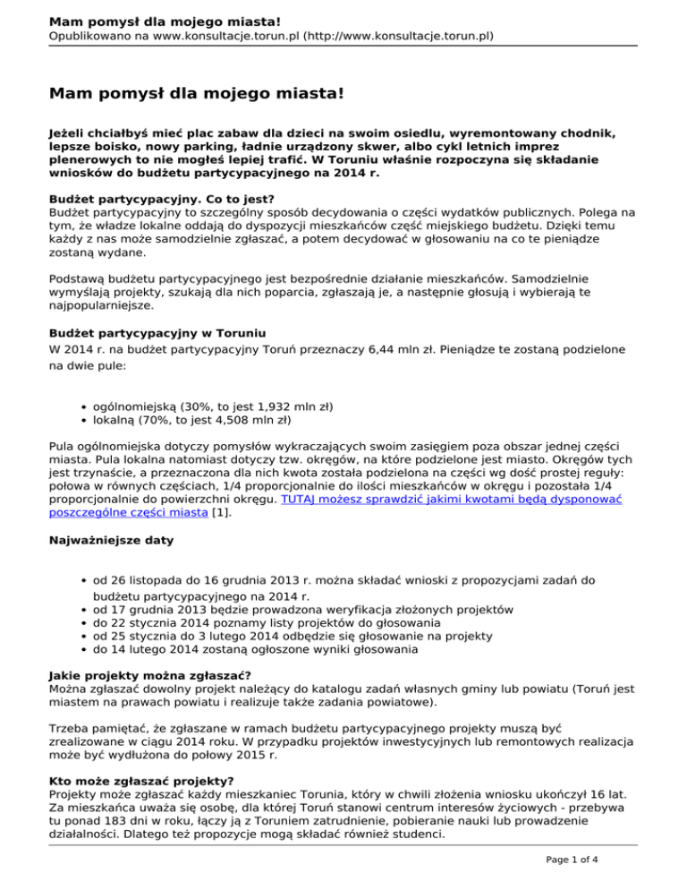 Mam pomysł dla mojego miasta! Opublikowano na www.konsultacje.torun.pl (http://www.konsultacje.torun.pl) Mam pomysł dla mojego miasta! Jeżeli chciałbyś mieć plac zabaw dla dzieci na swoim osiedlu, wyremontowany chodnik, lepsze boisko, nowy parking, ładnie urządzony skwer, albo cykl letnich imprez plenerowych to nie mogłeś lepiej trafić. W Toruniu właśnie rozpoczyna się składanie wniosków do budżetu partycypacyjnego na 2014 r. Budżet partycypacyjny. Co to jest? Budżet partycypacyjny to szczególny sposób decydowania o części wydatków publicznych. Polega na tym, że władze lokalne oddają do dyspozycji mieszkańców część miejskiego budżetu. Dzięki temu każdy z nas może samodzielnie zgłaszać, a potem decydować w głosowaniu na co te pieniądze zostaną wydane. Podstawą budżetu partycypacyjnego jest bezpośrednie działanie mieszkańców. Samodzielnie wymyślają projekty, szukają dla nich poparcia, zgłaszają je, a następnie głosują i wybierają te najpopularniejsze. Budżet partycypacyjny w Toruniu W 2014 r. na budżet partycypacyjny Toruń przeznaczy 6,44 mln zł. Pieniądze te zostaną podzielone na dwie pule: ogólnomiejską (30%, to jest 1,932 mln zł) lokalną (70%, to jest 4,508 mln zł) Pula ogólnomiejska dotyczy pomysłów wykraczających swoim zasięgiem poza obszar jednej części miasta. Pula lokalna natomiast dotyczy tzw. okręgów, na które podzielone jest miasto. Okręgów tych jest trzynaście, a przeznaczona dla nich kwota została podzielona na części wg dość prostej reguły: połowa w równych częściach, 1/4 proporcjonalnie do ilości mieszkańców w okręgu i pozostała 1/4 proporcjonalnie do powierzchni okręgu. TUTAJ możesz sprawdzić jakimi kwotami będą dysponować poszczególne części miasta [1]. Najważniejsze daty od 26 listopada do 16 grudnia 2013 r. można składać wnioski z propozycjami zadań do budżetu partycypacyjnego na 2014 r. od 17 grudnia 2013 będzie prowadzona weryfikacja złożonych projektów do 22 stycznia 2014 poznamy listy projektów do głosowania od 25 stycznia do 3 lutego 2014 odbędzie się głosowanie na projekty do 14 lutego 2014 zostaną ogłoszone wyniki głosowania Jakie projekty można zgłaszać? Można zgłaszać dowolny projekt należący do katalogu zadań własnych gminy lub powiatu (Toruń jest miastem na prawach powiatu i realizuje także zadania powiatowe). Trzeba pamiętać, że zgłaszane w ramach budżetu partycypacyjnego projekty muszą być zrealizowane w ciągu 2014 roku. W przypadku projektów inwestycyjnych lub remontowych realizacja może być wydłużona do połowy 2015 r. Kto może zgłaszać projekty? Projekty może zgłaszać każdy mieszkaniec Torunia, który w chwili złożenia wniosku ukończył 16 lat. Za mieszkańca uważa się osobę, dla której Toruń stanowi centrum interesów życiowych - przebywa tu ponad 183 dni w roku, łączy ją z Toruniem zatrudnienie, pobieranie nauki lub prowadzenie działalności. Dlatego też propozycje mogą składać również studenci. Page 1 of 4 Mam pomysł dla mojego miasta! Opublikowano na www.konsultacje.torun.pl (http://www.konsultacje.torun.pl) Ile projektów możne zgłosić jedna osoba? Jedna osoba może zgłosić maksymalnie trzy projekty: dwa do puli lokalnej (w okręgu, w którym mieszka) oraz jeden do puli ogólnomiejskiej. Tego samego projektu nie można zgłosić do dwóch pul. O wyborze puli decyduje zgłaszający. JAK ZGŁASZAĆ PROJEKTY? JEŻELI SKOŃCZYŁEŚ 16 LAT I MASZ POMYSŁ DLA TORUNIA: 1. Opisz swój projekt na specjalnym formularzu. Możesz to zrobić na dwa sposoby: - wypełnij formularz elektroniczny dostępny TUTAJ [2] lub - pobierz formularz do wypełnienia i wydruku (dostępny niżej) 2. Wydrukuj wypełniony formularz i podpisz go. 3. Znajdź 15 osób, które poprą Twój pomysł i zbierz ich podpisy. Osoby udzielające poparcia Page 2 of 4 Mam pomysł dla mojego miasta! Opublikowano na www.konsultacje.torun.pl (http://www.konsultacje.torun.pl) muszą mieć także ukończone 16 lat. 4. Jeżeli Twój pomysł wymaga zgody kogoś innego niż miasto (np. spółdzielni mieszkaniowej, na terenie której chcesz realizować swój projekt) - zdobądź od niego pisemne oświadczenie o gotowości do współpracy. 5. Przynieś kompletny wniosek wraz z listą poparcia i załącznikami (np. mapki, zdjęcia, oświadczenia, inne - jeżeli są) do Urzędu Miasta Torunia - najlepiej do Wydziału Komunikacji Społecznej i Informacji, ul. Wały gen. Sikorskiego 8, 87-100 Toruń, pok. nr 35, ale możesz też zostawić dokumenty w dowolnym Punkcie Informacyjnym UMT. MASZ CZAS DO 16 GRUDNIA 2013 R. Do pobrania: formularz, na którym należy złożyć wniosek [3] wzór listy poparcia dla projektu [4] uchwała Rady Miasta Torunia z pełnym regulaminem budżetu partycypacyjnego [5] WARTO WIEDZIEĆ! Każdy mieszkaniec, który skończył 16 lat może zgłosić maksymalnie trzy projekty: - dwa do puli lokalnej - jeden do puli ogólnomiejskiej Nie masz jeszcze 16 lat, ale masz ciekawy pomysł dla Twojego miasta? Namów rodziców, dziadków lub starszego brata czy siostrę by złożyli projekt za Ciebie! WAŻNE! Projekty zgłaszane do puli lokalnej muszą dotyczyć Twojego osiedla, np. mieszkaniec Skarpy może zgłosić dwa projekty dotyczące Skarpy i jeden dotyczący całego miasta. Jeżeli chodzi o osoby popierające Twój projekt - bez względu na to, czy pomysł jest lokalny czy ogólnomiejski - możesz ich szukać w całym mieście. Jedyny warunek - osoby popierające muszą mieć skończone 16 lat Jeżeli masz pytania: • napisz na: [email protected] [6] >>>Regulamin budżetu partycypacyjnego [7] Odnośniki: [1] http://www.torun.pl/sites/default/files/pictures/Dokumenty/budzet_party_kwoty_na_okregi_2014.pdf [2] https://www.budzet.torun.pl [3] http://www.torun.pl/sites/default/files/pictures/Dokumenty/budzet_party_formularz_wniosku_2014 Page 3 of 4 Mam pomysł dla mojego miasta! Opublikowano na www.konsultacje.toru
