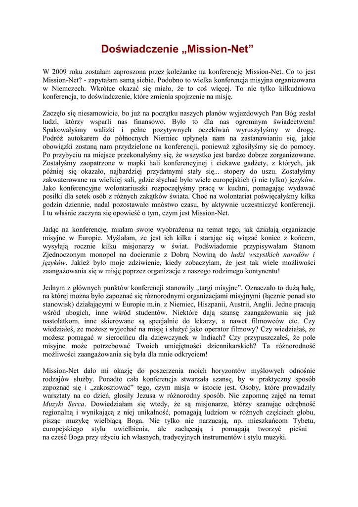 Doświadczenie „Mission-Net” W 2009 roku zostałam zaproszona przez koleŜankę na konferencję Mission-Net. Co to jest Mission-Net? - zapytałam samą siebie. Podobno to wielka konferencja misyjna organizowana w Niemczech. Wkrótce okazać się miało, Ŝe to coś więcej. To nie tylko kilkudniowa konferencja, to doświadczenie, które zmienia spojrzenie na misję. Zaczęło się niesamowicie, bo juŜ na początku naszych planów wyjazdowych Pan Bóg zesłał ludzi, którzy wsparli nas finansowo. Było to dla nas ogromnym świadectwem! Spakowałyśmy walizki i pełne pozytywnych oczekiwań wyruszyłyśmy w drogę. PodróŜ autokarem do północnych Niemiec upłynęła nam na zastanawianiu się, jakie obowiązki zostaną nam przydzielone na konferencji, poniewaŜ zgłosiłyśmy się do pomocy. Po przybyciu na miejsce przekonałyśmy się, Ŝe wszystko jest bardzo dobrze zorganizowane. Zostałyśmy zaopatrzone w mapki hali konferencyjnej i ciekawe gadŜety, z których, jak później się okazało, najbardziej przydatnymi stały się... stopery do uszu. Zostałyśmy zakwaterowane na wielkiej sali, gdzie słychać było wiele europejskich (i nie tylko) języków. Jako konferencyjne wolontariuszki rozpoczęłyśmy pracę w kuchni, pomagając wydawać posiłki dla setek osób z róŜnych zakątków świata. Choć na wolontariat poświęcałyśmy kilka godzin dziennie, nadal pozostawało mnóstwo czasu, by aktywnie uczestniczyć konferencji. I tu właśnie zaczyna się opowieść o tym, czym jest Mission-Net. Jadąc na konferencję, miałam swoje wyobraŜenia na temat tego, jak działają organizacje misyjne w Europie. Myślałam, Ŝe jest ich kilka i starając się wiązać koniec z końcem, wysyłają rocznie kilku misjonarzy w świat. Podświadomie przypisywałam Stanom Zjednoczonym monopol na docieranie z Dobrą Nowiną do ludzi wszystkich narodów i języków. JakieŜ było moje zdziwienie, kiedy zobaczyłam, Ŝe jest tak wiele moŜliwości zaangaŜowania się w misję poprzez organizacje z naszego rodzimego kontynentu! Jednym z głównych punktów konferencji stanowiły „targi misyjne”. Oznaczało to duŜą halę, na której moŜna było zapoznać się róŜnorodnymi organizacjami misyjnymi (łącznie ponad sto stanowisk) działającymi w Europie m.in. z Niemiec, Hiszpanii, Austrii, Anglii. Jedne pracują wśród ubogich, inne wśród studentów. Niektóre dają szansę zaangaŜowania się juŜ nastolatkom, inne skierowane są specjalnie do lekarzy, a nawet filmowców etc. Czy wiedziałeś, Ŝe moŜesz wyjechać na misję i słuŜyć jako operator filmowy? Czy wiedziałaś, Ŝe moŜesz pomagać w sierocińcu dla dziewczynek w Indiach? Czy przypuszczałeś, Ŝe pole misyjne moŜe potrzebować Twoich umiejętności dziennikarskich? Ta róŜnorodność moŜliwości zaangaŜowania się była dla mnie odkryciem! Mission-Net dało mi okazję do poszerzenia moich horyzontów myślowych odnośnie rodzajów słuŜby. Ponadto cała konferencja stwarzała szansę, by w praktyczny sposób zapoznać się i „zakosztować” tego, czym misja w istocie jest. Osoby, które prowadziły warsztaty na co dzień, głosiły Jezusa w róŜnorodny sposób. Nie zapomnę zajęć na temat Muzyki Serca. Dowiedziałam się wtedy, Ŝe są misjonarze, którzy szanując odrębność regionalną i wynikającą z niej unikalność, pomagają ludziom w róŜnych częściach globu, pisząc muzykę wielbiącą Boga. Nie tylko nie narzucają, np. mieszkańcom Tybetu, europejskiego stylu uwielbienia, ale zachęcają i pomagają tworzyć pieśni na cześć Boga przy uŜyciu ich własnych, tradycyjnych instrumentów i stylu muzyki. Wielkim przeŜyciem był dla mnie wywiad z Ŝoną misjonarza działającego w Turcji. Ona równieŜ była misjonarką, a od kilku lat takŜe wdową. Wtedy, na wieczornym naboŜeństwie Mission-Net, usłyszałam, jak ta młoda kobieta ze spokojem, którego świat pojąć nie moŜe, z dostojeństwem i szczerością, opowiadała o tym, o czym pamiętać musi kaŜdy z nas. Wiara w Chrystusa i bycie Jego uczniem moŜe sprawić, Ŝe stracimy nasze ziemskie ciało, ale nigdy naszego ducha. Bardzo potrzebnym i odświeŜającym doświadczeniem były dla mnie naboŜeństwa wieczorne. Do kaŜdego z nich wprowadzano kreatywny element. Drewniany krzyŜ, pod którym mogliśmy w symbolicznym geście złoŜyć swoje prośby i troski, spisane na małej kartce papieru, albo gwóźdź, który miał związek z wieczorem tematycznym, poświęconym prześladowanym chrześcijanom. KaŜdy mógł zabrać ze sobą mały kawałek ostrego i zimnego metalu, aby przypominał mu o braciach i siostrach, którzy nie mają tej wolności, co my. Do dziś trzymam go w swoim biurku. DuŜo by pisać o koncertach, inspirujących wykładach i radości, która płynęła ze wspólnego (kilkutysięcznego!) wielbienia i śpiewania na cześć naszego Pana. Gdybym to jednak zrobiła, myślałbyś Drogi Czytelniku, Ŝe wiesz juŜ wystarczająco duŜo o Mission-Net. Najlepiej jednak zostawić sobie w sercu miejsce, które jest gotowe na nowe błogosławieństwa oraz niespodzianki i samemu doświadczyć juŜ za kilka miesięcy, czym jest Mission-Net. Liliana Cieślar woluntariuszka na Mission-Net 2009