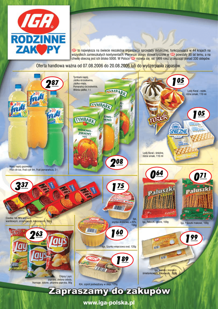 to największa na świecie niezależna organizacja sprzedaży detalicznej, funkcjonująca w 44 krajach na wszystkich zamieszkałych kontynentach. Pierwsze sklepy stowarzyszone w powstały 80 lat temu, a na chwilę obecną jest ich blisko 5000. W Polsce rozwija się. od 1999 roku, zrzeszając ponad 330 sklepów. Oferta handlowa ważna od 07.08.2006 do 20.08.2006 lub do wyczerpania zapasów. 287 105 Tymbark napój, Jabłko-brzoskwinia, Jabłko-mięta, Pomarańcz-brzoskwinia, Wiśnia-jabłko, 1 l Lody Koral - rożek, różne smaki, 110 ml 105 Hoop napój gazowany: Fruti citr ice, Fruti cytr lim, Fruti pomarańcza, 2 l 337 208 175 Ciastka: hit, hit z kremem: waniliowym, orzechowym, kokosowym, 250g 263 Iga, szynka drobiowa +20%, 156g Lody Koral - śnieżne, różne smaki, 110 ml 064 Iga, Paluszki solone, 100g 160 Chipsy Lays: papryka, zielona cebula, fromage, solone, pikantna papryka, 90g IGA, szprot podwędzany w oleju, 125g www.iga-polska.pl Iga, Paluszki makowe, 100g 199 Iga, Szynka wieprzowa oval, 120g 189 071 Iga, wafelki z kremem: śmietankowym, kakaowym, 220g Drosed, Pasztet: Podlaski, Belgijski z kury, 100g 199 199 199 Łaciate śmietanka, 10X10ML 199 199 1 Cukierki MAMBA Knorr sosy sałatkowe, różne smaki, 9g Haribo, żelki: złoty miś, cola happy, 100g 199 199 199 Nescafe frappe - display, 20g 199 Drosed, Pasztet Podlaski, 155g Cukierki Nimm2, Śmiejżelki, 100g Woseba, kawa rodzinna mielona, 250g 99 Knorr, gorący kubek, różne smaki 199 199 199 1 IGA, biszkopty z galaretką pomarańczową, 150g IGA, filet śledź w sosie pomidorowym, 170g 199 199 Knorr fix, różne smaki Margaryna Rama Classic, 500g 199 199 Herbata Saga express, 100szt. Nescafe frappe - torba, 10x20g 1 99 199 99 IGA Kasza gryczana 4x100 g IGA Kasza jęczmienna 4x100 g Aqua Minerale: gazowana, niegazowana, 1,5l 199 199 IGA, paprykarz szczeciński, 300g IGA, szprot w sosie pomidorowym, 170g Pepsi: Cola, Light, Max 7 Up, Mirinda Orange, Mountain Dew, 1,0l Alima Gerber, napój: jabł/grusz. z jog., win/man/pom/jog., win/brz/jab/jog., win/banan/jog., ger zestaw 1 koktajli/jog, 175 ml 199 199 IGA, śledź w sosie pomidorowym, 170g 199 IGA Makaron: świderek, cienka krajanka, kolanko z falbanką, krajanka, muszelka, nitka, 4x100 g Publikowane zdjęcia mogą odbiegać od wizerunku produktów dostępnych w sprzedaży. Nie ponosimy odpowiedzialności za błędy w druku i zmiany cen.