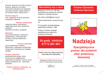 Przemoc domowa to nie tylko przemoc fizyczna. Mogą być nimi także rzeczywiste nadużycia lub zagrożenie nimi przez partnera, byłego partnera lub członka rodziny. Zalicza się tu: Przemoc fizyczna bicie, ciągnięcie za włosy, gryzienie, przypalanie, dławienie Przemoc emocjonalna nadużycia słowne, upokarzanie, ciągłe obarczanie winą, oskarżanie, poniżanie, izolwanie od rodziny i przyjaciół Dręczenie bycie obserwowanym, śledzonym, nagabywanym, niechciane listy lub smsy, rozmowy telefonicze i wiadomości Przemoc materialna bycie pozbawianym środków finansowych, odbieranie wynagrodzeń, konieczność rozliczania się z każdego wydatku Przemoc seksualna gwałt/usiłowanie gwałtu, bycie zmuszonym do oglądania lub odgrywania pornografii, uczucie, że nie można powiedzieć ‘nie’, niechciane dotykanie Przemoc domowa i seksualna są niedopuszczalne Skontaktuj się z nami Zadzwoń 01772 514 106 aby dowiedzieć się więcej lub uzyskać dostęp do naszego serwisu. Preston Domestic Violence Services lub email: [email protected] Strona internetowa: www.pdvs.org. uk W przypadku bezpośredniego zagrożenia zadzwoń: 999 Policja w Preston posiada specjalistyczny zespół d/s przemocy domowej 24 godz. infolinia 01772 201 601 Każdy może być ofiarą przemocy domowej i/lub seksualnej Nadzieja Specjalistyczna pomoc dla polskich ofiar przemocy domowej Dziękujemy Preston City Council za pomoc w sfinansowaniu tego serwisu Charity No. 1061953 - Company No. 3289949 Registered Office: 10 Oakham Court, Preston PR1 3XP Czym jest serwis Nadzieja? Serwis Nadzieja jest specjalistycznym serwisem dla polskich ofiar przemocy domowej i seksualnej. Ten serwis realizuje akcję pomocową, aby pomóc Ci poradzić sobie ze skutkami przemocy domowej. Otrzymasz wsparcie nawet wtedy, jeżeli jesteś nadal ze swoim prześladowcą. Będziesz wysłuchany, nie będziesz osądzany i nie będziemy Ci kazać co masz robić. Zaoferujemy Ci wsparcie emocjonalne i praktyczne w tym informacje na temat możliwości mieszkaniowych, planowania bezpieczeństwa i zasiłków. Ten serwis jest poufny Dopilnujemy, aby Twoje bezpieczeństwo było naszym priorytetem Jak możemy Ci pomoc? Poza wsparciem w ramach akcji pomocowej będziemy mogli także współpracować z innymi serwisami w ramach Preston Domestic Violence Services. Dopilnujemy abyś otrzymał najlepszą pomoc, odpowiednio do Twojej sytuacji. HOPE Centre jest to punkt informacyjny dla kobiet w St. John’s Shopping Centre, Lancaster Way, Preston. Otwarty jest w dni robocze od 10 rano do 3 po południu, oferując wsparcie oraz sesje terapeutyczne. Telefon: 01772 906667. Zapewnimy tłumaczenia dla naszych pozostałych serwisów. Serwis Butterfly pomoże Ci zachować twój obecny dom lub znaleźć nowy. Serwis IDVA zapewnia porady, wsparcie i przedstawia możliwości poprawy bezpieczeństwa dla ofiar przemocy domowej z grupy wysokiego ryzyka. Poszukuje on rozwiązań prawnych i wspiera ofiary podczas kryminalnych i /lub cywilnych procesów sądowych. Serwis ISVA zapewnia specjalistyczne wsparcie dla ofiar przemocy seksualnej. Serwis Schronienie zapewnia bezpieczne, tymczasowe zakwaterowanie, ze wsparciem ze strony wyszkolonego personelu, dla kobiet i ich dzieci. Serwis Sanctuary pomaga uczynić Twój dom bezpieczniejszym poprzez wstawienie dodatkowych środków bezpieczeństwa takich jak lepsze zamki i oświetlenie zewnętrzne. 24 godz. infolinia d/s przemocy domowej/seksualnej 01772 201 601