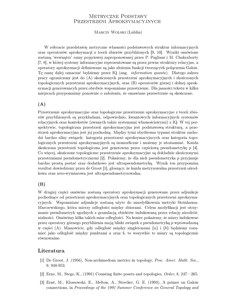 topologicznych przestrzeni aproksymacyjnych, oraz (B) operatorów górnej i dolnej aproksymacji generowancyh przez obydwie wspomniane przestrzenie. Dla jasności tekstu w kilku