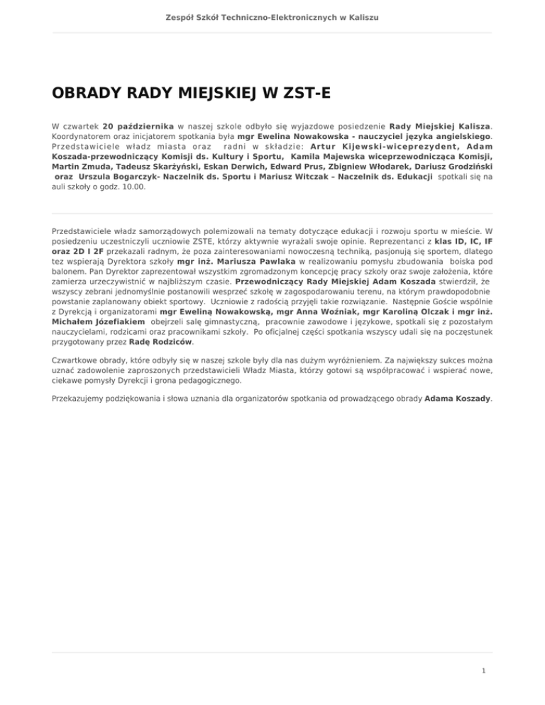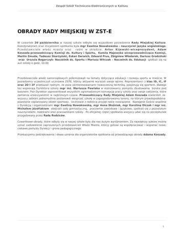 Zespół Szkół Techniczno-Elektronicznych w Kaliszu OBRADY RADY MIEJSKIEJ W ZST-E W czwartek 20 października w naszej szkole odbyło się wyjazdowe posiedzenie Rady Miejskiej Kalisza. Koordynatorem oraz inicjatorem spotkania była mgr Ewelina Nowakowska - nauczyciel języka angielskiego. Przedstawiciele władz miasta oraz radni w składzie: Artur Kijewski-wiceprezydent, Adam Koszada-przewodniczący Komisji ds. Kultury i Sportu, Kamila Majewska wiceprzewodnicząca Komisji, Martin Zmuda, Tadeusz Skarżyński, Eskan Derwich, Edward Prus, Zbigniew Włodarek, Dariusz Grodziński oraz Urszula Bogarczyk- Naczelnik ds. Sportu i Mariusz Witczak – Naczelnik ds. Edukacji spotkali się na auli szkoły o godz. 10.00. Przedstawiciele władz samorządowych polemizowali na tematy dotyczące edukacji i rozwoju sportu w mieście. W posiedzeniu uczestniczyli uczniowie ZSTE, którzy aktywnie wyrażali swoje opinie. Reprezentanci z klas ID, IC, IF oraz 2D I 2F przekazali radnym, że poza zainteresowaniami nowoczesną techniką, pasjonują się sportem, dlatego tez wspierają Dyrektora szkoły mgr inż. Mariusza Pawlaka w realizowaniu pomysłu zbudowania boiska pod balonem. Pan Dyrektor zaprezentował wszystkim zgromadzonym koncepcję pracy szkoły oraz swoje założenia, które zamierza urzeczywistnić w najbliższym czasie. Przewodniczący Rady Miejskiej Adam Koszada stwierdził, że wszyscy zebrani jednomyślnie postanowili wesprzeć szkołę w zagospodarowaniu terenu, na którym prawdopodobnie powstanie zaplanowany obiekt sportowy. Uczniowie z radością przyjęli takie rozwiązanie. Następnie Goście wspólnie z Dyrekcją i organizatorami mgr Eweliną Nowakowską, mgr Anna Woźniak, mgr Karoliną Olczak i mgr inż. Michałem Józefiakiem obejrzeli salę gimnastyczną, pracownie zawodowe i językowe, spotkali się z pozostałym nauczycielami, rodzicami oraz pracownikami szkoły. Po oficjalnej części spotkania wszyscy udali się na poczęstunek przygotowany przez Radę Rodziców. Czwartkowe obrady, które odbyły się w naszej szkole były dla nas dużym wyróżnieniem. Za największy sukces można uznać zadowolenie zaproszonych przedstawicieli Władz Miasta, którzy gotowi są współpracować i wspierać nowe, ciekawe pomysły Dyrekcji i grona pedagogicznego. Przekazujemy podziękowania i słowa uznania dla organizatorów spotkania od prowadzącego obrady Adama Koszady. 1