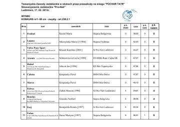 Towarzyskie Zawody Jeździeckie w skokach przez przeszkody na śniegu "PUCHAR TATR" Stowarzyszenie Jeździeckie "Pro-Nati" Ludźmierz, 17. 02. 2013r. WYNIKI KONKURS nr1- 60 cm - zwykły - art.238.2.1 koń M-ce zawodnik klub p.k. skoki czas p.k. czas p.k. razem 1 Fraktal Kuziel Maria Stajnia Baligówka 0 38,50 0 0 2 Lajana Mierzyńska Maria [J-1994] Stajnia Frydman 0 42,43 0 0 Krasoń Karolina [2001] SJ Pro-Nati Ludźmierz 0 44,47 0 0 Selnicovicova Lucia [1999] JO-MSK-Ranc Cajka SK 0 47,07 0 0 Jabcoń Jan [1996] KS Bór Toporzysko 0 47,84 0 0 3 4 5 kl/gn/old/1996/Jabot/Landella/GER? Volvo Pony Sport wł/kuc/c.gn/2003/Aksamit/Vega/Waron/M. Stański/H. Kasoń Aramis w/s/2003/Slovakia/Slovakia Hubal wł/śl/sk.gn/2001/Herb/Hala/Hałas/J. Wójtowicz/M. Sroczyński 6 Caletta Krispinsky Pavol BMM Bela-Dulice 0 47,87 0 0 7 Marco Krispinsky Pavol BMM Bela-Dulice 0 49,15 0 0 Zubek Marcin [1998] SJ Pro-Nati Ludźmierz 4 34,81 0 4 w/młp/gn/2002/Berlin Bej/Bafra/Berberys/J.Wijaszka/J.Wijaszka Gruszka Norbert Stajnia Baligówka 4 36,06 0 4 Esej Komperda Renata [1997] SJ Pro-Nati Ludźmierz 4 60,34 2 6 Haras Martyna [1997] Stajnia Baligówka 8 56,81 1 9 8 9 10 11 Felwes wł/oo/siwa/2003/Western/Felicja/Probat/S. Redestowicz/C.Guziak Benelux Galon w/sp/s/2002/Bar/Gala/Ramzes/K.Mordaka/R.Sł awecki koń M-ce Lago de Avina 2 zawodnik klub p.k. skoki czas p.k. czas p.k. razem 8 70,79 5 13 Lackova Timea [2000] JO-MSK-Ranc Cajka SK w/sp/c.gn/2004/Corde/Langusta/TopGun/J.Bob ek/R.Chrobak Zborowska Pola [1997] KS Dworna Rogoźnik el. - Hroby XVII Fryźlewicz Kamila [1997] KS Dworna Rogoźnik el. - Hroby XVII Latała Zuzanna [1996] KS Dworna Rogoźnik el. 12 - kl/gn/han/1988/Labrador/Tessa/GER/SLO Lacord kl/gn/huc/2000/Topolcanki/ kl/gn/huc/2000/Topolcanki/ Dystans (m): Szybkość (m/min): Norma (s): Ilość przeszkód: Ilość skoków: Koni startowało/ukończyło: 310 350 54 8 8 15/12 Towarzyskie Zawody Jeździeckie w skokach przez przeszkody na śniegu "PUCHAR TATR" Stowarzyszenie Jeździeckie "Pro-Nati" Ludźmierz, 17. 02. 2013r. WYNIKI KONKURS nr 2- 80 cm - zwykły - art.238.2.1 koń M-ce Benelux zawodnik klub p.k. skoki czas p.k. czas p.k. razem w/młp/gn/2002/Berlin Bej/Bafra/Berberys/J.Wijaszka/J.Wijaszka Gruszka Norbert Stajnia Baligówka 0 43,69 0 0 Fraktal Kuziel Maria Stajnia Baligówka 0 45,04 0 0 Gruszka Patrycja Stajnia Baligówka 0 45,25 0 0 Zubek Daniel [1993] SJ Pro-Nati Ludźmierz 0 47,56 0 0 Zubek Marcin [1998] SJ Pro-Nati Ludźmierz 0 48,41 0 0 kl/sp/c.gn/2004/Corde/Dworna/Akwen/J.Bobek /J.Bobek Dudzik Karolina KS Dworna Rogoźnik 0 48,53 0 0 7 Enzo Jurcova Viktoria [1992] JO-MSK-Ranc Cajka SK 0 50,94 0 0 8 Lago de Avina 2 Tokarcikova Dominika [1993] JO-MSK-Ranc Cajka SK 0 51,91 0 0 Strzelczyk Rafał KS Bór Toporzysko 0 52,87 0 0 1 2 3 4 5 6 Nastia kl/sp/c.gn/2000/Gaidor/Neryta/Nordyk/I.Ćwik/I .M.Ćwik Espris kl/hann/2000/DeNiro/Eclipse/GER/ Felwes wł/oo/siwa/2003/Western/Felicja/Probat/S. Redestowicz/C.Guziak Dobrawa w/gn/st/2005/Slovacja/Slovacja kl/gn/han/1988/Labrador/Tessa/GER/SLO Mała Mi 9 kl/kuc/gn/2002/Jowisz/Mona/Mirza/D. WaligórskiK.Waligórska 10 Caletta Krispinsky Pavol BMM Bela-Dulice 0 55,38 0 0 11 Hialit Kwaśnik Natalia [J-1994] KS Dworna Rogoźnik 0 56,21 0 0 Adamaczyk Aleksandra KS Bór Toporzysko 0 56,88 0 0 w/xo/kaszt/1994/Hipowit/Mikora/Lukan/POL/ Elba 12 kl/mlp/gn/1997/AftonBej/Eria/POL/D. Waliogórski koń M-ce zawodnik klub p.k. skoki czas p.k. czas p.k. razem Szentivanyiova Michaela [1998] JO-MSK-Ranc Cajka SK 0 59,31 0 0 Krispinsky Pavol BMM Bela-Dulice 0 60,84 0 0 Latała Zuzanna [1996] KS Dworna Rogoźnik 0 65,60 1 1 kl/sp/s/2006/Silver Dream/Persja/erset/J.Wszołek/Z.Filipe Kowalczyk Andrzej KS Bór Toporzysko 4 40,66 0 4 17 Kata Mach Małgorzata [1999] Stajnia Lider Wróblówka 4 47,84 0 4 18 Casio Jurcova Viktoria [1992] JO-MSK-Ranc Cajka SK 8 50,50 0 8 w/sp/s/2002/Bar/Gala/Ramzes/K.Mordaka/R.Sł awecki Haras Martyna [1997] Stajnia Baligówka 12 55,53 0 12 Esej Komperda Renata [1997] SJ Pro-Nati Ludźmierz 16 94,38 9 25 Majewska Ilona [1994] Stajnia Frydman 13 Aramis 14 Marco 15 w/s/2003/Slovakia/Slovakia Lacord w/sp/c.gn/2004/Corde/Langusta/TopGun/J.Bob ek/R.Chrobak Pianola 16 19 20 - kl/t.gor/gn/2001/NN/NN/NN/NN/A.Mach w/st/gn/2005./Slovacja/Slovacja Galon Larmena kl/sp/c.gn/1996/CottonClub/Lascala/Leoncio/P OL/M.Wnęk Dystans (m): Szybkość (m/min): Norma (s): Ilość przeszkód: Ilość skoków: Koni startowało/ukończyło: 360 350 62 9 9 21/20 el. Towarzyskie Zawody Jeździeckie w skokach przez przeszkody na śniegu "PUCHAR TATR" Stowarzyszenie Jeździeckie "Pro-Nati" Ludźmierz, 17. 02. 2013r. WYNIKI KONKURS nr 3 - 100 cm – zwykły z rozgrywką - art. 238.2.2 rozgrywka koń M-ce Łotysz Top zawodnik klub p.k. skoki czas p.k. czas p.k. razem p.k. skoki czas p.k. czas p.k. razem Przybyś Bartłomiej KS Bór Toporzysko 0 59,22 0 0 0 32,78 0 0 Kwaśnik Natalia [J-1994] KS Dworna Rogoźnik 0 55,25 0 0 0 35,15 0 0 Jurcova Viktoria [1992] JO-MSK-Ranc Cajka SK 0 56,66 0 0 0 35,44 0 0 Kowalczyk Andrzej KS Bór Toporzysko 0 58,25 0 0 4 32,38 0 4 Dudzik Karolina KS Dworna Rogoźnik 4 57,28 0 4 kl/sp/c.gn/1996/CottonClub/Lascala/Leoncio/PO L/M.Wnęk Majewska Ilona [1994] Stajnia Frydman 4 59,12 0 4 7 Caletta Krispinsky Pavol BMM Bela-Dulice 4 61,12 0 4 8 Marco Krispinsky Pavol BMM Bela-Dulice 4 69,65 1 5 9 Casio Jurcova Viktoria [1992] JO-MSK-Ranc Cajka SK 8 58,56 0 8 kl/sp/c.gn/2000/Gaidor/Neryta/Nordyk/I.Ćwik/I. M.Ćwik Gruszka Patrycja Stajnia Baligówka 12 58,78 0 12 Enzo Jurcova Viktoria [1992] JO-MSK-Ranc Cajka SK el wł/oo/siwa/2003/Western/Felicja/Probat/S. Redestowicz/C.Guziak Zubek Marcin [1998] SJ Pro-Nati Ludźmierz el. Espris Zubek Daniel [1993] SJ Pro-Nati Ludźmierz rez 1 w/sp/c.gn/2002/Czuwaj/Ładna/Łowicz I/D.Waligórski/K.Waligórska 2 Hialit 3 Lago de Avina 2 w/xo/kaszt/1994/Hipowit/Mikora/Lukan/POL/ kl/gn/han/1988/Labrador/Tessa/GER/SLO Pianola 4 5 6 10 - - - kl/sp/s/2006/Silver Dream/Persja/erset/J.Wszołek/Z.Filipe Dobrawa kl/sp/c.g