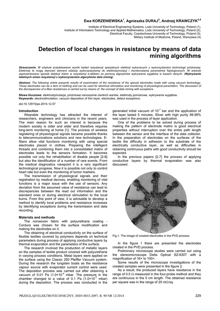 Ewa KORZENIEWSKA1, Agnieszka DURAJ2, Andrzej KRAWCZYK3,4 Institute of Electrical Engineering Systems, Lodz University of Technology, Poland (1), Institute of Information Technology and Applied Mathematics, Lodz University of Technology, Poland (2), Electrical Faculty, Czestochowa University of Technology, Poland (3), Military Institute of Medicine, Poland, Warszawa (4) Detection of local changes in resistance by means of data mining algorithms Streszczenie. W artykule przedstawiono wyniki badań rezystancji specjalnych elektrod wykonanych z wykorzystaniem technologii próżniowej. Elektrody te mogą stanowić element odzieży wykorzystywanej do elektrostymulacji i monitorowania parametrów fizjologicznych. W artykule zaprezentowano sposób detekcji różnic w rezystancji e-włókien za pomocą algorytmów wykrywania wyjątków w bazach danych. (Wykrywanie lokalnych zmian rezystancji z wykorzystaniem algorytmów data mining). Abstract. The following article presents results of examination of the resistance of the special electrodes made with using vacuum technology. These electrodes can be a item of clothing and can be used for electrical stimulation and monitoring of physiological parameters. The discussion of the discrepancies of e-fiber resistances is carried out by means of the concept of data mining with exceptions. Słowa kluczowe: elektrostymulacja, próżniowe nanoszenie cienkich warstw, elektrody pomiarowe, wykrywanie wyjątków. Keywords: electrostimulation, vacuum deposition of thin layer, electrodes, detect exceptions. doi:10.12915/pe.2014.12.57 Introduction Wearable technology has attracted the interest of researchers, engineers and clinicians in the recent years. The main reason for such an interest is because the modern society is older and older and therefore requires long-term monitoring at home [1]. The process of wireless registering of physiological signals became possible thanks to telecommunications solutions and new technologies. Efibers allow vital functions monitoring with using special electrodes placed in clothes. Preparing the intelligent threads and combining them into a consolidated matrix of electrodes leads to the sensors formation. It becomes possible not only the rehabilitation of disable people [2-6] but also the identification of a number of rare events. From the medical diagnostics viewpoint it is a very significant technological progress. Now it is possible not only to control heart rate but even the monitoring of tumor markers. The transmission of physiological signals and their registration by medical devices, enabling monitoring of vital functions is a major issue with the use of sensors. Any deviation from the assumed value of resistance can lead to discrepancies between the read out information and the standard ones or during electrical stimulation to the local burns. From this point of view, it is advisable to develop a method to identify local problems and resistance increases by identifying exceptions during the transmission and data recording. Materials and methods The nonwoven fabric with polyurethane coating Cordura was chosen for the surface modification and making the electrodes on it. The obtaining of electrical conductivity on the surface of flexible textiles covered by polymers depends on technical parameters during process of applying conductive layers by thermal evaporation and the parameters of the surface. The research involved the production of metallic layers on the samples of textile product covered with polyurethane in varying process conditions. Metal layers were applied on the surface using the Classic 250 Pfeiffer Vacuum system. During the research the tungsten boats as the resistance vapour source with evaporator current control were used. The deposition process was carried out after obtaining a vacuum of 0.01 Pa (1.0×10-4 mbar. The pressure in the chamber changed to a value of 0.1 Pa (1.0×10-3 mbar) during the deposition. The process was conducted in the -7 generated initial vacuum of 10 bar and the application of the layer lasted 5 minutes. Silver with high purity 99.99% was used in the process of layer application. One of the problems to be solved during process of making the pattern of electrode matrix is good electrical properties without interruption over the entire path length between the sensor and the interface of the data collector. In the preparation of electrodes on the surfaces of the textile the difficulty in adhesion to the substrate of the electrically conductive layer, as well as difficulties in obtaining continuous paths with good conductivity should be expected. In the previous papers [2,7] the process of applying conductive layers by thermal evaporation was also discussed. Fig.1. The image of created electrodes in the PVD process. In the figure 1 there are presented the electrodes created in the PVD process. Preliminary microscope studies were carried out using the stereomicroscope Delta Optical SZ-630T with a magnification of 16× to 100×. Some results of the microscope investigations of the created samples were presented in the figure 2. As a result, the produced layers have resistance in the range of 0.5 measured in the four-probe method and they are continuous in the 5 cm length. The obtained resistance per square was in the range of 25 msq. PRZEGLĄD ELEKTROTECHNICZNY, ISSN 0033-2097, R. 90 NR 12/2014 229 (1) R 1 U 23 U 23 2 I14 I 41 where R – measured resistance, U - measured voltage drop between the pair of 2 and 3 electrodes, I - forced current between measuring electrodes i.e. 1 and 4 or 4 and 1. a) a) b) b) Fig.3. a) Scheme of the manufactured electrodes with measuring probes; b) The value of resistivity measured in the four-probe method of resistance measurement presented in figure 3a. c) Fig.2. Microscopic images showing a) the textile used as the surface for making the electroconductive layer (magnification 40x) b) the path of electro-conductive layer (Ag) on the fabric covered with pol