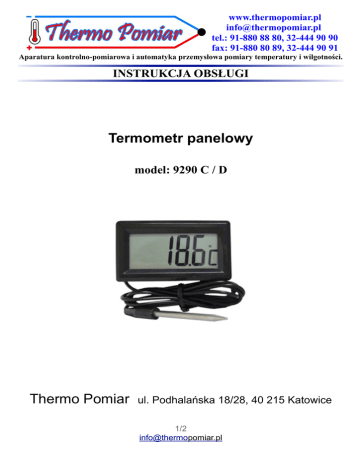 www.thermopomiar.pl [email protected] tel.: 91-880 88 80, 32-444 90 90 fax: 91-880 80 89, 32-444 90 91 Aparatura kontrolno-pomiarowa i automatyka przemysłowa pomiary temperatury i wilgotności. INSTRUKCJA OBSŁUGI Termometr panelowy model: 9290 C / D Thermo Pomiar ul. Podhalańska 18/28, 40 215 Katowice 1/2 [email protected] Dane techniczne Zakres -50...150°C model C; -50...300°C model D Dokładność ±1,0°C Rozdzielczość 0,1°C w całym zakresie Wyświetlacz LCD 48x22mm wysokość cyfry 18 mm Próbkowanie co 1s Sonda NTC stal nierdzewna Ø3,5mm L= 45 mm + przewód PCV 1 m Temperatura pracy obudowa: -10...40°C; max 90%RH bez kondensacji Obudowa tworzywo sztuczne ABS, z tyłu przyssawka Zasilanie bateria LR44 1,5 V Wymiary / Masa 62x36,5x14 mm / 30g Certyfikat bezpieczeństwo i EMC (oznakowanie CE) podlega dyrektywie WEEE 2002/96/EC (Utylizacja) Zastosowanie Rolnictwo, motoryzacja, fotografia, przechowywanie i przygotowywanie żywności, chłodnictwo, farmacja, laboratoria, centralne ogrzewanie. Funkcje On/Off –włącz/wyłącz MIN/MAX – odczyt min/max temp. Zapamiętanej podczas dokonanego pomiaru HI/LOW - funkcja alarmu Ustawianie temperatury alarmu -ustawienie górnego alarmu należy nacisnąć przycisk HI Alarm - na wyświetlaczu pokaże się temperatura (-50)°C i będzie wzrastać do (+150/300)°C, gdy temperatura na wyświetlaczu osiągnie zakładaną przez nas wartość zwolnić przycisk. Gdy badana temperatura przekroczy nastawiona wartość alarmową co 1 minutę termometr będzie wydawał sygnały dźwiękowy. -przyciskiem LOW Alarm identycznie jak HI Alarm ustawiamy dolną temperaturę alarmu, z tym, że termometr będzie informował nas o spadku temperatury poniżej zaprogramowanej. -Termometr wyłączamy przyciskiem ON/OFF. Środki ostrożności -aby uzyskać najlepsze wyniki koniec sondy należy zanurzyć na minimum 10 mm w badanej substancji. -wyjmować baterie na czas przechowywania termometru, jeśli nie będzie używany przez nas dłużej - termometr nie może być używany ani umieszczany w piecu lub kuchence mikrofalowej 2/2
