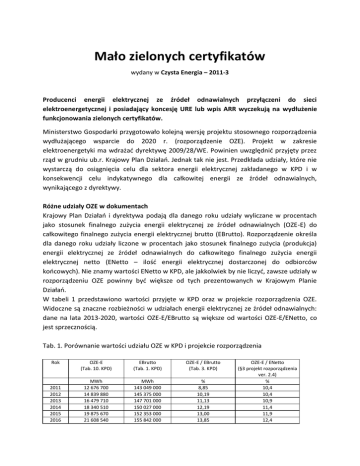 Mało zielonych certyfikatów wydany w Czysta Energia – 2011-3 Producenci energii elektrycznej ze źródeł odnawialnych przyłączeni do sieci elektroenergetycznej i posiadający koncesję URE lub wpis ARR wyczekują na wydłużenie funkcjonowania zielonych certyfikatów. Ministerstwo Gospodarki przygotowało kolejną wersję projektu stosownego rozporządzenia wydłużającego wsparcie do 2020 r. (rozporządzenie OZE). Projekt w zakresie elektroenergetyki ma wdrażać dyrektywę 2009/28/WE. Powinien uwzględnić przyjęty przez rząd w grudniu ub.r. Krajowy Plan Działań. Jednak tak nie jest. Przedkłada udziały, które nie wystarczą do osiągnięcia celu dla sektora energii elektrycznej zakładanego w KPD i w konsekwencji celu indykatywnego dla całkowitej energii ze źródeł odnawialnych, wynikającego z dyrektywy. Różne udziały OZE w dokumentach Krajowy Plan Działań i dyrektywa podają dla danego roku udziały wyliczane w procentach jako stosunek finalnego zużycia energii elektrycznej ze źródeł odnawialnych (OZE-E) do całkowitego finalnego zużycia energii elektrycznej brutto (EBrutto). Rozporządzenie określa dla danego roku udziały liczone w procentach jako stosunek finalnego zużycia (produkcja) energii elektrycznej ze źródeł odnawialnych do całkowitego finalnego zużycia energii elektrycznej netto (ENetto – ilość energii elektrycznej dostarczonej do odbiorców końcowych). Nie znamy wartości ENetto w KPD, ale jakkolwiek by nie liczyć, zawsze udziały w rozporządzeniu OZE powinny być większe od tych prezentowanych w Krajowym Planie Działań. W tabeli 1 przedstawiono wartości przyjęte w KPD oraz w projekcie rozporządzenia OZE. Widoczne są znaczne rozbieżności w udziałach energii elektrycznej ze źródeł odnawialnych: dane na lata 2013-2020, wartości OZE-E/EBrutto są większe od wartości OZE-E/ENetto, co jest sprzecznością. Tab. 1. Porównanie wartości udziału OZE w KPD i projekcie rozporządzenia Rok 2011 2012 2013 2014 2015 2016 OZE-E (Tab. 10. KPD) EBrutto (Tab. 1. KPD) OZE-E / EBrutto (Tab. 3. KPD) MWh 12 676 700 14 839 880 16 479 710 18 340 510 19 875 670 21 608 540 MWh 143 049 000 145 375 000 147 701 000 150 027 000 152 353 000 155 842 000 % 8,85 10,19 11,13 12,19 13,00 13,85 OZE-E / ENetto (§3 projekt rozporządzenia ver. 2.4) % 10,4 10,4 10,9 11,4 11,9 12,4 Rok OZE-E (Tab. 10. KPD) EBrutto (Tab. 1. KPD) OZE-E / EBrutto (Tab. 3. KPD) 2017 2018 2019 2020 23 376 300 25 411 550 27 830 590 32 401 180 159 331 000 162 820 000 166 309 000 169 798 000 14,68 15,64 16,78 19,13 OZE-E / ENetto (§3 projekt rozporządzenia ver. 2.4) 12,9 13,4 13,9 14,4 Propozycja korekty udziałów OZE Aby właściwie określić udziały w projekcie rozporządzenia OZE należy podać finalne zużycie energii elektrycznej netto (ENetto), a wartości OZE-E przyjąć z KPD. W ubiegłym roku Ministerstwo Gospodarki przedłożyło do konsultacji społecznych projekt innego rozporządzenia, które określało obowiązki dla świadectw pochodzenia z kogeneracji, zwane dalej projektem rozporządzenia CHP (wersja z 30 lipca 2010 r.). Określa ono obowiązki dla certyfikatów tzw. czerwonych, żółtych i fioletowych. Dla tych ostatnich do 2018 r. W uzasadnieniu do projektu rozporządzenia CHP przedłożono finalne zużycie energii elektrycznej netto na lata 2010-2018 (ENetto). Na tej podstawie w tabeli 2 wyznaczono właściwe wartości udziałów do przedstawienia w rozporządzeniu OZE. Tab. 2. Właściwe udziały OZE, jakie powinny znaleźć się w rozporządzeniu Rok 2011 2012 2013 2014 2015 2016 2017 2018 2019 2020 ENetto (str. 31 uzasadnienie do projektu rozporządzenia CHP) MWh 106 720 000 108 840 000 110 960 000 113 080 000 115 200 000 118 320 000 121 440 000 124 560 000 brak danych brak danych OZE-E/ENetto wartości właściwe dla §3 projektu rozporządzenia OZE % 11,9 13,6 14,9 16,2 17,3 18,3 19,2 20,4 --- Przyjmując tendencję stałego wzrostu ENetto, można wyliczyć, że wartości ENetto w latach 2019 i 2020 wyniosą odpowiednio: 127 680 000 MWh (2019 r.) i 130 800 000 MWh (2020 r.), z czego otrzymamy żądane wartości obowiązków na lata 2019 i 2020 w projekcie rozporządzenia OZE: 21,8% w 2019 r. i 24,8% w 2020 r. Wypełnienie przedkładanych obowiązków w rozporządzeniu OZE może przybliżyć Polskę do wypełnienia celów dyrektywy. Do pełniejszej implementacji dyrektywy potrzebne jest zagwarantowanie wsparcia inwestycjom oddawanym do użytku, których pełna amortyzacja przypada także po 2020 r. W celu uzyskania stabilności systemów wsparcia powinny one funkcjonować przez okres co najmniej 15 lat dla każdej inwestycji oddzielnie po oddaniu do użytku. Dlatego należy przyspieszyć prace nad ustawą o odnawialnych źródłach energii, która zmodernizuje system wsparcia dla wszystkich jej sektorów. PIGEO apeluje, aby rząd pilnie podjął działania zachęcające inwestorów do realizacji projektów OZE, by nie stało się tak jak w przypadku dyrektywy 2001/77/WE, której celu na 2010 r. Polska nie wypełniła. Priorytetem powinna być efektywność energetyczna, bo rozliczenie dotyczy nie liczby mocy wytwórczych, tylko ilości wyprodukowanej i zużytej energii ze źródeł odnawialnych. Michał Ćwil, Dyrektor PIGEO
