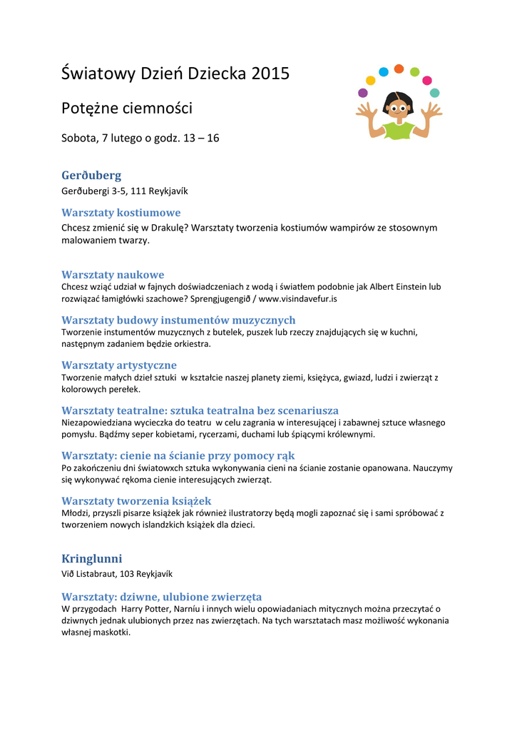 Światowy Dzień Dziecka 2015 Potężne ciemności Sobota, 7 lutego o godz. 13 – 16 Gerðuberg Gerðubergi 3-5, 111 Reykjavík Warsztaty kostiumowe Chcesz zmienić się w Drakulę? Warsztaty tworzenia kostiumów wampirów ze stosownym malowaniem twarzy. Warsztaty naukowe Chcesz wziąć udział w fajnych doświadczeniach z wodą i światłem podobnie jak Albert Einstein lub rozwiązać łamigłówki szachowe? Sprengjugengið / www.visindavefur.is Warsztaty budowy instumentów muzycznych Tworzenie instumentów muzycznych z butelek, puszek lub rzeczy znajdujących się w kuchni, następnym zadaniem będzie orkiestra. Warsztaty artystyczne Tworzenie małych dzieł sztuki w kształcie naszej planety ziemi, księżyca, gwiazd, ludzi i zwierząt z kolorowych perełek. Warsztaty teatralne: sztuka teatralna bez scenariusza Niezapowiedziana wycieczka do teatru w celu zagrania w interesującej i zabawnej sztuce własnego pomysłu. Bądźmy seper kobietami, rycerzami, duchami lub śpiącymi królewnymi. Warsztaty: cienie na ścianie przy pomocy rąk Po zakończeniu dni światowxch sztuka wykonywania cieni na ścianie zostanie opanowana. Nauczymy się wykonywać rękoma cienie interesujących zwierząt. Warsztaty tworzenia książek Młodzi, przyszli pisarze książek jak również ilustratorzy będą mogli zapoznać się i sami spróbować z tworzeniem nowych islandzkich książek dla dzieci. Kringlunni Við Listabraut, 103 Reykjavík Warsztaty: dziwne, ulubione zwierzęta W przygodach Harry Potter, Narníu i innych wielu opowiadaniach mitycznych można przeczytać o dziwnych jednak ulubionych przez nas zwierzętach. Na tych warsztatach masz możliwość wykonania własnej maskotki. Warsztaty: kaligrafia i sztuka pisania Naucz się pisać pismem kaligraficznym. Czy nie byłoby fajnie poznać to stare pismo i napisać do swego przyjaciela coś, co tylko niektórzy rozumieją? Spönginni Spönginn 41, 112 Reykjavík Warsztaty tworzenia swojej własnej flagi Na warsztatch każda osoba będzie miała możliwość wykonania swojej własnej flagi z zastosowaniem flag świata jako natchnienia. Warsztaty pisania listów Na warsztatch można nauczyć się i napisać swój list do rodziny i znajomych. Prawdziwa skrzynka pocztowa będzie na miejscu! Swiatła świata Przyjdź i zaprojektuj swój własny świat świetlny, który później wraz z innymi stworzy światło ziemi. Sólheimar Sólheimum 27, 104 Reykjavík Warsztaty malarskie Wszyscy młodzi malarze mogą wziąć udział w warsztatach i namalować obraz na płótnie w stylu wielkich artystów. Warsztaty wykonywania masek Czasami przyjemnym jest schowanie twarzy za maską. Wykonaj własną maskę i stań się stworzeniem ze swojej wyobraźni.