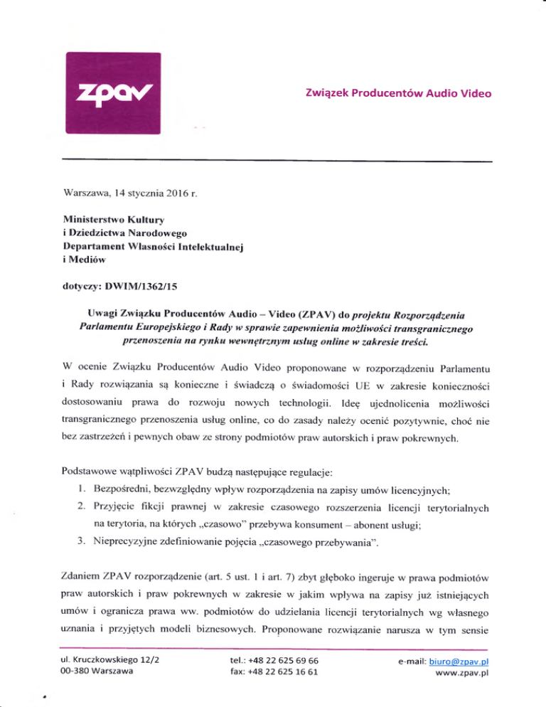 zposz Związek Producentów Audio Video Warszawa, 14 stycznia 2016 r. Ministerstwo Kultury i Dziedzictwa Narodowego Departament Własności Intelektualnej i Mediów dotyczy: DWIM/1362/15 Uwagi Związku Producentów Audio —Video (ZPAV) do projektu Rozporządzenia arlamentu Europejskiego i Rady wsprawie zapewnienia możliwości transgraniczne przenoszenia na rynku wewnętrznym usług online w zakresie treści. W ocenie Związku Producentów Audio Video proponowane w rozporządzeniu Parlamentu i Rady rozwiązania są konieczne i świadczą o świadomości UE w zakresie konieczności dostosowaniu prawa do rozwoju nowych technologii. Ideę ujednolicenia możliwości transgranicznego przenoszenia usług online, co do zasady należy ocenić pozytywnie, choć nie bez zastrzeżeń i pewnych obaw ze strony podmiotów praw autorskich i praw pokrewnych. Podstawowe wątpliwości ZPAV budzą następujące regulacje: 1. Bezpośredni, bezwzględny wpływ rozporządzenia na zapisy umów licencyjnych; 2. Przyjęcie fikcji prawnej w zakresie czasowego rozszerzenia licencji terytorialnych na terytoria, na których „czasowo” przebywa konsument - abonent usługi; 3. Nieprecyzyjne zdefiniowanie pojęcia „czasowego przebywania”. Zdaniem ZPAV rozporządzenie (art. 5 ust. 1 i art. 7) zbyt głęboko ingeruje w prawa podmiotów praw autorskich i praw pokrewnych w zakresie w jakim wpływa na zapisy już istniejących umów i ogranicza prawa ww. podmiotów do udzielania licencji terytorialnych wg własnego uznania i przyjętych modeli biznesowych. Proponowane rozwiązanie narusza w tym sensie ul. Kruczkowskiego 12/2 00-380 Warszawa tel.: +48 22 625 69 66 fax: +48 22 625 16 61 e-mail: biuro(5>zpav.pl www.zpav.pl pewne podstawowe i niekwestionowane prawa wynikające z przepisów prawa autorskiego. Zdaniem ZPAV należałoby zważyć pod tym kątem przewidywane korzyści jakie regulacja przyniesie konsumentom i ewentualne deficyty jakie mogą wystąpić po stronie sektora kreatywnego. W ścisłym związku z powyższym pozostaje opisany w motywach (20) i (21) zamysł wprowadzenia fikcji prawnej w zakresie rozszerzenia licencji terytorialnych. Należy zauważyć, że podobnie jak wyżej rozwiązanie to ingeruje w podstawowe prawa podmiotów prawa autorskiego i praw pokrewnych, ale dodatkowo może sprzyjać także nadużyciom. Ceny dostępu do przedmiotów praw autorskich i pokrewnych kształtowane są w zależności od specyfiki rynku i często różnią się w poszczególnych państwach UE. Nie jest zupełnie nieprawdopodobne, że po wprowadzeniu zaproponowanych przepisów i rozszerzeniu usług dostępu do treści działalność rozpoczną podmioty świadczące usługi pośredniczące w zakupie dostępu do usług w krajach, w których dostęp np. do filmów, czy muzyki jest relatywnie najniższy. Dla sektora kreatywnego może to oznaczać początkowy spadek dochodów, a w konsekwencji wzrost cen dostępu do treści wywołany ekonomiczną potrzebą ich zrównania z cenami najwyższymi na rynku europejskim. Ściśle w kontekście powyższych obaw uzasadniony niepokój właścicieli praw budzi niedookreślenie pojęcia „czasowego przebywania”. Otwarty rynek pracy UE sprzyja znacznym migracjom konsumentów usług dostępu do treści, a co za tym idzie często „czasowe przebywanie” na terytorium danego państwa może okazać się już stałym pobytem. Rozporządzenie w tym zakresie nie daje uprawnionym poczucia należytego zabezpieczenia ich praw; de facto proponowana fikcja prawna może oznaczać, że każdorazowo licencja udzielona na terytorium jednego z państw będzie rozciągała się bez ograniczeń na terytorium całej UE. Zaproponowana ranga komentowanego aktu prawnego, jako legislacji mającej wywołać jednoczesny i jednolity skutek we wszystkich krajach UE jest w pełni zrozumiała i akceptowalna. Z poważaniem, Adwokat Mikołaj Woj tal Pełnomocnik ZPAY ul. Kruczkowskiego 12/2 00-380 Warszawa tel.: +48 22 622 92 19 fax: +48 22 625 16 61 e-mail: [email protected] www.zpav.pl