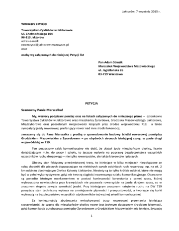 Jaktorów, 7 września 2015 r. Wnoszący petycję: Towarzystwo Cyklistów w Jaktorowie Ul. Chełmońskiego 104 96-313 Jaktorów adres e-mail: [email protected] oraz osoby wg załączonych do niniejszej Petycji list Pan Adam Struzik Marszałek Województwa Mazowieckiego ul. Jagiellońska 26 03-719 Warszawa PETYCJA Szanowny Panie Marszałku! My, wszyscy podpisani poniżej oraz na listach załączonych do niniejszego pisma – członkowie Towarzystwa Cyklistów w Jaktorowie oraz mieszkańcy Żyrardowa, Grodziska Mazowieckiego, Jaktorowa, Międzyborowa oraz pozostałych miejscowości leżących przy drodze wojewódzkiej 719, a także sympatycy jazdy rowerowej, preferujący rower nad inne środki lokomocji, zwracamy się do Pana Marszałka z prośbą o spowodowanie budowy ścieżki rowerowej pomiędzy Grodziskiem Mazowieckim a Żyrardowem – po obydwóch stronach istniejącej szosy, w pasie drogi wojewódzkiej nr 719. Ten poszerzony szlak komunikacyjny nie dość, że ułatwi życie mieszkańcom okolicy, licznie dojeżdżającym m.in. do pracy i szkoły, to jeszcze wpłynie na poprawę bezpieczeństwa wszystkich uczestników ruchu drogowego – nie tylko rowerzystów, ale także kierowców i pieszych. Obecny stan faktyczny przedmiotowej trasy, to istniejące w kilku miejscach niepołączone ze sobą chodniki dla pieszych dopuszczające na niektórych swych odcinkach ruch rowerowy, np. na ok. 2 km odcinku obejmującym Chylice Kolonię i Jaktorów. Niestety są to tylko krótkie odcinki, które nie mogą być w pełni wykorzystywane, gdyż nie tworzą ciągłości rowerowego szlaku komunikacyjnego. Obarczone są ponadto istotnym mankamentem w postaci konieczności korzystania z samej szosy, której wybrzuszona nawierzchnia przy krawędziach nie pozawala rowerzyście na jazdę skrajem szosy, co w znacznym stopniu zawęża szerokość jezdni. Przy istniejącym znacznym natężeniu ruchu na DW 719 powyższy stan techniczny wpływa na zmniejszenie płynności i przepustowości, a tworzące się korki wpływają na bezpieczeństwo wszystkich użytkowników tej ważnej arterii komunikacyjnej. Za koniecznością zbudowania wnioskowanej trasy rowerowej przemawia istniejąca rzeczywistość, że często dla mieszkańców okolicy rower jest jedynym dostępnym środkiem lokomocji, gdyż komunikacja autobusowa pomiędzy Żyrardowem a Grodziskiem Mazowieckim nie istnieje. Sytuację 1 pogarsza dodatkowo fakt, że w ostatnich kilku latach zredukowano ilość połączeń kolejowych do tego stopnia, że pomiędzy poszczególnymi połączeniami są długie przerwy, często ponad godzinne. Na tych terenach rower jest też nader często wykorzystywany, jako pośredni środek transportu do stacji kolejowej, z której kontynuowana jest podróż pociągiem – do Warszawy lub Skierniewic. Nie bez znaczenia pozostaje również fakt, że tak jak w całej Europie stawia się na rozwój ekologii i zdrowego trybu życia, a co za tym idzie - promuje komunikację rowerową, jako tanią i naturalną alternatywę dla pojazdów mechanicznych - tak i w Polsce tendencja ta ma charakter wzrostowy. Mając nadzieję, że przedstawione powyżej racje Pan Marszałek uzna, jako zasadne a przywołane argumenty za wystarczające - ośmielamy się wnosić jak na wstępie. Z poważaniem, Tadeusz Murzyn Prezes Towarzystwa Cyklistów w Jaktorowie Załączniki: 1. Listy osób wnoszących Petycję o wybudowanie w pasie DW 719 ścieżki rowerowej pomiędzy Grodziskiem Mazowieckim a Żyrardowem (2 130 osób) – z odręcznym podpisem 2. Listy osób wnoszących Petycję o wybudowanie w pasie DW 719 ścieżki rowerowej pomiędzy Grodziskiem Mazowieckim a Żyrardowem (1 010 osób) – za pomocą Internetu, strona – www.petycjeonline.com 2