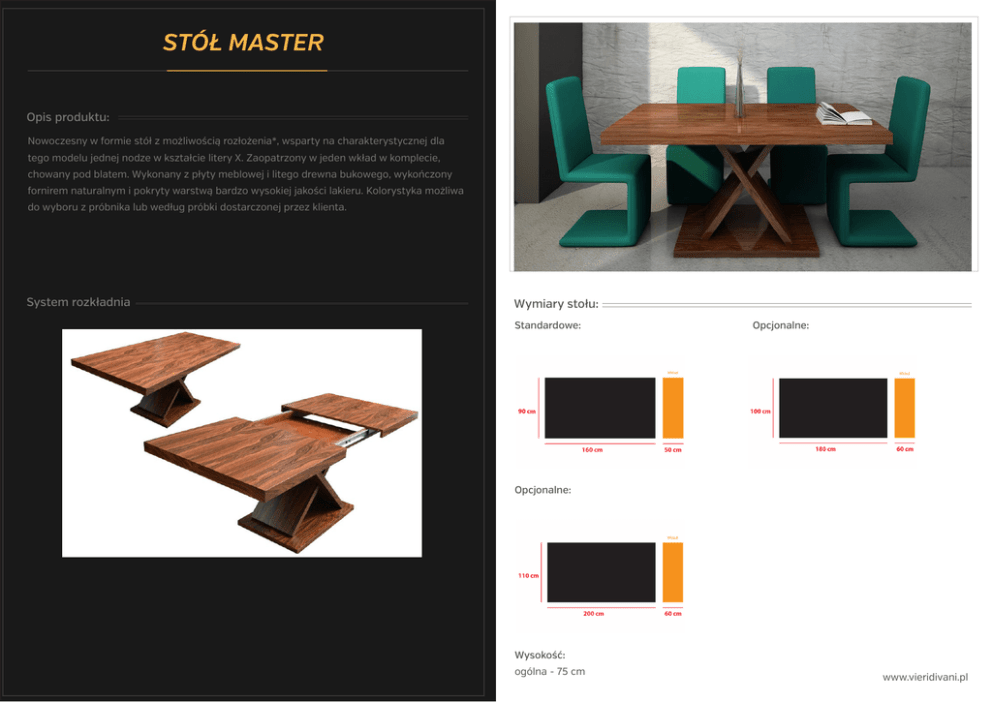 STÓŁ MASTER Opis produktu: Nowoczesny w formie stół z możliwością rozłożenia*, wsparty na charakterystycznej dla tego modelu jednej nodze w kształcie litery X. Zaopatrzony w jeden wkład w komplecie, chowany pod blatem. Wykonany z płyty meblowej i litego drewna bukowego, wykończony fornirem naturalnym i pokryty warstwą bardzo wysokiej jakości lakieru. Kolorystyka możliwa do wyboru z próbnika lub według próbki dostarczonej przez klienta. System rozkładnia Wymiary stołu: Standardowe: Opcjonalne: Opcjonalne: Wysokość: ogólna - 75 cm www.vieridivani.pl