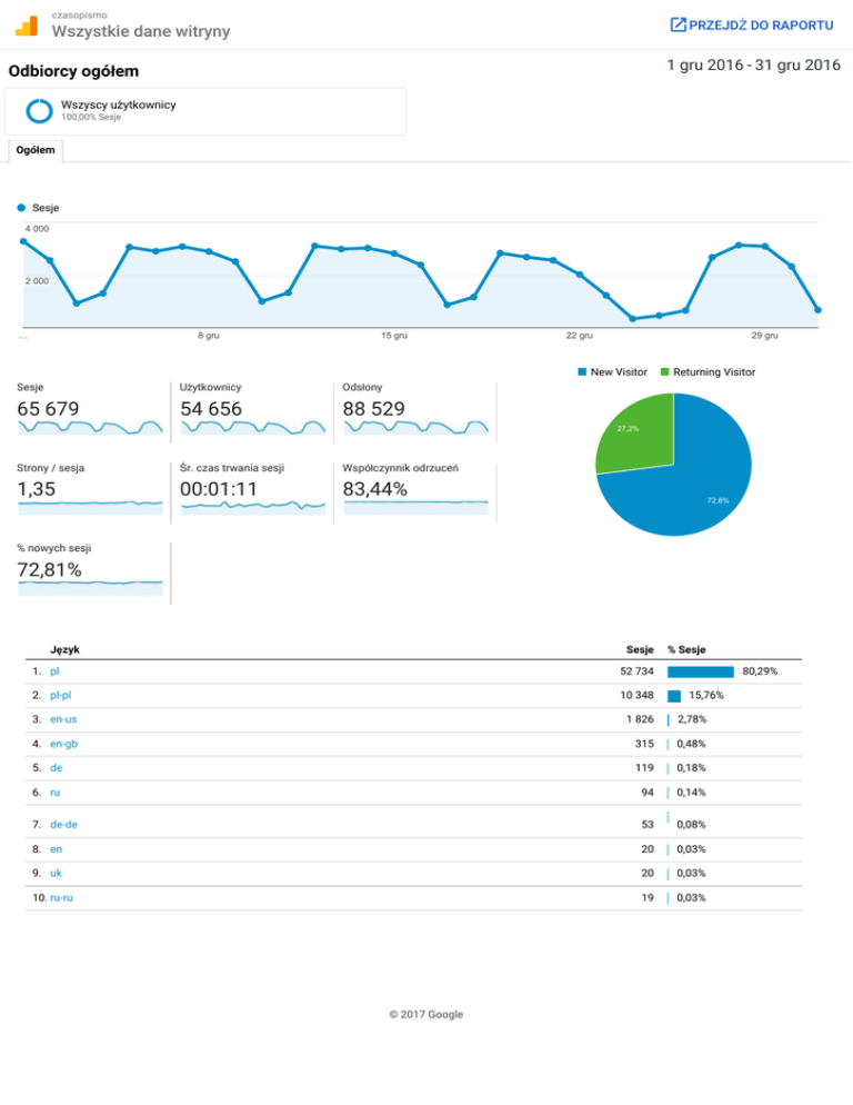 czasopismo PRZEJDŹ DO RAPORTU Wszystkie dane witryny 1 gru 2016 - 31 gru 2016 Odbiorcy ogółem Wszyscy użytkownicy 100,00% Sesje Ogółem Sesje 4 000 2 000 … 8 gru 15 gru 22 gru 29 gru New Visitor Sesje Użytkownicy Odsłony 65 679 54 656 88 529 Returning Visitor 27,2% Strony / sesja Śr. czas trwania sesji Współczynnik odrzuceń 1,35 00:01:11 83,44% 72,8% % nowych sesji 72,81% Język Sesje % Sesje 1. pl 52 734 2. pl-pl 10 348 3. en-us 1 826 2,78% 4. en-gb 315 0,48% 5. de 119 0,18% 6. ru 94 0,14% 7. de-de 53 0,08% 8. en 20 0,03% 9. uk 20 0,03% 10. ru-ru 19 0,03% © 2017 Google 80,29% 15,76%