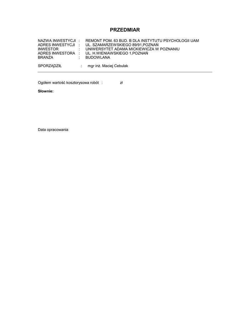 PRZEDMIAR NAZWA INWESTYCJI ADRES INWESTYCJI INWESTOR ADRES INWESTORA BRANŻA SPORZĄDZIŁ : : : : : REMONT POM. 63 BUD. B DLA INSTYTUTU PSYCHOLOGII UAM UL. SZAMARZEWSKIEGO 89/91,POZNAŃ UNIWERSYTET ADAMA MICKIEWICZA W POZNANIU UL. H.WIENIAWSKIEGO 1,POZNAŃ BUDOWLANA : mgr inż. Maciej Cebulak Ogółem wartość kosztorysowa robót : Słownie: Data opracowania zł REM POM 63B INST PSYCH Lp. Podst 1 KNR 4-01 0818-0500 2 KNR-W 202 19180500 KSIĄŻKA PRZEDMIARÓW Opis i wyliczenia Zerwanie posadzki z tworzyw sztucznych j.m. m2 3,50*5,60 m2 Ręczne skucie powierzchni betonu niezbrojonego o grubości 3 cm m2 3,50*5,60 m2 3 KNR-O 9-10 Ściany budynków wielokondygnacyjnych o wys. do 4,5 m i grub. warstwy kon-m2 0151-0100 strukcyjnej 18 cm, z bloków drążonych SILIKAT N 18/500, wykonane na zaprawie tradycyjnie - ścianka akustyczna. 3,50*3,00 m2 4 KNNR 2 1702-0300 Ścianki działowe z płyt gipsowo-kartonowych. Ścianki na rusztach metalom2 wych pojedyńcznych z pokryciem jednostronnym, jednowarstwowe - scianka akustyczna. 3,50*3,00 m2 5 NNRNKB 2- Warstwy wyrównujące i wygładzające z zaprawy samopoziomującej "EVI" gru-m2 02U 1130- bości 5 mm wykonywane w pomieszczeniach o powierzchni ponad 8,0 m2 ( 0200 Orgbud W-wa) 3,50*5,60 m2 6 KNR 2-02 1001-0900 7 KNNR 5 1208-0200 Dostawa i montaż drzwi wewnętznych w klasie izolacyjności akustycznej m2 Rw=42dB w okleinie drewnopodobnej wraz z montażem ościeżnicy regulowanej, okucia satyna, klamka z szyldem, zamek z wkładką . 0,90*2,00 m2 Zaprawienie bruzd o szerokości do 50 mm m 25 m 8 NNRNKB 2- Gruntowanie powierzchni poziomych preparatami gruntującymi "ATLAS UNI m2 02U 1134- GRUNT" (Orgbud W-wa) 0101 sufity 1,80*3,50 m2 1,80*4,30 m2 9 NNRNKB 2- Gruntowanie powierzchni pionowych preparatami gruntującymi "ATLAS UNI 02U 1134- GRUNT" (Orgbud W-wa) 0201 ściany (3,50+5,60)*2 -1,70*2,50 -2,00*0,90 ościeża (1,70*2+2,50)*0,25 (0,90+2,00*2)*0,25 10 KNR 4-01 0716-01 11 KNR-K 1 0307-0100 12 KNR-K 1 0307-0200 13 KSNR 2 1302-0400 Norma 3.19 19,600 RAZEM 19,600 19,600 RAZEM 19,600 10,500 RAZEM 10,500 10,500 RAZEM 10,500 19,600 RAZEM 19,600 1,800 RAZEM 1,800 25,000 RAZEM 25,000 6,300 7,740 RAZEM 14,040 m2 m2 m2 18,200 -4,250 -1,800 m2 m2 1,475 1,225 RAZEM 14,850 10,500 -1,800 RAZEM 8,700 m2 m2 m2 m2 54,600 -4,250 -1,800 m2 m2 1,475 1,225 RAZEM 51,250 6,300 7,740 RAZEM 14,040 Prace wykończeniowe przy renowacji starego budownictwa - szpachlowanie m2 tynków renowacyjnych na sufitach sufity 1,80*3,50 m2 1,80*4,30 m2 Malowanie podłoży gipsowych farbą emulsyjną m2 ściany (3,50+5,60)*2*3,00 3,50*3,00*2 -1,70*2,50*2 m2 m2 m2 -2- Razem m2 Tynki wewn.zwykłe kat. III wykonyw.ręcznie na podłożu z cegły i pustaków na m2 ścianach w pomieszczeniach o pow.podłogi do 5 m2 3,50*3,00 m2 -0,90*2,00 m2 Prace wykończeniowe przy renowacji starego budownictwa - szpachlowanie tynków renowacyjnych na ścianach ściany (3,50+5,60)*2*3,00 -1,70*2,50 -2,00*0,90 ościeża (1,70*2+2,50)*0,25 (0,90+2,00*2)*0,25 Poszcz 54,600 21,000 -8,500 REM POM 63B INST PSYCH Lp. Podst KSIĄŻKA PRZEDMIARÓW Opis i wyliczenia -2,00*0,90*2 ościeża (1,70*2+2,50)*0,25*2 (0,90+2,00*2)*0,25*2 sufity 1,80*3,50 1,80*4,30 14 KNR-W 202 11240100 j.m. m2 17 KNNR 7 0507-04 18 wycena indyw. 2,950 2,450 m2 m2 6,300 7,740 RAZEM 82,940 6,300 7,740 RAZEM 14,040 3,900 RAZEM 3,900 10,600 -1,800 12,200 -0,900 RAZEM 20,100 2,000 RAZEM 2,000 4,250 RAZEM 4,250 1,000 RAZEM 1,000 1,000 RAZEM 1,000 Posadzki z wykładzin tekstylnych dywanopodobnych,rulonowych klejonych do podkładu - wykładzina dywanowa do użytku biurowego, splot pętelkowy lub igłowy, w klasie 33 wg PN-EN 685, odporna na wgniecenia od kół krzeseł, antystatyczna, trudnozapalna. m2 1,80*3,50 1,80*4,30 m2 m2 Listwy przyścienne z polichlorku winylu,klejone m (1,80+3,50)*2 -0,90*2 (1,80+4,30)*2 -0,90 m m m m Progi i listwy osłaniające aluminiowe m 2 m Dostawa i montaż rolety wewnętrznej z profili aluminiowych giętych, prowa- m2 dzonych w prowadnicach po stronie wewnętrznej ściany. Skrzynka, prowadnica i listwy w kolorze białym. Rolety wyposażyć w ręczny mechanizm korbowy. 1,70*2,50 m2 19 wycena ind. Utylizacja odpadów budowlanych. 1 20 KNR 4-01 1209-14 kpl kpl Dwukrotne malowanie farbą olejną podokienników i innych elementów o pow. szt. do 0.75 m2 2,50*0,40 szt. -3- Norma 3.19 Razem m2 m2 15 KNR-O 9-09 Obudowy szybów instalacyjnych - szkielet metalowy pojedynczy, okładzina je-m2 0405-0100 dnostronna w systemie Knauf W 623 profil CD 60x27, pokrycie jednokrotne. Płyty GKB 12,5 mm spoinowane masą Uniflott, bez taśmy zbrojącej (0,30+0,30)*6,50 m2 16 KSNR 2 1106-0400 Poszcz -3,600