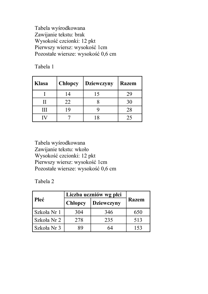 Tabela wyśrodkowana Zawijanie tekstu: brak Wysokość czcionki: 12 pkt Pierwszy wiersz: wysokość 1cm Pozostałe wiersze: wysokość 0,6 cm Tabela 1 Klasa Chłopcy I II III IV Dziewczyny 14 22 19 7 Razem 15 8 9 18 29 30 28 25 Tabela wyśrodkowana Zawijanie tekstu: wkoło Wysokość czcionki: 12 pkt Pierwszy wiersz: wysokość 1cm Pozostałe wiersze: wysokość 0,6 cm Tabela 2 Płeć Szkoła Nr 1 Szkoła Nr 2 Szkoła Nr 3 Liczba uczniów wg płci Chłopcy 304 278 89 Dziewczyny 346 235 64 Razem 650 513 153