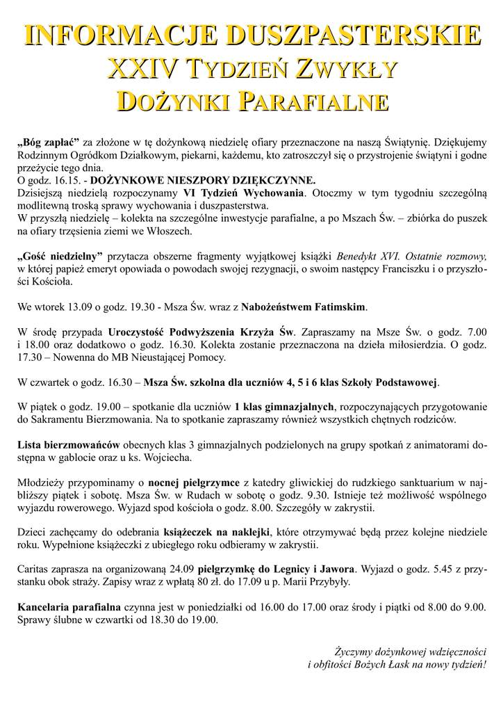 INFORMACJE DUSZPASTERSKIE XXIV TYDZIEŃ ZWYKŁY DOŻYNKI PARAFIALNE „Bóg zapłać” za złożone w tę dożynkową niedzielę ofiary przeznaczone na naszą Świątynię. Dziękujemy Rodzinnym Ogródkom Działkowym, piekarni, każdemu, kto zatroszczył się o przystrojenie świątyni i godne przeżycie tego dnia. O godz. 16.15. - DOŻYNKOWE NIESZPORY DZIĘKCZYNNE. Dzisiejszą niedzielą rozpoczynamy VI Tydzień Wychowania. Otoczmy w tym tygodniu szczególną modlitewną troską sprawy wychowania i duszpasterstwa. W przyszłą niedzielę – kolekta na szczególne inwestycje parafialne, a po Mszach Św. – zbiórka do puszek na ofiary trzęsienia ziemi we Włoszech. „Gość niedzielny” przytacza obszerne fragmenty wyjątkowej książki Benedykt XVI. Ostatnie rozmowy, w której papież emeryt opowiada o powodach swojej rezygnacji, o swoim następcy Franciszku i o przyszłości Kościoła. We wtorek 13.09 o godz. 19.30 - Msza Św. wraz z Nabożeństwem Fatimskim. W środę przypada Uroczystość Podwyższenia Krzyża Św. Zapraszamy na Msze Św. o godz. 7.00 i 18.00 oraz dodatkowo o godz. 16.30. Kolekta zostanie przeznaczona na dzieła miłosierdzia. O godz. 17.30 – Nowenna do MB Nieustającej Pomocy. W czwartek o godz. 16.30 – Msza Św. szkolna dla uczniów 4, 5 i 6 klas Szkoły Podstawowej. W piątek o godz. 19.00 – spotkanie dla uczniów 1 klas gimnazjalnych, rozpoczynających przygotowanie do Sakramentu Bierzmowania. Na to spotkanie zapraszamy również wszystkich chętnych rodziców. Lista bierzmowańców obecnych klas 3 gimnazjalnych podzielonych na grupy spotkań z animatorami dostępna w gablocie oraz u ks. Wojciecha. Młodzieży przypominamy o nocnej pielgrzymce z katedry gliwickiej do rudzkiego sanktuarium w najbliższy piątek i sobotę. Msza Św. w Rudach w sobotę o godz. 9.30. Istnieje też możliwość wspólnego wyjazdu rowerowego. Wyjazd spod kościoła o godz. 8.00. Szczegóły w zakrystii. Dzieci zachęcamy do odebrania książeczek na naklejki, które otrzymywać będą przez kolejne niedziele roku. Wypełnione książeczki z ubiegłego roku odbieramy w zakrystii. Caritas zaprasza na organizowaną 24.09 pielgrzymkę do Legnicy i Jawora. Wyjazd o godz. 5.45 z przystanku obok straży. Zapisy wraz z wpłatą 80 zł. do 17.09 u p. Marii Przybyły. Kancelaria parafialna czynna jest w poniedziałki od 16.00 do 17.00 oraz środy i piątki od 8.00 do 9.00. Sprawy ślubne w czwartki od 18.30 do 19.00. Życzymy dożynkowej wdzięczności i obfitości Bożych Łask na nowy tydzień!
