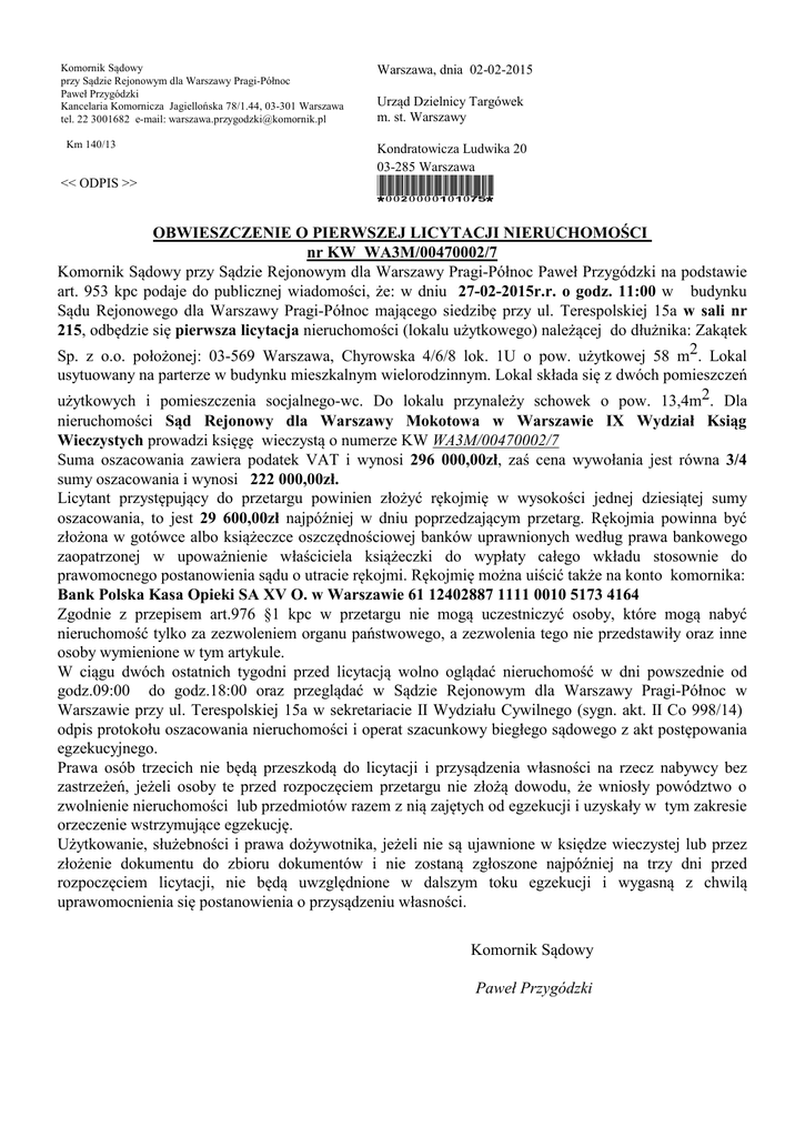 Komornik Sądowy przy Sądzie Rejonowym dla Warszawy Pragi-Północ Paweł Przygódzki Kancelaria Komornicza Jagiellońska 78/1.44, 03-301 Warszawa tel. 22 3001682 e-mail: [email protected] Km 140/13 << ODPIS >> Warszawa, dnia 02-02-2015 Urząd Dzielnicy Targówek m. st. Warszawy Kondratowicza Ludwika 20 03-285 Warszawa *0020000101075* OBWIESZCZENIE O PIERWSZEJ LICYTACJI NIERUCHOMOŚCI nr KW WA3M/00470002/7 Komornik Sądowy przy Sądzie Rejonowym dla Warszawy Pragi-Północ Paweł Przygódzki na podstawie art. 953 kpc podaje do publicznej wiadomości, że: w dniu 27-02-2015r.r. o godz. 11:00 w budynku Sądu Rejonowego dla Warszawy Pragi-Północ mającego siedzibę przy ul. Terespolskiej 15a w sali nr 215, odbędzie się pierwsza licytacja nieruchomości (lokalu użytkowego) należącej do dłużnika: Zakątek Sp. z o.o. położonej: 03-569 Warszawa, Chyrowska 4/6/8 lok. 1U o pow. użytkowej 58 m2. Lokal usytuowany na parterze w budynku mieszkalnym wielorodzinnym. Lokal składa się z dwóch pomieszczeń użytkowych i pomieszczenia socjalnego-wc. Do lokalu przynależy schowek o pow. 13,4m2. Dla nieruchomości Sąd Rejonowy dla Warszawy Mokotowa w Warszawie IX Wydział Ksiąg Wieczystych prowadzi księgę wieczystą o numerze KW WA3M/00470002/7 Suma oszacowania zawiera podatek VAT i wynosi 296 000,00zł, zaś cena wywołania jest równa 3/4 sumy oszacowania i wynosi 222 000,00zł. Licytant przystępujący do przetargu powinien złożyć rękojmię w wysokości jednej dziesiątej sumy oszacowania, to jest 29 600,00zł najpóźniej w dniu poprzedzającym przetarg. Rękojmia powinna być złożona w gotówce albo książeczce oszczędnościowej banków uprawnionych według prawa bankowego zaopatrzonej w upoważnienie właściciela książeczki do wypłaty całego wkładu stosownie do prawomocnego postanowienia sądu o utracie rękojmi. Rękojmię można uiścić także na konto komornika: Bank Polska Kasa Opieki SA XV O. w Warszawie 61 12402887 1111 0010 5173 4164 Zgodnie z przepisem art.976 §1 kpc w przetargu nie mogą uczestniczyć osoby, które mogą nabyć nieruchomość tylko za zezwoleniem organu państwowego, a zezwolenia tego nie przedstawiły oraz inne osoby wymienione w tym artykule. W ciągu dwóch ostatnich tygodni przed licytacją wolno oglądać nieruchomość w dni powszednie od godz.09:00 do godz.18:00 oraz przeglądać w Sądzie Rejonowym dla Warszawy Pragi-Północ w Warszawie przy ul. Terespolskiej 15a w sekretariacie II Wydziału Cywilnego (sygn. akt. II Co 998/14) odpis protokołu oszacowania nieruchomości i operat szacunkowy biegłego sądowego z akt postępowania egzekucyjnego. Prawa osób trzecich nie będą przeszkodą do licytacji i przysądzenia własności na rzecz nabywcy bez zastrzeżeń, jeżeli osoby te przed rozpoczęciem przetargu nie złożą dowodu, że wniosły powództwo o zwolnienie nieruchomości lub przedmiotów razem z nią zajętych od egzekucji i uzyskały w tym zakresie orzeczenie wstrzymujące egzekucję. Użytkowanie, służebności i prawa dożywotnika, jeżeli nie są ujawnione w księdze wieczystej lub przez złożenie dokumentu do zbioru dokumentów i nie zostaną zgłoszone najpóźniej na trzy dni przed rozpoczęciem licytacji, nie będą uwzględnione w dalszym toku egzekucji i wygasną z chwilą uprawomocnienia się postanowienia o przysądzeniu własności. Komornik Sądowy Paweł Przygódzki