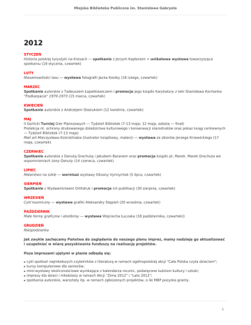 Miejska Biblioteka Publiczna im. Stanisława Gabryela 2012 STYCZEŃ Historia polskiej turystyki na Kresach — spotkanie z Jerzym Kapłonem + unikatowa wystawa towarzysząca spotkaniu (19 stycznia, czwartek) LUTY Niesamowitości lasu — wystawa fotografii Jacka Kosiby (16 lutego, czwartek) MARZEC Spotkanie autorskie z Tadeuszem Łopatkiewiczem i promocja jego książki Karykatury z teki Stanisława Kochanka "Podkarpacie" 1970-1973 (15 marca, czwartek) KWIECIEŃ Spotkanie autorskie z Andrzejem Stasiukiem (12 kwietnia, czwartek) MAJ II Gorlicki Turniej Gier Planszowych — Tydzień Bibliotek (7-13 maja; 12 maja, sobota — finał) Prelekcja nt. ochrony drukowanego dziedzictwa kulturowego i konserwacji starodruków oraz pokaz ksiąg cerkiewnych — Tydzień Bibliotek (7-13 maja) Mail art Mieczysława Kościelniaka (ilustrator książkowy, malarz) — wystawa ze zbiorów Jerzego Krzewickiego (17 maja, czwartek) CZERWIEC Spotkanie autorskie z Danutą Grechutą i Jakubem Baranem oraz promocja książki pt. Marek. Marek Grechuta we wspomnieniach żony Danuty (14 czerwca, czwartek) LIPIEC Malarstwo na szkle — wernisaż wystawy Oksany Vynnychok (5 lipca, czwartek) SIERPIEŃ Spotkanie z Wydawnictwem Orthdruk i promocja ich publikacji (30 sierpnia, czwartek) WRZESIEŃ Cykl kosmiczny — wystawa grafiki Aleksandry Stępień (20 września, czwartek) PAŹDZIERNIK Małe formy graficzne i ekslibrisy — wystawa Wojciecha Łuczaka (18 października, czwartek)) GRUDZIEŃ Niespodzianka Jak zwykle zachęcamy Państwa do zaglądania do naszego planu imprez, mamy nadzieję go aktualizować i uzupełniać w miarę pozyskiwania funduszy na realizację projektów. Poza imprezami ujętymi w planie odbędą się: ■ ■ ■ ■ ■ cykl spotkań najmłodszych czytelników z literaturą w ramach ogólnopolskiej akcji "Cała Polska czyta dzieciom"; kursy komputerowe dla seniorów; mini-wystawy okolicznościowe wynikające z kalendarza rocznic, poświęcone ludziom kultury i sztuki; imprezy dla dzieci i młodzieży w ramach Akcji "Zima 2012" i "Lato 2012"; spotkania autorskie, warsztaty itp. w ramach zgłoszonych projektów, o ile MBP pozyska granty. 1