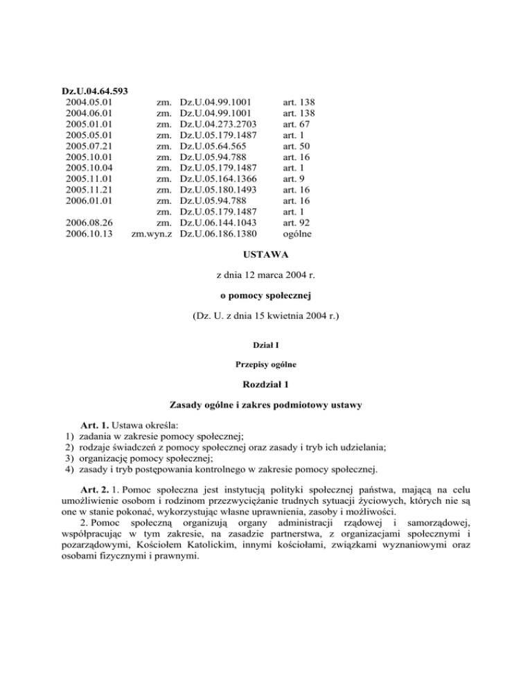 Dz.U.04.64.593 2004.05.01 2004.06.01 2005.01.01 2005.05.01 2005.07.21 2005.10.01 2005.10.04 2005.11.01 2005.11.21 2006.01.01 2006.08.26 2006.10.13 zm. zm. zm. zm. zm. zm. zm. zm. zm. zm. zm. zm. zm.wyn.z Dz.U.04.99.1001 Dz.U.04.99.1001 Dz.U.04.273.2703 Dz.U.05.179.1487 Dz.U.05.64.565 Dz.U.05.94.788 Dz.U.05.179.1487 Dz.U.05.164.1366 Dz.U.05.180.1493 Dz.U.05.94.788 Dz.U.05.179.1487 Dz.U.06.144.1043 Dz.U.06.186.1380 art. 138 art. 138 art. 67 art. 1 art. 50 art. 16 art. 1 art. 9 art. 16 art. 16 art. 1 art. 92 ogólne USTAWA z dnia 12 marca 2004 r. o pomocy społecznej (Dz. U. z dnia 15 kwietnia 2004 r.) Dział I Przepisy ogólne Rozdział 1 Zasady ogólne i zakres podmiotowy ustawy 1) 2) 3) 4) Art. 1. Ustawa określa: zadania w zakresie pomocy społecznej; rodzaje świadczeń z pomocy społecznej oraz zasady i tryb ich udzielania; organizację pomocy społecznej; zasady i tryb postępowania kontrolnego w zakresie pomocy społecznej. Art. 2. 1. Pomoc społeczna jest instytucją polityki społecznej państwa, mającą na celu umożliwienie osobom i rodzinom przezwyciężanie trudnych sytuacji życiowych, których nie są one w stanie pokonać, wykorzystując własne uprawnienia, zasoby i możliwości. 2. Pomoc społeczną organizują organy administracji rządowej i samorządowej, współpracując w tym zakresie, na zasadzie partnerstwa, z organizacjami społecznymi i pozarządowymi, Kościołem Katolickim, innymi kościołami, związkami wyznaniowymi oraz osobami fizycznymi i prawnymi. Art. 3. 1. Pomoc społeczna wspiera osoby i rodziny w wysiłkach zmierzających do zaspokojenia niezbędnych potrzeb i umożliwia im życie w warunkach odpowiadających godności człowieka. 2. Zadaniem pomocy społecznej jest zapobieganie sytuacjom, o których mowa w art. 2 ust. 1, przez podejmowanie działań zmierzających do życiowego usamodzielnienia osób i rodzin oraz ich integracji ze środowiskiem. 3. Rodzaj, forma i rozmiar świadczenia powinny być odpowiednie do okoliczności uzasadniających udzielenie pomocy. 4. Potrzeby osób i rodzin korzystających z pomocy powinny zostać uwzględnione, jeżeli odpowiadają celom i mieszczą się w możliwościach pomocy społecznej. Art. 4. Osoby i rodziny korzystające z pomocy społecznej są obowiązane do współdziałania w rozwiązywaniu ich trudnej sytuacji życiowej. Art. 5. Prawo do świadczeń z pomocy społecznej, jeżeli umowy międzynarodowe nie stanowią inaczej, przysługuje: 1) osobom posiadającym obywatelstwo polskie mającym miejsce zamieszkania i przebywającym na terytorium Rzeczypospolitej Polskiej; 2) (1) cudzoziemcom mającym miejsce zamieszkania i przebywającym na terytorium Rzeczypospolitej Polskiej na podstawie zezwolenia na osiedlenie się, zezwolenia na pobyt rezydenta długoterminowego Wspólnot Europejskich, zezwolenia na zamieszkanie na czas oznaczony udzielonego w związku z okolicznością, o której mowa w art. 53 ust. 1 pkt 13 ustawy z dnia 13 czerwca 2003 r. o cudzoziemcach (Dz. U. Nr 128, poz. 1175, z późn. zm.), zgody na pobyt tolerowany lub w związku z uzyskaniem w Rzeczypospolitej Polskiej statusu uchodźcy; 3) (2) mającym miejsce zamieszkania i przebywającym na terytorium Rzeczypospolitej Polskiej obywatelom państw członkowskich Unii Europejskiej, państw Europejskiego Obszaru Gospodarczego nienależących do Unii Europejskiej lub państw niebędących stronami umowy o Europejskim Obszarze Gospodarczym, którzy mogą korzystać ze swobody przepływu osób na podstawie umów zawartych przez te państwa ze Wspólnotą Europejską i jej państwami członkowskimi, posiadającym prawo pobytu lub prawo stałego pobytu na terytorium Rzeczypospolitej Polskiej. Art. 6. Użyte w ustawie określenia oznaczają: 1) całkowita niezdolność do pracy - całkowitą niezdolność do pracy w rozumieniu przepisów o emeryturach i rentach z Funduszu Ubezpieczeń Społecznych albo zaliczenie do I lub II grupy inwalidów lub legitymowanie się znacznym lub umiarkowanym stopniem niepełnosprawności w rozumieniu przepisów o rehabilitacji zawodowej i społecznej oraz zatrudnianiu osób niepełnosprawnych; 2) dochód dziecka - dochód, do którego zalicza się kwotę otrzymywanej renty wraz z dodatkiem dla sierot zupełnych, zasiłek pielęgnacyjny, dodatek pielęgnacyjny, otrzymywane alimenty oraz kwotę odpowiadającą dochodom uzyskiwanym z majątku dziecka; 3) dochód na osobę w rodzinie - dochód rodziny podzielony przez liczbę osób w rodzinie; 4) dochód rodziny - sumę miesięcznych dochodów osób w rodzinie; 5) jednostka organizacyjna pomocy społecznej - regionalny ośrodek polityki społecznej, powiatowe centrum pomocy rodzinie, ośrodek pomocy społecznej, dom pomocy społecznej, placówkę specjalistycznego poradnictwa, w tym rodzinnego, placówkę opiekuńczo- wychowawczą, ośrodek adopcyjno-opiekuńczy, ośrodek wsparcia i ośrodek interwencji kryzysowej; 6) kontrakt socjalny - pisemną umowę zawartą z osobą ubiegającą się o pomoc, określającą uprawnienia i zobowiązania stron umowy, w ramach wspólnie podejmowanych działań zmierzających do przezwyciężenia trudnej sytuacji życiowej osoby lub rodziny; 7) niezdolność do pracy z tytułu wieku - ukończone 60 lat przez kobietę i 65 lat przez mężczyznę; 8) osoba bezdomna - osobę niezamieszkującą w lokalu mieszkalnym w rozumieniu przepisów o ochronie praw lokatorów i mieszkaniowym zasobie gminy i niezameldowaną na pobyt stały, w rozumieniu przepisów o ewidencji ludności i dowodach osobistych, a także osobę niezamieszkującą w lokalu mieszkalnym i zameldowaną na pobyt stały w lokalu, w którym nie ma możliwości zamieszkania; 9) osoba samotna - osobę samotnie gospodarującą, niepozostającą w związku małżeńskim i nieposiadającą wstępnych ani zstępnych; 10) osoba samotnie gospodarująca - osobę prowadzącą jednoosobowe gospodarstwo domowe; 11) osoba zatrudniona - osobę pozostającą w zatrudnieniu w rozumieniu przepisów 
