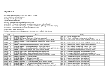 Załącznik nr 14 Niezbędne raporty do rozliczeń z NFZ między innymi: -sprawozdanie z realizacji umowy - korekty do tych sprawozdań - sprawozdanie finansowe -zbiorcze zestawienie produktów jednostkowych -zestawienie świadczeń rozliczanych na podstawie przepisów o koordynacji -zestawienie świadczeń rozliczanych na podstawie art.2 ust.1(decyzja burmistrza/wójta) -zestawienie kosztów świadczeń rozliczanych ryczałtowo -zagregowany raport statystyczny Powinny z programu również się generować roczne sprawozdania statystyczne Kod R08MZ11_1A R08MZ11_1B R08MZ11_2 R08MZ11_2A R08MZ11_3 R08MZ11_4 R08MZ11_4A R08MZ12_4 R08MZ12_6 R08MZ12_7 R08MZ12_8 R08MZ1541A R08MZ1541B R08MZ1541C R08MZ1541D R08MZ1541E R08MZ1541F Nazwa 2008 MZ-11 Porady profilaktyczne 2008 MZ-11 Wizyty profilaktyczne pielęgniarek i położnych 2008 MZ-11 Dane o stanie zdrowia dzieci i młodzieży w wieku 0-18 lat 2008 MZ-11 Dane o stanie zdrowia dzieci i młodzieży w wieku 0-18 lat pierwszy 2008 MZ-11 Profilaktyczne badania lekarskie dzieci i młodzieży 2008 MZ-11 Dane o stanie zdrowia osób w wieku 19lat i więcej 2008 MZ-11 Dane o stanie zdrowia osób w wieku 19 lat i więcej - pierwszy raz 2008 MZ-12 Działalność różnych form opieki dziennej i nocnej 2008 MZ-12 Pracujący i działalność poradni specjalistycznych 2008 MZ-12 Pracujący i działalność poradni stomatologicznych 2008 MZ-12 Działalność oddziałów dziennych nie wykazanych w dziale 4 2008 MZ-15 Dział 4.1 01 Leczeni ogółem 2008 MZ-15 Dział 4.1 02 Leczeni mężczyźni 2008 MZ-15 Dział 4.1 03-06 Leczeni według wieku 2008 MZ-15 Dział 4.1 07 Z Leczeni ogółem po raz pierwszy w życiu 2008 MZ-15 Dział 4.1 Z 08 Leczeni mężczyźni po raz pierwszy w życiu 2008 MZ-15 Dział 4.1 09-12 Leczeni według wieku po raz pierwszy w życiu Rodzaj 2008 MZ-11 Porady profilaktyczne 2008 MZ-11 Wizyty profilaktyczne pielęgniarek i położnych 2008 MZ-11 Dane o stanie zdrowia dzieci i młodzieży w wieku 0-18 lat 2008 2008 2008 2008 2008 2008 2008 2008 2008 2008 2008 2008 2008 2008 MZ-11 Dane o stanie zdrowia dzieci i młodzieży w wieku 0-18 lat MZ-11 Profilaktyczne badania lekarskie dzieci i młodzieży MZ-11 Dane o stanie zdrowia osób w wieku 19lat i więcej MZ-11 Dane o stanie zdrowia osób w wieku 19lat i więcej MZ-12 Działalność różnych form opieki dziennej i nocnej MZ-12 Pracujący i działalność poradni specjalistycznych MZ-12 Pracujący i działalność poradni stomatologicznych MZ-12 Działalność oddziałów dziennych nie wykazanych w dziale 4 MZ-15 Zaburzenia psychiczne (bez uzależnień) MZ-15 Zaburzenia psychiczne (bez uzależnień) MZ-15 Zaburzenia psychiczne (bez uzależnień) MZ-15 Zaburzenia psychiczne (bez uzależnień) MZ-15 Zaburzenia psychiczne (bez uzależnień) MZ-15 Zaburzenia psychiczne (bez uzależnień) R08MZ1542A 2008 MZ-15 Dział 4.2 01 Leczeni ogółem R08MZ1542B 2008 MZ-15 Dział 4.2 02 Leczeni mężczyźni R08MZ1542C 2008 MZ-15 Dział 4.2 03-06 Leczeni według wieku R08MZ1542D 2008 MZ-15 Dział 4.2 07 Z Leczeni ogółem po raz pierwszy w życiu R08MZ1542E 2008 MZ-15 Dział 4.2 Z 08 Leczeni mężczyźni po raz pierwszy w życiu R08MZ1542F R08MZ1543A R08MZ1543B R08MZ1543C R08MZ1543D R08MZ1543E R08MZ1543F R08MZ154BA R08MZ154BB R08MZ154BC R08MZ154BD R08MZ154BE 2008 2008 2008 2008 2008 2008 2008 2008 2008 2008 2008 2008 2008 13 2008 2008 2008 R08MZ154BF R08ZD3_2 R08ZD3_2D R08ZD3_3 MZ-15 MZ-15 MZ-15 MZ-15 MZ-15 MZ-15 MZ-15 MZ-15 MZ-15 MZ-15 MZ-15 MZ-15 MZ-15 Dział Dział Dział Dział Dział Dział Dział Dział Dział Dział Dział Dział Dział 4.2 4.3 4.3 4.3 4.3 4.3 4.3 4.3 4.3 4.3 4.3 4.3 4.3 09-12 Leczeni według wieku po raz pierwszy w życiu 01 Leczeni ogółem 02 Leczeni mężczyźni 03-06 Leczeni według wieku 07 Z Leczeni ogółem po raz pierwszy w życiu Z 08 Leczeni mężczyźni po raz pierwszy w życiu 09-12 Leczeni według wieku po raz pierwszy w życiu 01 Leczeni ogółem - w. 13 02 Leczeni mężczyźni - w. 13 03-06 Leczeni według wieku - w. 13 07 Z Leczeni ogółem po raz pierwszy w życiu - w. 13 Z 08 Leczeni mężczyźni po raz pierwszy w życiu - w. 13 09-12 Leczeni według wieku po raz pierwszy w życiu - w. ZD3 Podstawowa opieka zdrowotna ZD3 Podstawowa opieka zdrowotna - wizyty domowe ZD3 Specjalistyczna opieka zdrowotna 2008 MZ-15 Zaburzenia psychoaktywnych 2008 MZ-15 Zaburzenia psychoaktywnych 2008 MZ-15 Zaburzenia psychoaktywnych 2008 MZ-15 Zaburzenia psychoaktywnych 2008 MZ-15 Zaburzenia psychoaktywnych 2008 MZ-15 Zaburzenia psychoaktywnych 2008 MZ-15 Zaburzenia 2008 MZ-15 Zaburzenia 2008 MZ-15 Zaburzenia 2008 MZ-15 Zaburzenia 2008 MZ-15 Zaburzenia 2008 MZ-15 Zaburzenia 2008 MZ-15 Zaburzenia 2008 MZ-15 Zaburzenia 2008 MZ-15 Zaburzenia 2008 MZ-15 Zaburzenia 2008 MZ-15 Zaburzenia 2008 2008 2008 2008 spowodowane używaniem środków spowodowane używaniem środków spowodowane używaniem środków spowodowane używaniem środków spowodowane używaniem środków spowodowane używaniem środków spowodowane spowodowane spowodowane spowodowane spowodowane spowodowane spowodowane spowodowane spowodowane spowodowane spowodowane używaniem używaniem używaniem używaniem używaniem używaniem używaniem używaniem używaniem używaniem używaniem alkoholu alkoholu alkoholu alkoholu alkoholu alkoholu alkoholu alkoholu alkoholu alkoholu alkoholu - wiersz wiersz wiersz wiersz wiersz 13 13 13 13 13 MZ-15 Zaburzenia spowodowane używaniem alkoholu - wiersz 13 ZD-3 Podstawowa opieka zdrowotna ZD-3 Podstawowa opieka zdrowotna ZD-3 Specjalistyczna opieka zdrowotna