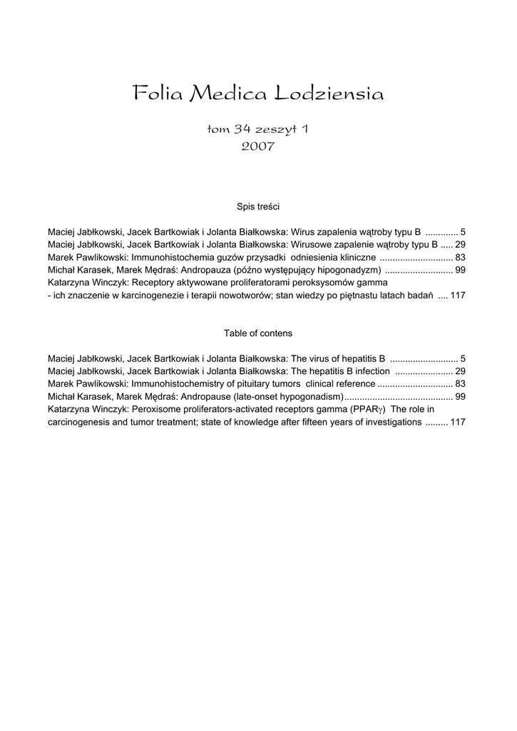 Folia Medica Lodziensia tom 34 zeszyt 1 2007 Spis treści Maciej Jabłkowski, Jacek Bartkowiak i Jolanta Białkowska: Wirus zapalenia wątroby typu B ............. 5 Maciej Jabłkowski, Jacek Bartkowiak i Jolanta Białkowska: Wirusowe zapalenie wątroby typu B ..... 29 Marek Pawlikowski: Immunohistochemia guzów przysadki odniesienia kliniczne ............................. 83 Michał Karasek, Marek Mędraś: Andropauza (późno występujący hipogonadyzm) ........................... 99 Katarzyna Winczyk: Receptory aktywowane proliferatorami peroksysomów gamma - ich znaczenie w karcinogenezie i terapii nowotworów; stan wiedzy po piętnastu latach badań .... 117 Table of contens Maciej Jabłkowski, Jacek Bartkowiak i Jolanta Białkowska: The virus of hepatitis B ........................... 5 Maciej Jabłkowski, Jacek Bartkowiak i Jolanta Białkowska: The hepatitis B infection ....................... 29 Marek Pawlikowski: Immunohistochemistry of pituitary tumors clinical reference .............................. 83 Michał Karasek, Marek Mędraś: Andropause (late-onset hypogonadism)........................................... 99 Katarzyna Winczyk: Peroxisome proliferators-activated receptors gamma (PPARγ) The role in carcinogenesis and tumor treatment; state of knowledge after fifteen years of investigations ......... 117 Folia Medica Lodziensia, 2007, 34:5-28 WIRUS ZAPALENIA WĄTROBY TYPU B MACIEJ JABŁKOWSKI1, JACEK BARTKOWIAK2 i JOLANTA BIAŁKOWSKA1 1 Katedra i Klinika Chorób Zakaźnych UM w Łodzi Wojewódzki Specjalistyczny Szpital im. Dr Wł. Biegańskiego 2 Katedra i Zakład Biochemii Medycznej UM w Łodzi Streszczenie Wirus zapalenia wątroby B jest wirusem hepadna. HBV-DNA ma strukturę dwuniciową z jedną nicią niekompletną. Wirion o średnicy 42 nm składa się z rdzenia (HBc i HBe) oraz otoczki (antygeny: HBs, Pre-S1 i Pre-S2). W/w antygeny stymulują syntezę homologicznych przeciwciał. Antygeny i homologiczne przeciwciała nazywamy markerami zakaŜenia HBV. W praktyce klinicznej stosuje się oznaczenie markerów HBV przy pomocy metody immunoenzymatycznej ELISA. Istnieją liczne profile, w jakie układają się w/w markery serologiczne, w róŜnych okresach zakaŜenia. Do badania replikacji HBV ostatnio uŜywa się metody polimerazowej reakcji łańcuchowej (PCR) pozwalającą wykryć DNA wirusa, oceniając w ten sposób stopień replikacji HBV. Słowa kluczowe: Wirus zapalenia wątroby B; Markery zakaŜenia; Serodiagnostyka; Markery replikacji. Folia Medica Lodziensia, 2007, 34:5-28 THE VIRUS OF HEPATITIS B MACIEJ JABŁKOWSKI, JACEK BARTKOWIAK i JOLANTA BIAŁKOWSKA Abstract The virus of hepatitis B is a hepadnavirus. HBV-DNA has a double-stranded structure with one incomplete strand. The virion of 42 nm in diameter consists of core (HBc and Hbe) and envelope (antigens: HBs, Pre-S1 and Pre-S2). The above-mentioned antigens stimulate the synthesis of homologous antibodies. Antigens and homologous antibodies are called the markers of HBV infection. In clinical practice, HBV markers are measured by the immunoenzymatic ELISA method. There are numerous profiles, into which serological markers are configured in various infection stages. HBV replication has recently been studied by the polymerase chain reaction (PCR) method which, identifying DNA virus, determines the degree of HBV replication. Key words: Virus of hepatitis B; Infection markers; Serodiagnostic; Replication markers. Folia Medica Lodziensia, 2007, 34:29-81 WIRUSOWE ZAPALENIE WĄTROBY TYPU B MACIEJ JABŁKOWSKI1, JACEK BARTKOWIAK2, i JOLANTA BIAŁKOWSKA1 1 Katedra i Klinika Chorób Zakaźnych UM w Łodzi Wojewódzki Specjalistyczny Szpital im. Dr Wł. Biegańskiego 2 Katedra i Zakład Biochemii Medycznej UM w Łodzi Streszczenie Liczba zakaŜonych HBV na świecie wynosi około 400mln ludzi. Nosicielstwo wirusa rozwija się tym częściej, im wcześniej dochodzi do zakaŜenia. JeŜeli nastąpiło w pierwszym roku Ŝycia, dotyczy 7090% dzieci. Od 25-30% zakaŜonych rozwija marskość wątroby lub pierwotnego raka wątroby. HBV jest drugim po tytoniu najczęstszym pojedynczym karcynogenem i dziesiątą przyczyną zgonów na świecie. W roku 2001 zarejestrowano w Polsce 1812 zachorowań na wzwB. Zapadalność na 100 000 wyniosła 4,7. ZakaŜenie HBV powoduje zakaŜenia bezobjawowe i objawowe o duŜym zróŜnicowaniu klinicznym zarówno zlokalizowanych w wątrobie jak i pozawątrobowo. Obecność HBsAg, HBeAg i wysokiego poziomu HBV DNA powyŜej 6 miesięcy od chwili rozpoznania ostrego zapalenia wątroby B wskazuje na przejście w stan przewlekłego zakaŜenia. Mechanizm przetrwania zakaŜenia wirusem, wywołującym wirusowe zapalenie wątroby typu B nie jest w pełni zrozumiały, ale jest to prawdopodobnie proces wieloczynnikowy, obejmujący swoistą dla tego rodzaju zapalenia supresję układu odpornościowego, przetrwanie stabilnych form wzw typu B, takich jak zamknięte, kowalentne, koliste DNA (cccDNA) i/lub zakaŜenie uprzywilejowanych immunologicznie obszarów Zamierzeniem leczenia przewlekłego zapalenia wątroby typu B jest obniŜenie replikacji wirusa HBV. Osiągnięcie tego zamierzenia wyraŜone jest serokonwersją (HBeAg/HBeAb) i zanikiem HBV-DNA w surowicy. Lekami dostępnymi i uznanymi obecnie w leczeniu pwzwB są: Interferon alfa-2b, Interferon alfa-2a, Pegylowany Interferon alfa-2a, Lamiwudyna, Adefovir, Entecavir, NaleŜą one do tzw. pierwszej linii leków stosowanych w leczeniu pacjentów z przewlekłym zapaleniem wątroby typu B. Głównym celem leczenia pwzwB jest eliminacja lub znaczne zahamowanie replikacji HBV w celu zmniejszenia martwiczo zapalnego procesu w wątrobie, a co z tym się wiąŜe, zahamowanie progresji włóknienia. Przerwanie procesu włóknienia ma na celu zapobieganie rozwojowi marskości wątroby, prowadzącym do konieczności przeszczepu, oraz dalszym komplikacjom łącznie z rozwojem HCC. Słowa kluczowe: Wirusowe zapalenie wątroby B; Układ odpornościowy; przewlekłego za