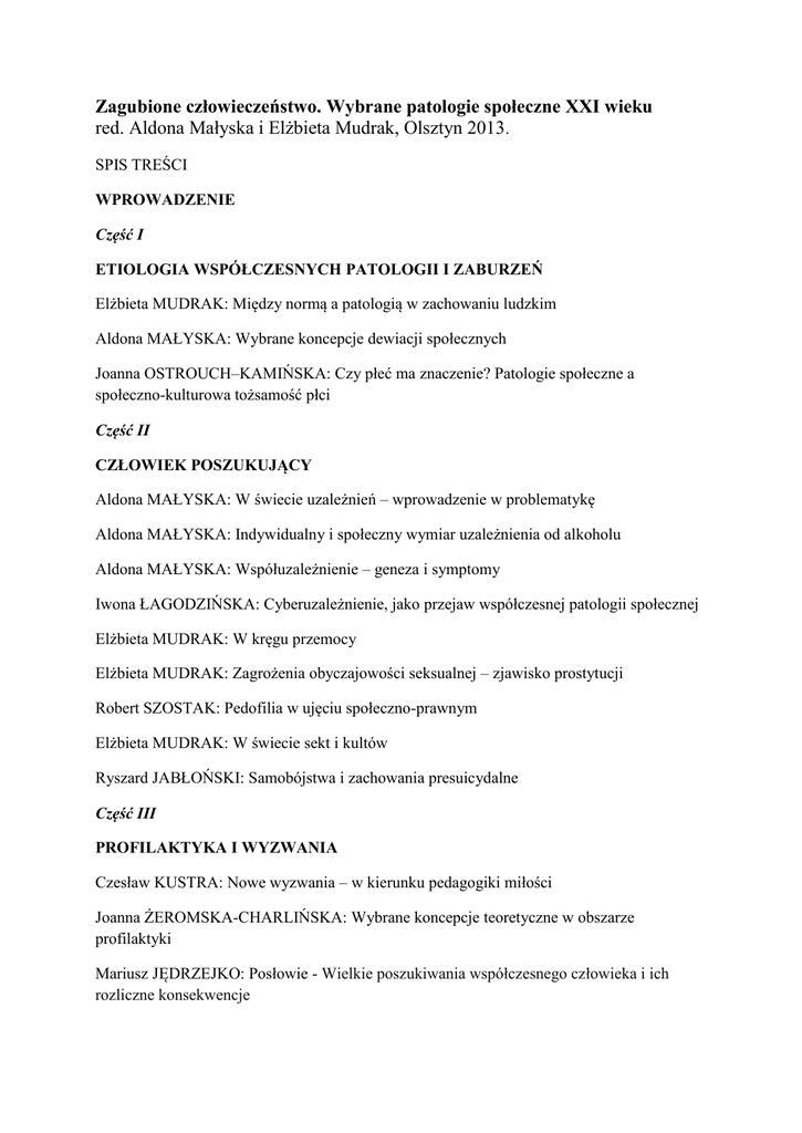 Zagubione człowieczeństwo. Wybrane patologie społeczne XXI wieku red. Aldona Małyska i Elżbieta Mudrak, Olsztyn 2013. SPIS TREŚCI WPROWADZENIE Część I ETIOLOGIA WSPÓŁCZESNYCH PATOLOGII I ZABURZEŃ Elżbieta MUDRAK: Między normą a patologią w zachowaniu ludzkim Aldona MAŁYSKA: Wybrane koncepcje dewiacji społecznych Joanna OSTROUCH–KAMIŃSKA: Czy płeć ma znaczenie? Patologie społeczne a społeczno-kulturowa tożsamość płci Część II CZŁOWIEK POSZUKUJĄCY Aldona MAŁYSKA: W świecie uzależnień – wprowadzenie w problematykę Aldona MAŁYSKA: Indywidualny i społeczny wymiar uzależnienia od alkoholu Aldona MAŁYSKA: Współuzależnienie – geneza i symptomy Iwona ŁAGODZIŃSKA: Cyberuzależnienie, jako przejaw współczesnej patologii społecznej Elżbieta MUDRAK: W kręgu przemocy Elżbieta MUDRAK: Zagrożenia obyczajowości seksualnej – zjawisko prostytucji Robert SZOSTAK: Pedofilia w ujęciu społeczno-prawnym Elżbieta MUDRAK: W świecie sekt i kultów Ryszard JABŁOŃSKI: Samobójstwa i zachowania presuicydalne Część III PROFILAKTYKA I WYZWANIA Czesław KUSTRA: Nowe wyzwania – w kierunku pedagogiki miłości Joanna ŻEROMSKA-CHARLIŃSKA: Wybrane koncepcje teoretyczne w obszarze profilaktyki Mariusz JĘDRZEJKO: Posłowie - Wielkie poszukiwania współczesnego człowieka i ich rozliczne konsekwencje