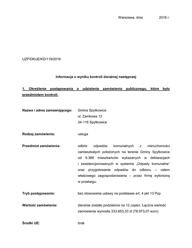 Warszawa, dnia 2016 r. UZP/DKUE/KD/119/2016 Informacja o wyniku kontroli doraźnej następczej 1. Określenie postępowania o udzielenie zamówienia publicznego, które było przedmiotem kontroli. Nazwa i adres zamawiającego: Gmina Spytkowice ul. Zamkowa 12 34-116 Spytkowice Rodzaj zamówienia: usługa Przedmiot zamówienia: odbiór odpadów komunalnych z nieruchomości zamieszkałych położonych na terenie Gminy Spytkowice od 9.366 mieszkańców wykazanych w deklaracjach i zewidencjonowanych w systemie „Odpady komunalne” oraz przygotowanie odpadów do odbioru – celem właściwego zagospodarowania – przez firmę wyłonioną w przetargu. Tryb postępowania: bez stosowania ustawy na podstawie art. 4 pkt 13 Pzp Wartość zamówienia: zlecenie zostało podzielone na 12 części. Łączna wartość zamówienia wynosiła 333.653,33 zł (78.973,07 euro) Środki UE: brak A. Opis i kwalifikacja prawna naruszeń: Gmina Spytkowice powierzyła Z. wykonanie usługi polegającej na odbiorze odpadów komunalnych od 9 633 właścicieli nieruchomości, na których zamieszkują mieszkańcy, wykazanych w deklaracjach i zewidencjonowanych w systemie „Odpady komunalne”. Powierzenie zadania nastąpiło w formie cyklicznych zleceń z dni: 02.01.2014 r., 03.02.2014 r., 03.03.2014 r., 01.04.2014 r., 05.05.2014 r., 02.06.2014 r., 01.07.2014 r., 01.08.2014r., 01.09.2014 r., 06.10.2014 r., 03.11.2014 r., 01.12.2014 r. Zlecenia były udzielane przez Urząd Gminy w Spytkowicach, reprezentowany przez X na rzecz zleceniobiorcy Z. Zleceniobiorca jest samorządowym zakładem budżetowym utworzonym przez Radę Gminy Spytkowice uchwałą z dnia 08.11.2010 r. (Uchwała nr XLV/328/10) na podstawie art. 18 ust. 2 pkt 9 lit h ustawy z dnia 8 marca 1990 r. o samorządzie gminnym (Dz.U. z 2001 nr 142, poz. 1591 ze zm.) art. 6 ustawy z dnia 20.12. 1996 r. o gospodarce komunalnej (Dz. U. z 1997 r. nr 9, poz. 43 ze zm.) oraz na podstawie art. 16 ust. 1 i 2 ustawy z dnia 27.08.2009 r. o finansach publicznych (Dz.U. z 2009 nr 157, poz. 1240). ZUK w Spytkowicach, jako samorządowy zakład budżetowy jest jednostką organizacyjną nie posiadającą osobowości prawnej. W ww. zleceniach wykazano, iż Urząd Gminy w Spytkowicach „zleca wykonanie usługi polegającej na odbiorze odpadów komunalnych z nieruchomości zamieszkałych położonych na terenie Gminy Spytkowice od 9 366 mieszkańców wykazanych w deklaracjach i zewidencjonowanych w systemie „Odpady komunalne””. Łączna wartość ww. zleceń wynosiła 333.653,33 zł. Na wstępie należy wskazać, iż zgodnie z art. 4 pkt 13 ustawy Pzp (wg stanu na dzień zlecania powyższych zadań), ustawy nie stosuje się do zamówień udzielanych instytucji gospodarki budżetowej przez organ władzy publicznej wykonujący funkcje organu założycielskiego tej instytucji, jeżeli łącznie są spełnione następujące warunki: a) zasadnicza część działalności instytucji gospodarki budżetowej dotyczy wykonywania zadań publicznych na rzecz tego organu władzy publicznej, b) organ władzy publicznej sprawuje nad instytucją gospodarki budżetowej kontrolę odpowiadającą kontroli sprawowanej nad własnymi jednostkami nieposiadającymi osobowości prawnej, w szczególności polegającą na wpływie na decyzje strategiczne i indywidualne dotyczące zarządzania sprawami instytucji, c) przedmiot zamówienia należy do zakresu działalności podstawowej instytucji gospodarki budżetowej określonego zgodnie z art. 26 ust. 2 pkt 2 ustawy z dnia 27 sierpnia 2009 r. o finansach publicznych (Dz. U. z 2013 r. poz. 885). 2 Definicję instytucji gospodarki budżetowej zawiera art. 23 ust. 1 ustawy o finansach publicznych, zgodnie z którym instytucja gospodarki budżetowej jest jednostką sektora finansów publicznych tworzoną w celu realizacji zadań publicznych, która: 1) odpłatnie wykonuje wyodrębnione zadania; 2) pokrywa koszty swojej działalności oraz zobowiązania z uzyskiwanych przychodów Z art. 23 ust. 2 ww. ustawy wynika, że instytucja gospodarki budżetowej może być tworzona przez ministra lub Szefa Kancelarii Prezesa Rady Ministrów, za zgodą Rady Ministrów, udzieloną na jego wniosek lub organ lub kierownika jednostki, o których mowa w art. 139 ust. 2 ustawy, jako organu wykonującego funkcje organu założycielskiego. W tym kontekście art. 139 ust. 2 ustawy wymienia następujące podmioty: Kancelarię Sejmu, Kancelarię Senatu, Kancelarię Prezydenta Rzeczypospolitej Polskiej, Trybunał Konstytucyjny, Najwyższą Izbę Kontroli, Sąd Najwyższy, Naczelny Sąd Administracyjny wraz z wojewódzkimi sądami administracyjnymi, Krajową Radę Sądownictwa, sądownictwo powszechne, Rzecznika Praw Obywatelskich, Rzecznika Praw Dziecka, Krajową Radę Radiofonii i Telewizji, Generalnego Inspektora Ochrony Danych Osobowych, Instytut Pamięci Narodowej – Komisję Ścigania Zbrodni przeciwko Narodowi Polskiemu, Krajowe Biuro Wyborcze i Państwową Inspekcję Pracy. Powyższe oznacza, że gmina nie stanowi podmiotu uprawnionego do utworzenia instytucji gospodarki budżetowej, a tym samym nie może wykazać w rocznym sprawozdaniu zamówień udzielonych instytucji gospodarki budżetowej. Jednocześnie wskazać jednak należy, iż zamawiający będący jednostką administracji samorządowej ma możliwość powierzenia wykonywania zadań własnych powołanym w tym celu jednostkom organizacyjnym. Zgodnie z art. 9 ust. 3 ustawy z dnia 08.03 1990 r. o samorządzie gminnym, formy prowadzenia gospodarki gminnej, w tym wykonywania przez gminę zadań o charakterze użyteczności publicznej, określa odrębna ustawa, tj. ustawa z dnia 20.12.1996 r. o gospodarce komunalnej, gdzie w art. 2 zostało wskazane, że gospodarka komunalna może być prowadzona przez jednostki samorządu terytorialnego w szczególności w formach samorządowego zakładu budżetowego lub spółek prawa handlowego. Jak już wskazano, utworzenie przez gminę samorządowego zakładu budżetowego w celu