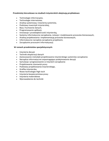 Przedmioty kierunkowe na studiach inżynierskich obejmują przykładowo: Technologie informacyjne, Technologie internetowe, Analizę systemową i inżynierię systemów, Podstawy inwentyki inżynierskiej, Bazy i hurtownie danych, Programowanie aplikacji, Innowacje i przedsiębiorczość inżynierską, Systemy informatyczne zarządzania, notacje i modelowanie procesów biznesowych, Analizę projektowania i implementację procesów biznesowych, Informatyczne narzędzia zarządzania projektami, Zarządzanie procesami informatyzacji. W ramach przedmiotów specjalistycznych: Inżynieria decyzji Techniki eksploracji danych Zastosowanie metodyki projektowania inżynierskiego systemów zarządzania Narzędzia informatyczne wspomagające podejmowanie decyzji Symulacja i prognozowanie w inżynierii zarządzania Projektowanie stanowisk pracy Podstawy projektowania inżynierskiego, Grafika inżynierska, Nowe technologie High-tech Inżynieria bezpieczeństwa pracy Inżynieria materiałowa Wprowadzenie do techniki