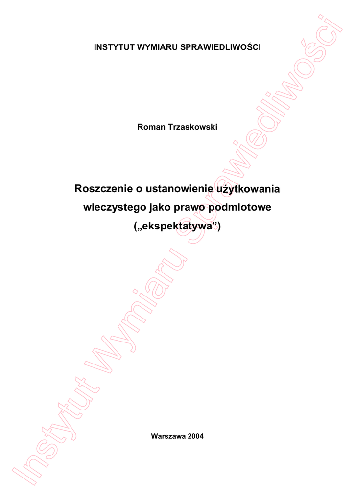 raw Roman Trzaskowski ied ci liw o INSTYTUT WYMIARU SPRAWIEDLIWO CI Roszczenie o ustanowienie u ytkowania Sp wieczystego jako prawo podmiotowe Ins tyt ut W ym i aru ekspektatywa ) Warszawa 2004 ci Spis tre ci Zagadnienia wst pne .......................................................................................... 1 liw o I. 1. Ogólna analiza art. 7 dekretu z dnia 26 pa dziernika 1945 r. o w asno ci i u ytkowaniu gruntów na obszarze m.st. Warszawy ..................................... 1 1.1. Ewolucja uprawnienia............................................................................ 2 ied 1.2 Obowi zek uwzgl dnienia wniosku ....................................................... 3 1.3. Tryb uwzgl dnienia wniosku.................................................................. 5 2. Za o enia opracowania .................................................................................. 5 II. raw 3. Wy czenia z zakresu opracowania ............................................................... 7 Charakter prawny prawa z art. 7 Dekretu .......................................................... 10 1. Doktryna ...................................................................................................... 10 2. Orzecznictwo ............................................................................................... 13 Ins tyt ut W ym i aru Sp 3. Uwagi w asne............................................................................................... 16 ci Zagadnienia wst pne 1. Ogólna analiza art. 7 dekretu z dnia 26 pa dziernika 1945 r. o w asno ci ied i u ytkowaniu gruntów na obszarze m.st. Warszawy liw o I. Na podstawie danych zamieszczonych w pi mie z dnia 24 sierpnia 2004 r. mo na wnosi , e istota w tpliwo ci sprowadza si do tego, czy wskazany podmiot mo e by traktowany jako posiadaj cy ekspektatyw raw u ytkowania wieczystego. w zakresie przyznania mu prawa do Kluczowe znaczenie w ramach wskazanego zagadnienia ma art. 7 dekretu z dnia 26 pa dziernika 1945 r. o w asno ci i u ytkowaniu gruntów na obszarze m.st. Sp Warszawy 1 (dalej: Dekret). Ma on brzmienie nast puj ce: Art. 7. (1) Dotychczasowy w a ciciel gruntu, prawni nast pcy w a ciciela, b d cy w posiadaniu gruntu, lub osoby prawa jego reprezentuj ce, a je eli chodzi o grunty aru oddane na podstawie obowi zuj cych przepisów w zarz d i u ytkowanie u ytkownicy gruntu mog w ci gu 6 miesi cy od dnia obj cia w posiadanie gruntu przez gmin zg osi wniosek o przyznanie na tym gruncie jego dotychczasowemu w a cicielowi prawa wieczystej dzier awy z czynszem symbolicznym lub prawa ym i zabudowy za op at symboliczn . (2) Gmina uwzgl dni wniosek, je eli korzystanie z gruntu przez dotychczasowego w a ciciela da si pogodzi z przeznaczeniem gruntu wed ug planu zabudowania, ut W a je eli chodzi o osoby prawne - ponadto, gdy u ytkowanie gruntu zgodnie z jego przeznaczeniem w my l planu zabudowania nie pozostaje w sprzeczno ci z zadaniami ustawowymi lub statutowymi tej osoby prawnej. (3) W razie uwzgl dnienia wniosku gmina ustali, czy przekazanie gruntu nast pi tytu em wieczystej dzier awy, czy na prawie zabudowy, oraz okre li warunki, pod Ins tyt którymi umowa mo e by zawarta. 1 Dz.U. Nr 50, poz. 279. ci (4) W przypadku nieuwzgl dnienia wniosku, gmina zaofiaruje uprawnionemu, posiadania zapasu gruntów - na tych samych warunkach dzier aw liw o w miar wieczyst gruntu równej warto ci u ytkowej, b d prawo zabudowy na takim gruncie. (5) W razie niezg oszenia wniosku, przewidzianego w ust. (1), lub nieprzyznania z jakichkolwiek innych przyczyn dotychczasowemu w a cicielowi w my l art. 9 . Ewolucja uprawnienia raw 1.1. odszkodowanie ied dzier awy albo prawa zabudowy, gmina obowi zana jest ui ci wieczystej Na podstawie art. 7 ust. 1 dekretu dotychczasowy w a ciciel gruntu, ew. jego prawni nast pcy, b d cy w posiadaniu gruntu, lub osoby prawa jego reprezentuj ce mogli Sp w ci gu 6 miesi cy od dnia obj cia w posiadanie gruntu przez gmin 2 zg osi wniosek o przyznanie na tym gruncie jego dotychczasowemu w a cicielowi prawa wieczystej dzier awy z czynszem symbolicznym lub prawa zabudowy za op at symboliczn 3 . Nale y nadmieni , e od 1 stycznia 1947 r. prawo wieczystej aru dzier awy i prawo zabudowy zosta y zast pione przez w asno czasow na podstawie art. XXXIX § 1 i 2 przepisów wprowadzaj cych prawo rzeczowe i prawo 2 5 . Z kolei na mocy art. 3 dekretu z 10 grudnia 1952 r. ym i o ksi gach wieczystych 4 Co do trybu zob. ni ej. 3 Czynsz zosta nast pnie okre lony na rycza tow kwot 1000 z za ca y czas trwania umowy - zob. J. Czerwiakowski, Kilka zagadnie wybranych z zakresu gospodarki terenami w Warszawie, Palestra 1961, nr 1, s. 47. 4 Ins tyt ut W S. Cichosz, T. Szaw owski, O w asno ci nieruchomo ci na obszarze m.st. Warszawy, Warszawa 1960, s. 9; zgodnie z § 1 Prawa zabudowy, ustanowione przed wej ciem w ycie prawa rzeczowego na gruntach, nale cych do Skarbu Pa stwa, zwi zków samorz du terytorialnego lub innych osób prawnych prawa publicznego, mog by zmienione przez umow na w asno czasow , przewidzian w prawie rzeczowym. Dotyczy to równie dzier awy wieczystej w rozumieniu dekretu z dnia 26 pa dziernika 1945 r. o w asno ci i u ytkowaniu gruntów na obszarze m.st. Warszawy (Dz.U. R.P. Nr 50, poz. 279), który pozostaje w mocy . W my l za § 2 Przez przyznanie prawa zabudowy lub prawa dzier awy wieczystej w rozumieniu dekretu o w asno ci i u ytkowaniu gruntów na obszarze m.st. Warszawy nale y od dnia wej cia w ycie prawa rzeczowego rozumie przeniesienie w asno ci gruntu za op at symboliczn z zastrze eniem powrotu w asno ci na rzecz gminy m.st. Warszawy, stosownie do przepisów prawa rzeczowego. 5 Prawo zabudowy i dzier awa wieczysta nie mia a zreszt adnego znaczenia prawnego, gdy przez 1 stycznia 1947 r. w adze miejskie nie rozpatrywa y wniosków dotychczasowych w a cicieli i nie przyznawa y im ww. praw - J. Czerwiakowski, Gospodarka terenami w miastach i osiedlach, Palestra 1961, nr 10, s. 48. 2 ci o odst powaniu przez Pa stwo nieruch