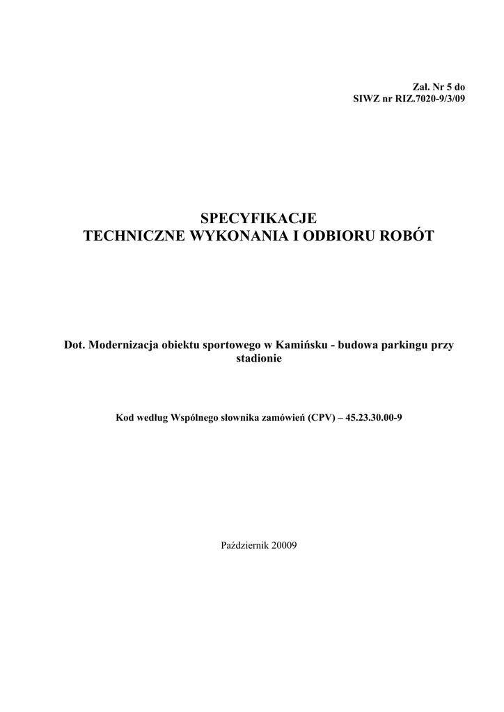 Zał. Nr 5 do SIWZ nr RIZ.7020-9/3/09 SPECYFIKACJE TECHNICZNE WYKONANIA I ODBIORU ROBÓT Dot. Modernizacja obiektu sportowego w Kamińsku - budowa parkingu przy stadionie Kod według Wspólnego słownika zamówień (CPV) – 45.23.30.00-9 Październik 20009 SZCZEGÓŁOWA SPECYFIKACJA TECHNICZNA POWIERZCHNIE UTWARDZONE Z BRUKOWEJ KOSTKI BETONOWEJ ( chodniki, dojścia, place ) l. WSTĘP 1.1. Przedmiot SST Przedmiotem niniejszej szczegółowej specyfikacji technicznej (SST) są wymagania dotyczące wykonania i odbioru robót związanych z wykonaniem parkingu przy stadionie z brukowej kostki betonowej przy ulicy XXX-lecia PRL w Kamińsku w ramach modernizacji obiektu sportowego w zakresie sposobu wykonania robót, właściwości wyrobów budowlanych oraz oceny prawidłowości poszczególnych robót. 1.2. Zakres stosowania SST Specyfikacja Techniczna jest stosowana jako dokument w postępowaniu przetargowym i przy realizacji umowy na wykonanie robót związanych z realizacja zadania wymienionego w punkcie 1.1. 1.3. Zakres robót objętych SST Ustalenia zawarte w niniejszej specyfikacji dotyczą zasad prowadzenia robót związanych z wykonaniem parkingu na terenie gminy Górowo Iławeckie. 1.4. Określenia podstawowe 1.4.1. Betonowa kostka brukowa - kształtka wytwarzana z betonu metodą wibroprasowania. Produkowana jest jako kształtka jednowarstwowa lub w dwóch warstwach połączonych ze sobą trwale w fazie produkcji. 1.4.2. Pozostałe określenia podstawowe są zgodne z obowiązującymi, odpowiednimi polskimi normami i z definicjami. 2. MATERIAŁY. 2.1. Betonowa kostka brukowa - wymagania 2.1. l. Aprobata techniczna Warunkiem dopuszczenia do stosowania betonowej kostki brukowej w budownictwie drogowym jest posiadanie aprobaty technicznej, wydanej przez uprawniona jednostkę. 2.1.2. Wygląd zewnętrzny Struktura wyrobu powinna być zwarta, bez rys, pęknięć, plam i ubytków. Powierzchnia górna kostek powinna być równa i szorstka, a krawędzie kostek betonowych równe i proste, wklęśnięcia nie powinny przekraczać 2 mm. 2.1.3. Kształt, wymiary i kolor kostki brukowej Do wykonania nawierzchni chodnika stosuje sie betonowa kostkę brukowa o grubości 60mm i 80mm, kolory wg projektu lub po ustaleniu z zamawiającym. Tolerancje wymiarowe wynoszą: - na długości ± 3 mm, - na szerokości ± 3 mm, - na grubości ± 5 mm. 3. SPRZĘT 3.1. Sprzętu do wykonania chodnika z kostki brukowej Małe powierzchnie chodnika z kostki brukowej wykonuje się ręcznie. Jeśli powierzchnie są duŜe, a kostki brukowe maja jednolity kolor i kształt, moŜna stosować mechaniczne urządzenia układające. Urządzenie składa się z wózka i chwytaka sterowanego hydraulicznie, słuŜącego do przenoszenia z palety warstwy kostek na miejsce ich ułoŜenia. Do zagęszczenia nawierzchni stosuje się wibratory płytowe z osłona z tworzywa sztucznego. 4. TRANSPORT 4.1. Transport betonowych kostek brukowych Uformowane w czasie produkcji kostki betonowe układane są warstwowo na palecie. Po uzyskaniu wytrzymałości betonu min 0,7 wytrzymałości projektowanej, kostki przewoŜone są na stanowisko, gdzie specjalne urządzenie pakuje je w folie i spina taśmą stalową, co gwarantuje transport samochodami w nienaruszonym stanie. Kostki betonowe moŜna równieŜ przewozić samochodami na paletach transportowych producenta. 5. WYKONANIE ROBÓT 5.1. Koryto pod chodnik Koryto wykonane w podłoŜu powinno być wyprofilowane zgodnie z projektowanymi spadkami podłuŜnymi i poprzecznymi chodnika. Wskaźnik zagęszczenia koryta nie moŜe być mniejszy od 0,97 według normalnej metody Proctora. Dokumentacja ( przedmiar robót ) określa zakres oraz niezbędny materiał do wykonania robót w uprzednio wykonanym korycie. 5.2. Podbudowa pod parking Wykonać zgodnie z załoŜeniami tj. podbudowa gr 25 cm po zagęszczeniu lub przedmiarem robót. 5.3. Podsypka cementowo-piaskowa Do wykonania podsypki cementowo-piaskowej naleŜy stosować piasek odpowiadający wymaganiom PN-B-06712. Grubość podsypki po zagęszczeniu powinna zawierać się w granicach od 3 do 5cm. Podsypka powinna być zwilŜona wodą, zagęszczona i wyprofilowana. 5.4. Układanie nawierzchni z betonowych kostek brukowych Kostki naleŜy układać według wzoru ustalonego w dokumentacji projektowej lub zaakceptowanego przez Inspektora Nadzoru. Kostkę układa się na podsypce cementowo-piaskowej na podłoŜu z kruszywa naturalnego w taki sposób, aby szczeliny miedzy kostkami wynosiły od 2 do 3 mm. Kostkę naleŜy układać ok. 1,5 cm wyŜej od projektowanej niwelety, gdyŜ w czasie wibrowania (ubijania) podsypka ulega zagęszczeniu. Po ułoŜeniu kostki, szczeliny naleŜy wypełnić piaskiem, a następnie zamieść powierzchnie ułoŜonych kostek przy uŜyciu szczotek ręcznych lub mechanicznych i przystąpić do ubijania nawierzchni parkingu. Do ubijania ułoŜonej nawierzchni z kostek brukowych, stosuje się wibratory płytowe z osłoną z tworzywa sztucznego dla ochrony kostek przed uszkodzeniem i zabrudzeniem. Wibrowanie naleŜy prowadzić od krawędzi powierzchni ubijanej w kierunku środka i jednocześnie w kierunku poprzecznym kształtek. Do zagęszczania nawierzchni z betonowych kostek brukowych nie wolno uŜywać walca. Po ubiciu nawierzchni naleŜy uzupełnić szczeliny materiałem do wypełnienia i zamieść nawierzchnie. Parking z wypełnieniem spoin piaskiem nie wymaga pielęgnacji – moŜe być zaraz oddany do uŜytkowania. 6. KONTROLA JAKOŚCI ROBÓT. 6.1. Badania przed przystąpieniem do robót Przed przystąpieniem do robót Wykonawca powinien sprawdzić, czy producent kostek brukowych posiada aprobatę techniczną. 6.2. Badania w czasie robót 6.2.1. Sprawdzenie podłoŜa Sprawdzenie podłoŜa polega na stwierdzeniu zgodności z dokumentacja projektową i odpowiednimi SST. Dopuszczalne tolerancje wynoszą dla: - głębokości koryta: - o szerokości do 3 m: ± l cm, - o szerokości powyŜej 3 m: ± 2 cm, - szerokości koryta: ± 5 cm. Nale
