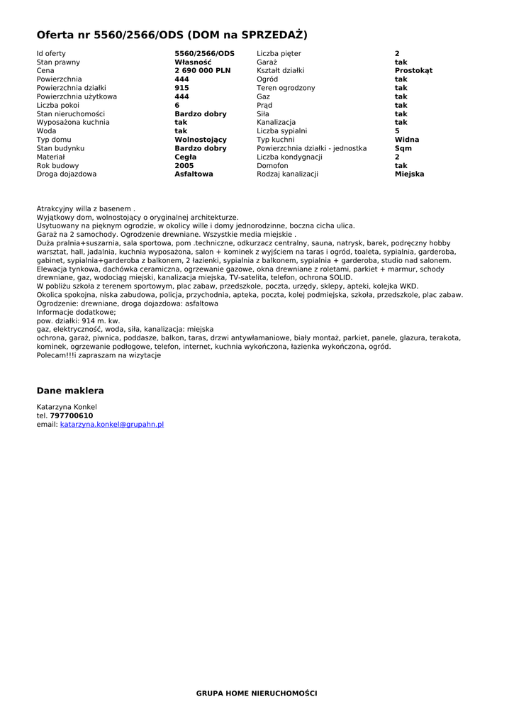 Oferta nr 5560/2566/ODS (DOM na SPRZEDAŻ) Id oferty Stan prawny Cena Powierzchnia Powierzchnia działki Powierzchnia użytkowa Liczba pokoi Stan nieruchomości Wyposażona kuchnia Woda Typ domu Stan budynku Materiał Rok budowy Droga dojazdowa 5560/2566/ODS Własność 2 690 000 PLN 444 915 444 6 Bardzo dobry tak tak Wolnostojący Bardzo dobry Cegła 2005 Asfaltowa Liczba pięter Garaż Kształt działki Ogród Teren ogrodzony Gaz Prąd Siła Kanalizacja Liczba sypialni Typ kuchni Powierzchnia działki - jednostka Liczba kondygnacji Domofon Rodzaj kanalizacji 2 tak Prostokąt tak tak tak tak tak tak 5 Widna Sqm 2 tak Miejska Atrakcyjny willa z basenem . Wyjątkowy dom, wolnostojący o oryginalnej architekturze. Usytuowany na pięknym ogrodzie, w okolicy wille i domy jednorodzinne, boczna cicha ulica. Garaż na 2 samochody. Ogrodzenie drewniane. Wszystkie media miejskie . Duża pralnia+suszarnia, sala sportowa, pom .techniczne, odkurzacz centralny, sauna, natrysk, barek, podręczny hobby warsztat, hall, jadalnia, kuchnia wyposażona, salon + kominek z wyjściem na taras i ogród, toaleta, sypialnia, garderoba, gabinet, sypialnia+garderoba z balkonem, 2 łazienki, sypialnia z balkonem, sypialnia + garderoba, studio nad salonem. Elewacja tynkowa, dachówka ceramiczna, ogrzewanie gazowe, okna drewniane z roletami, parkiet + marmur, schody drewniane, gaz, wodociąg miejski, kanalizacja miejska, TV-satelita, telefon, ochrona SOLID. W pobliżu szkoła z terenem sportowym, plac zabaw, przedszkole, poczta, urzędy, sklepy, apteki, kolejka WKD. Okolica spokojna, niska zabudowa, policja, przychodnia, apteka, poczta, kolej podmiejska, szkoła, przedszkole, plac zabaw. Ogrodzenie: drewniane, droga dojazdowa: asfaltowa Informacje dodatkowe; pow. działki: 914 m. kw. gaz, elektryczność, woda, siła, kanalizacja: miejska ochrona, garaż, piwnica, poddasze, balkon, taras, drzwi antywłamaniowe, biały montaż, parkiet, panele, glazura, terakota, kominek, ogrzewanie podłogowe, telefon, internet, kuchnia wykończona, łazienka wykończona, ogród. Polecam!!!i zapraszam na wizytacje Dane maklera Katarzyna Konkel tel. 797700610 email: [email protected] GRUPA HOME NIERUCHOMOŚCI Powered by TCPDF (www.tcpdf.org)
